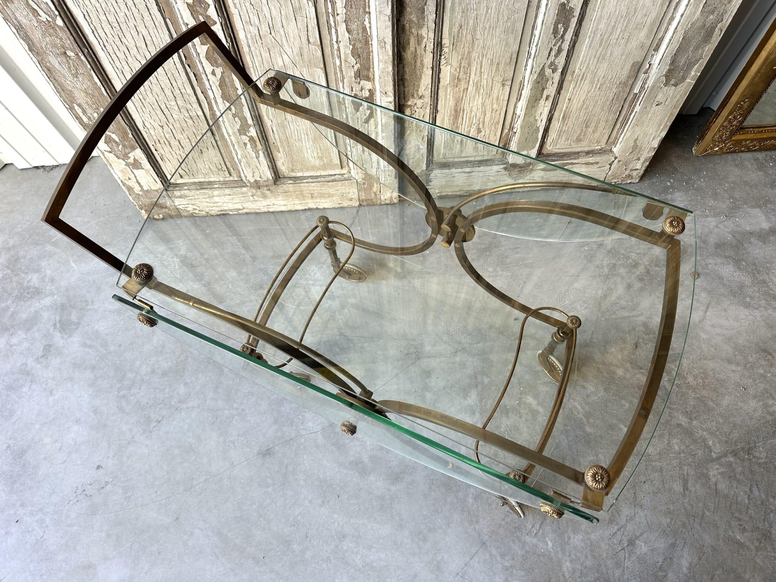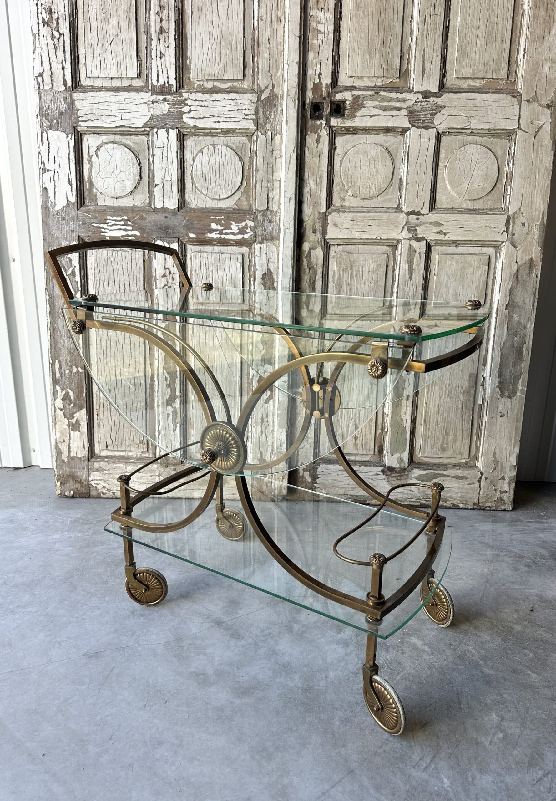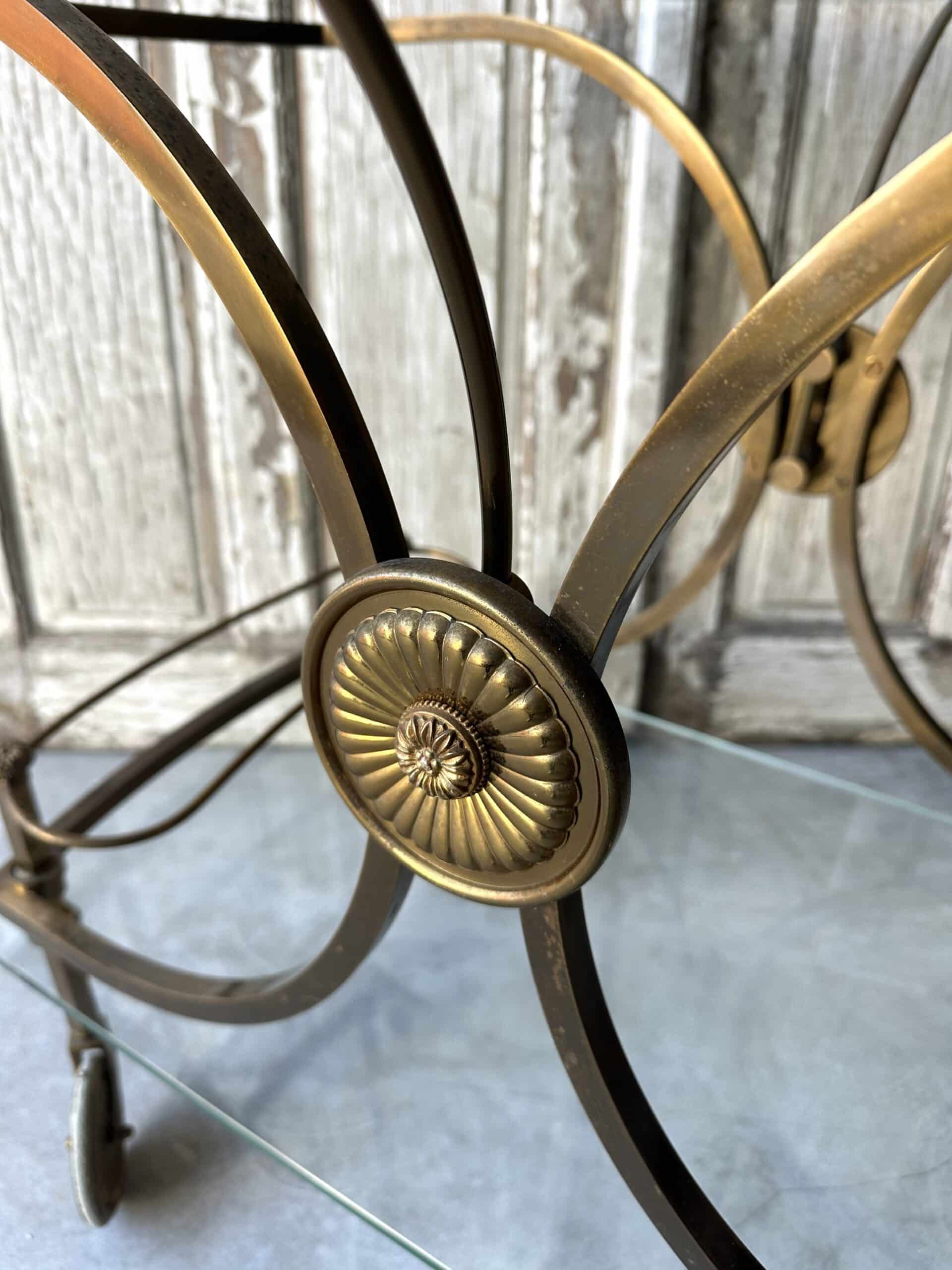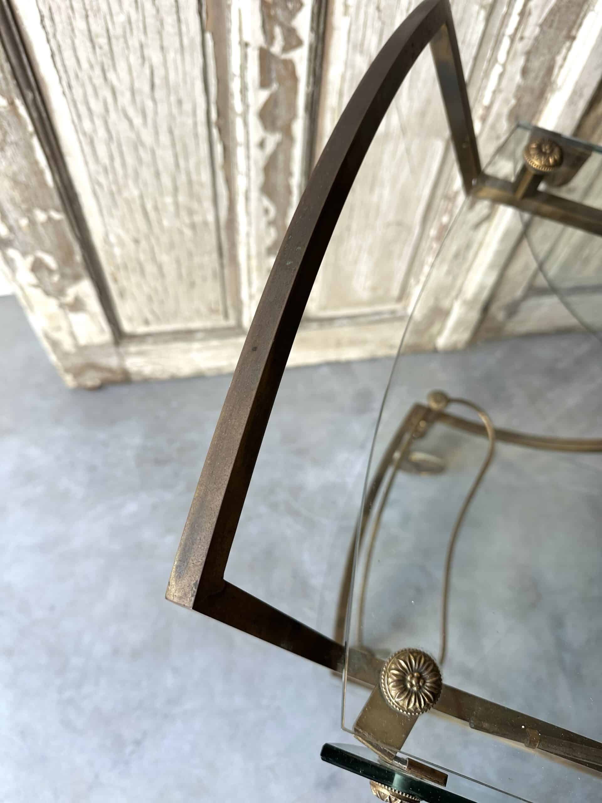 Desserte bar roulant en bronze et laiton attribuée à Maison BAGUES. Plateau à bascule sur les cotés et compartiment à bouteilles en bas. Le caoutchouc des roues est usé, un petit éclat sur un plateau voir photos, patine du temps sur la structure avec des usures.