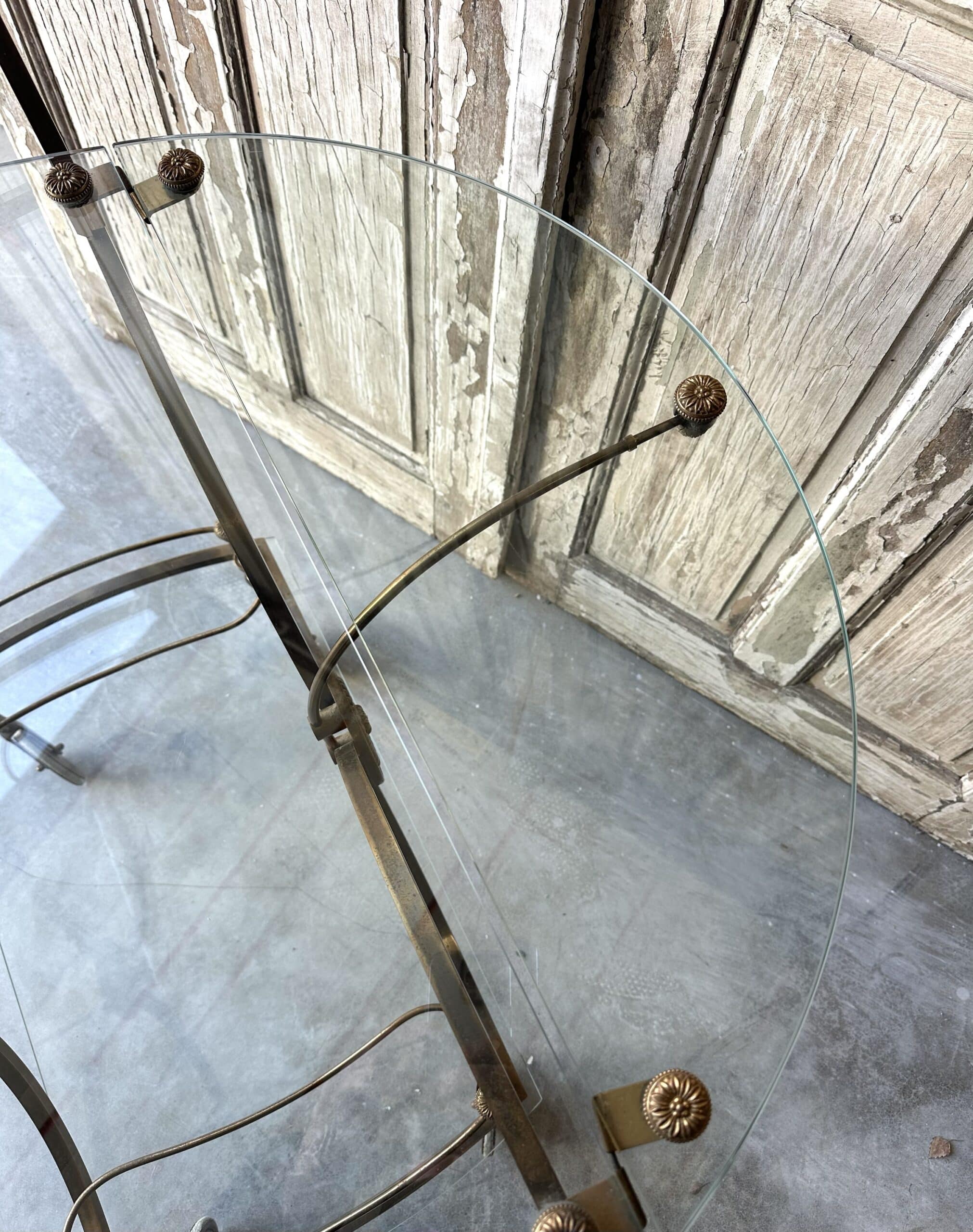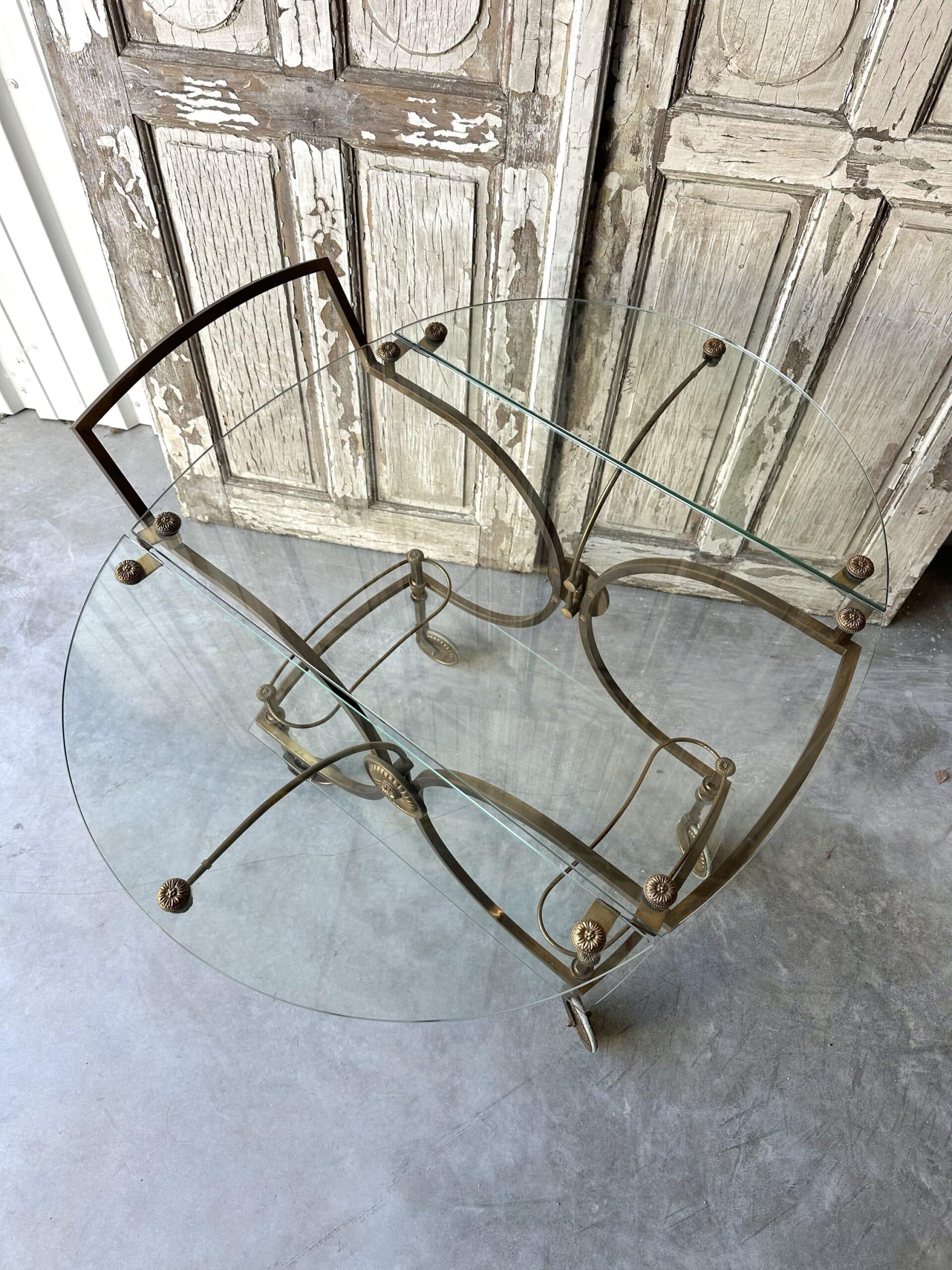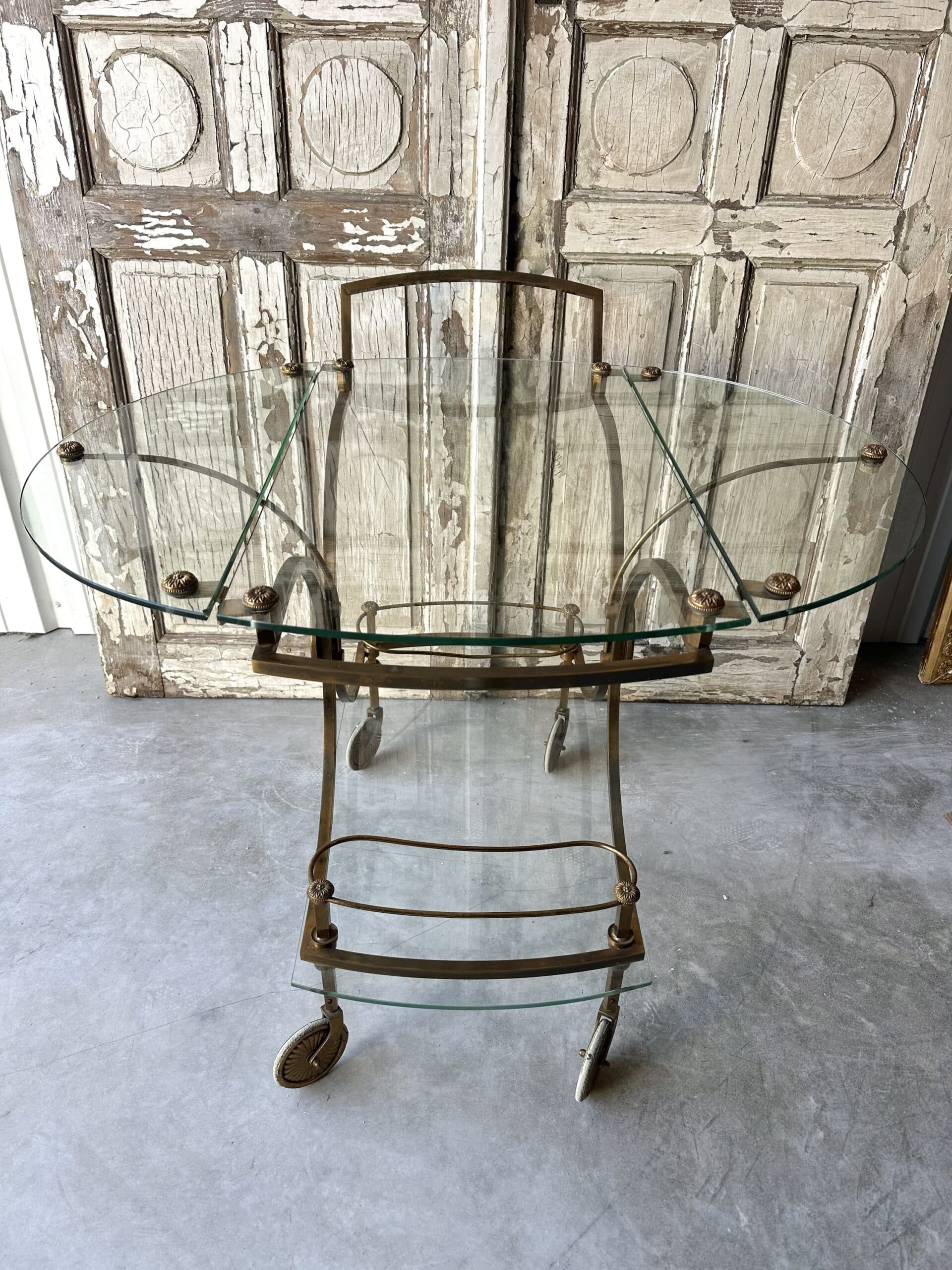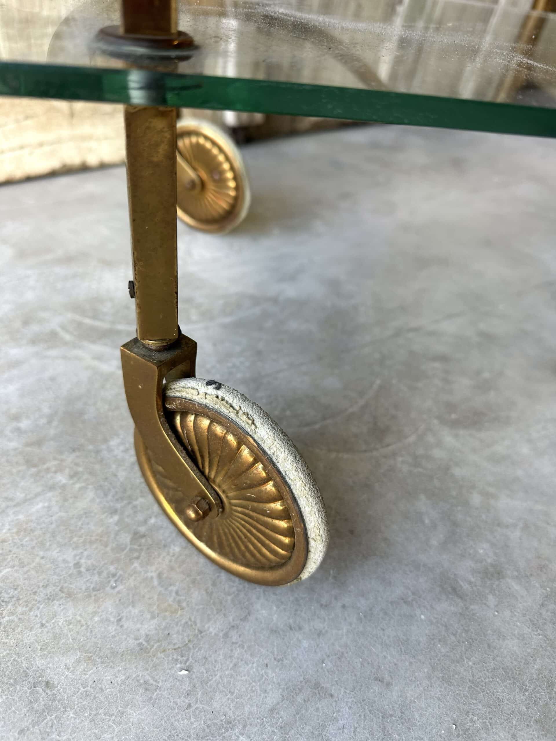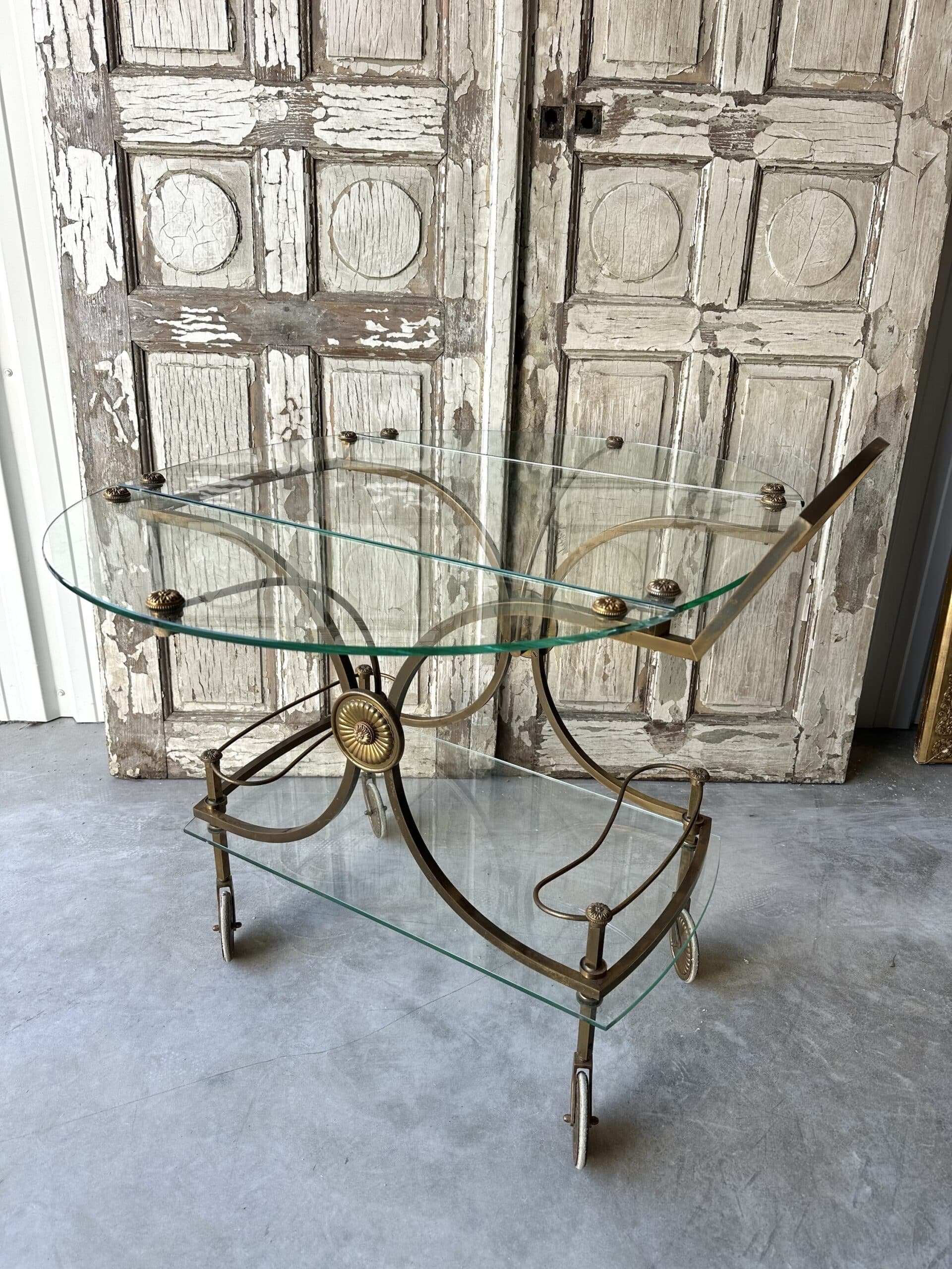 Desserte bar roulant en bronze et laiton attribuée à Maison BAGUES. Plateau à bascule sur les cotés et compartiment à bouteilles en bas. Le caoutchouc des roues est usé, un petit éclat sur un plateau voir photos, patine du temps sur la structure avec des usures.