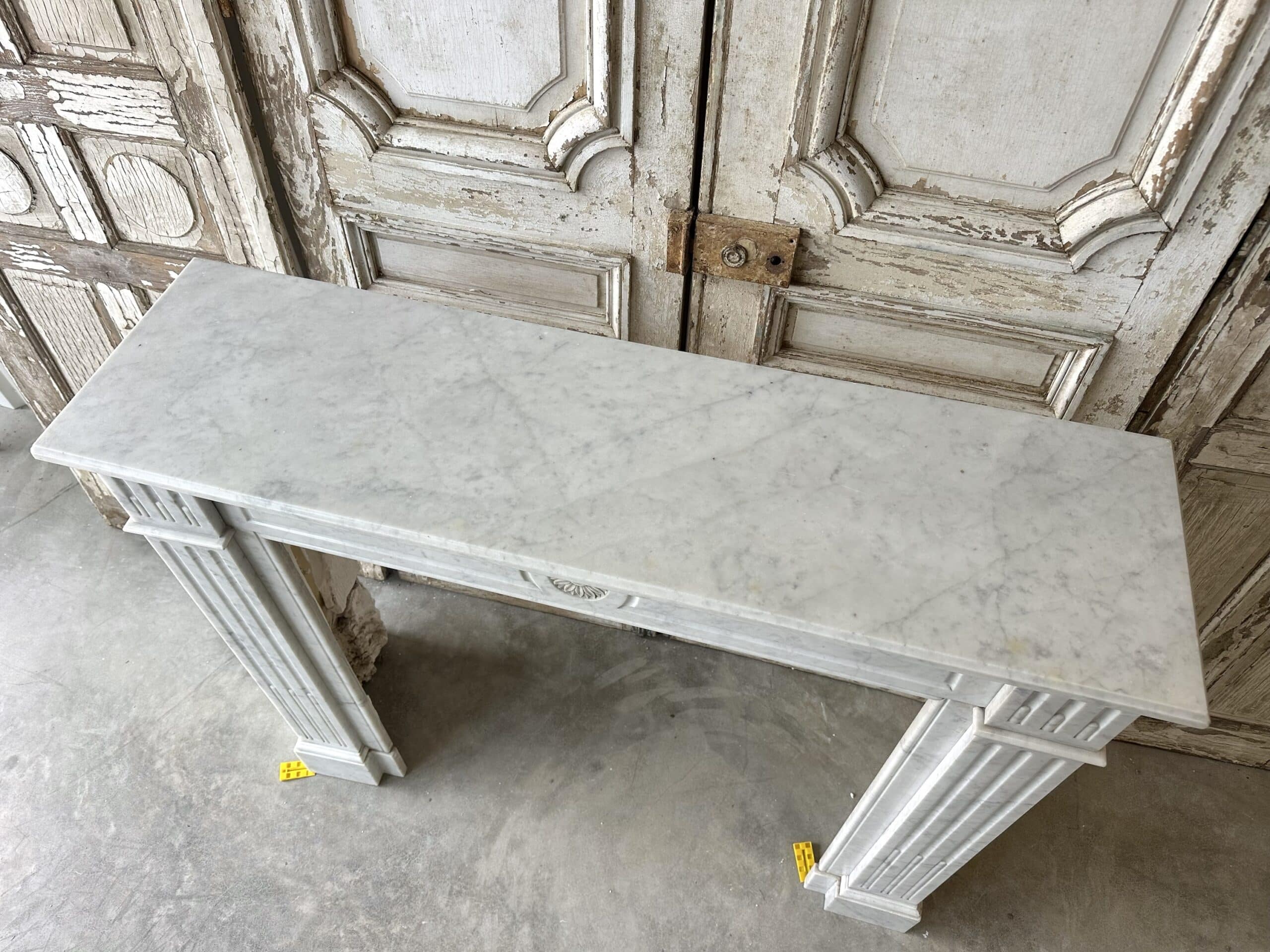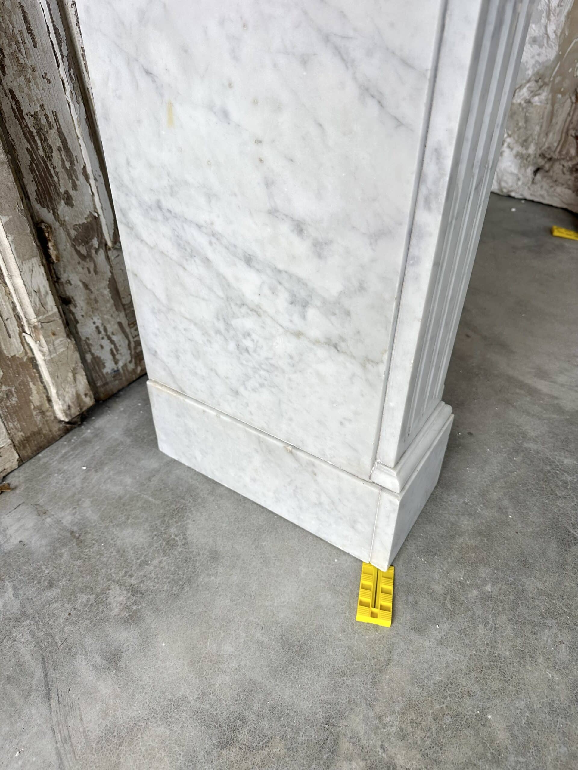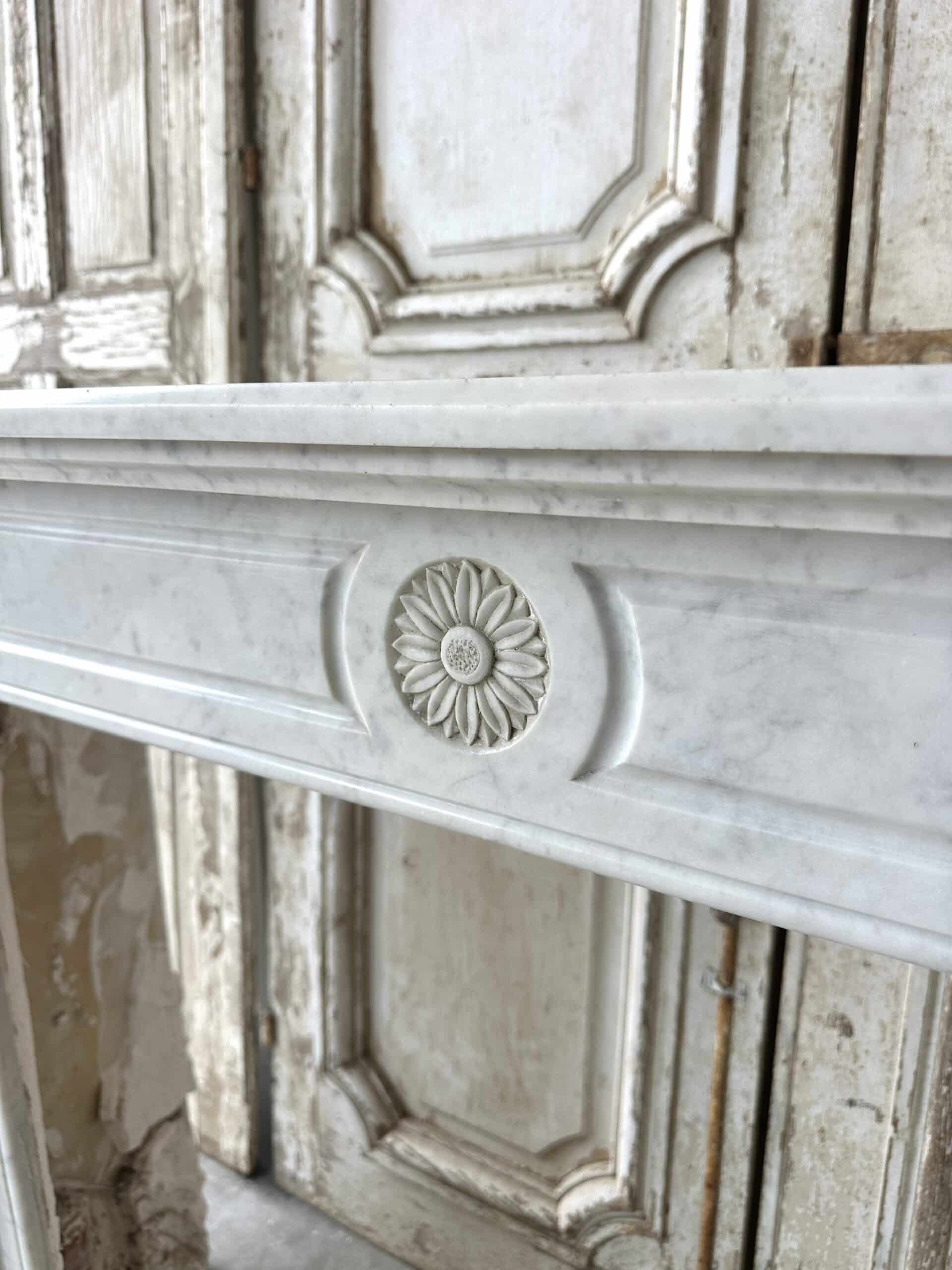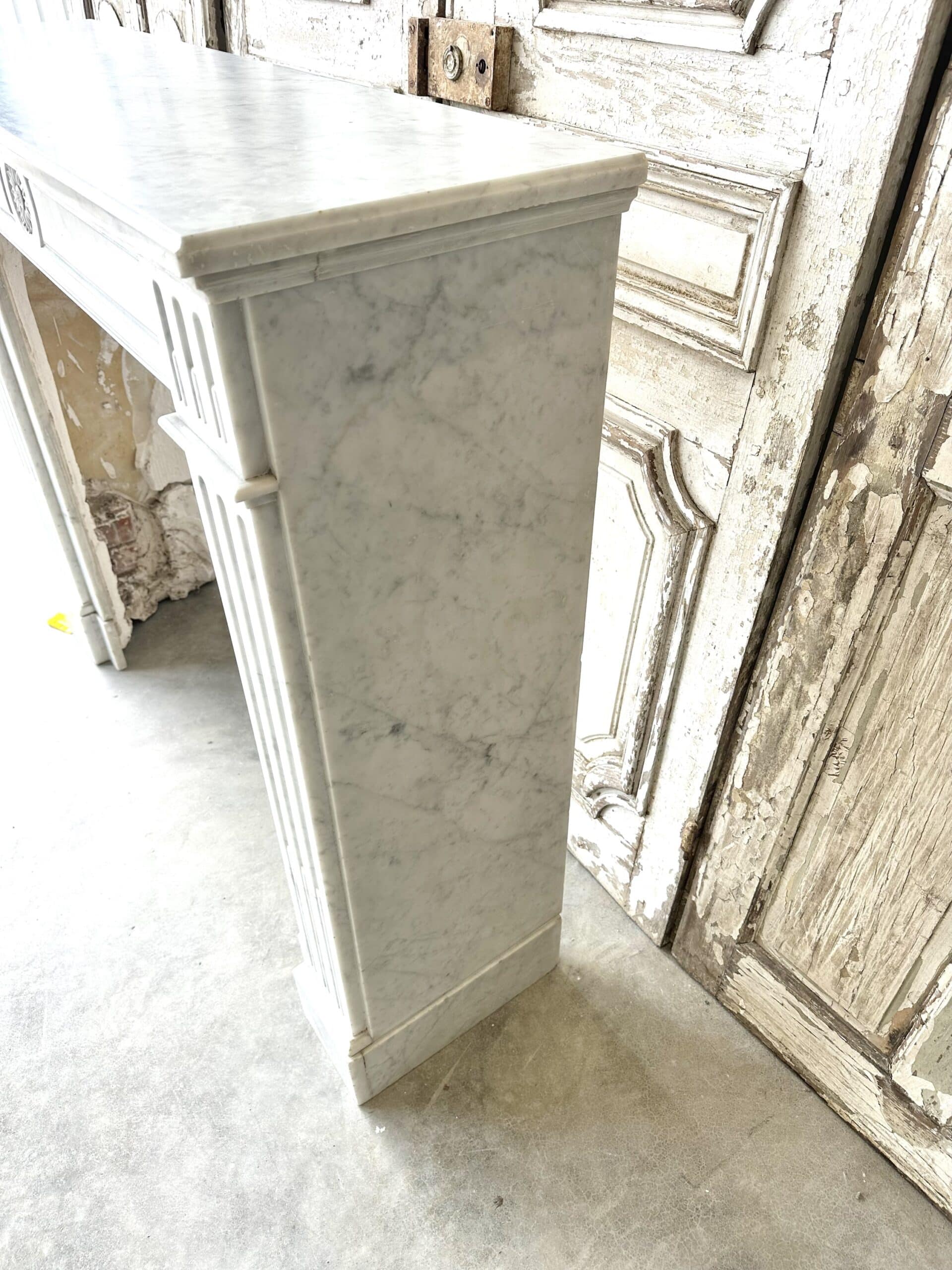 Cheminée de style Louis XVI en marbre blanc de carrare époque fin du 19e siècle. Le linteau est sculpté d’une rosace au centre et d’une moulure décreuses de chaque côté. Jambages avec des cannelures rudentées, plateau avec sa sous tablette.