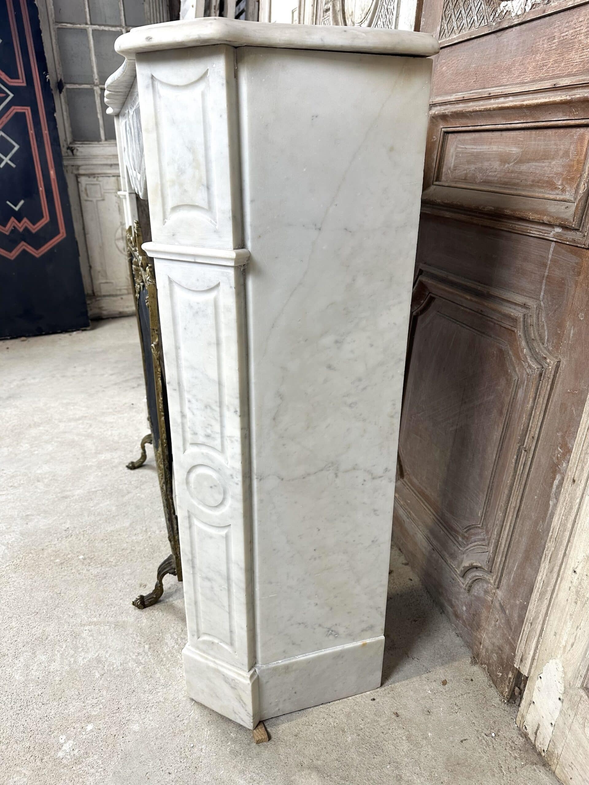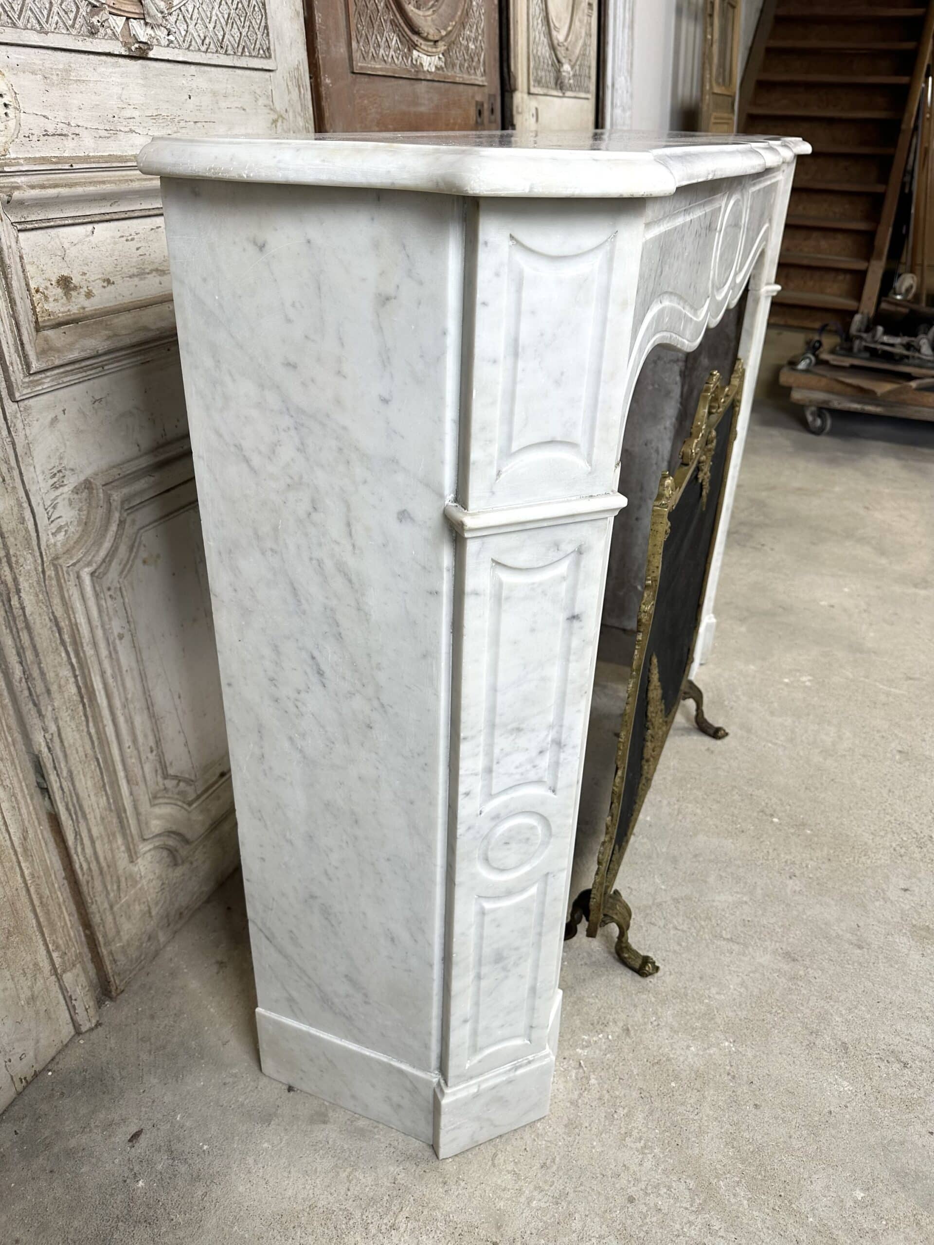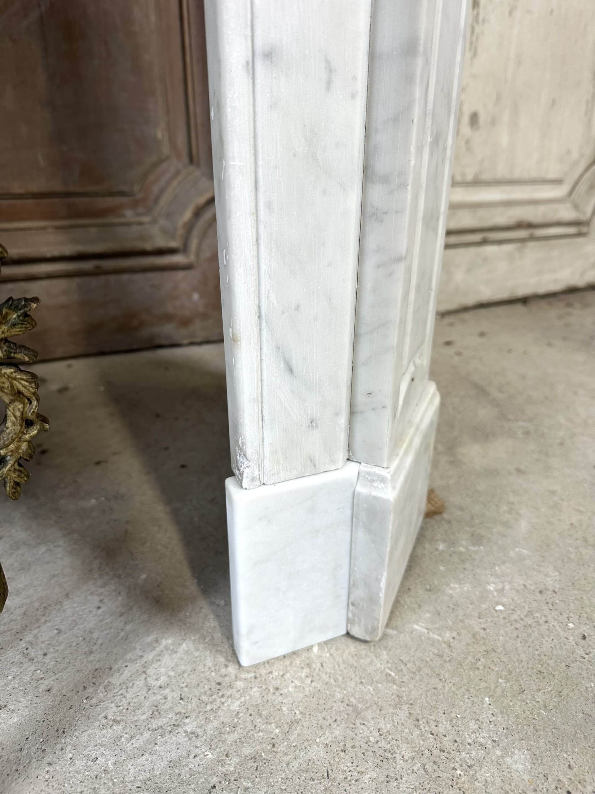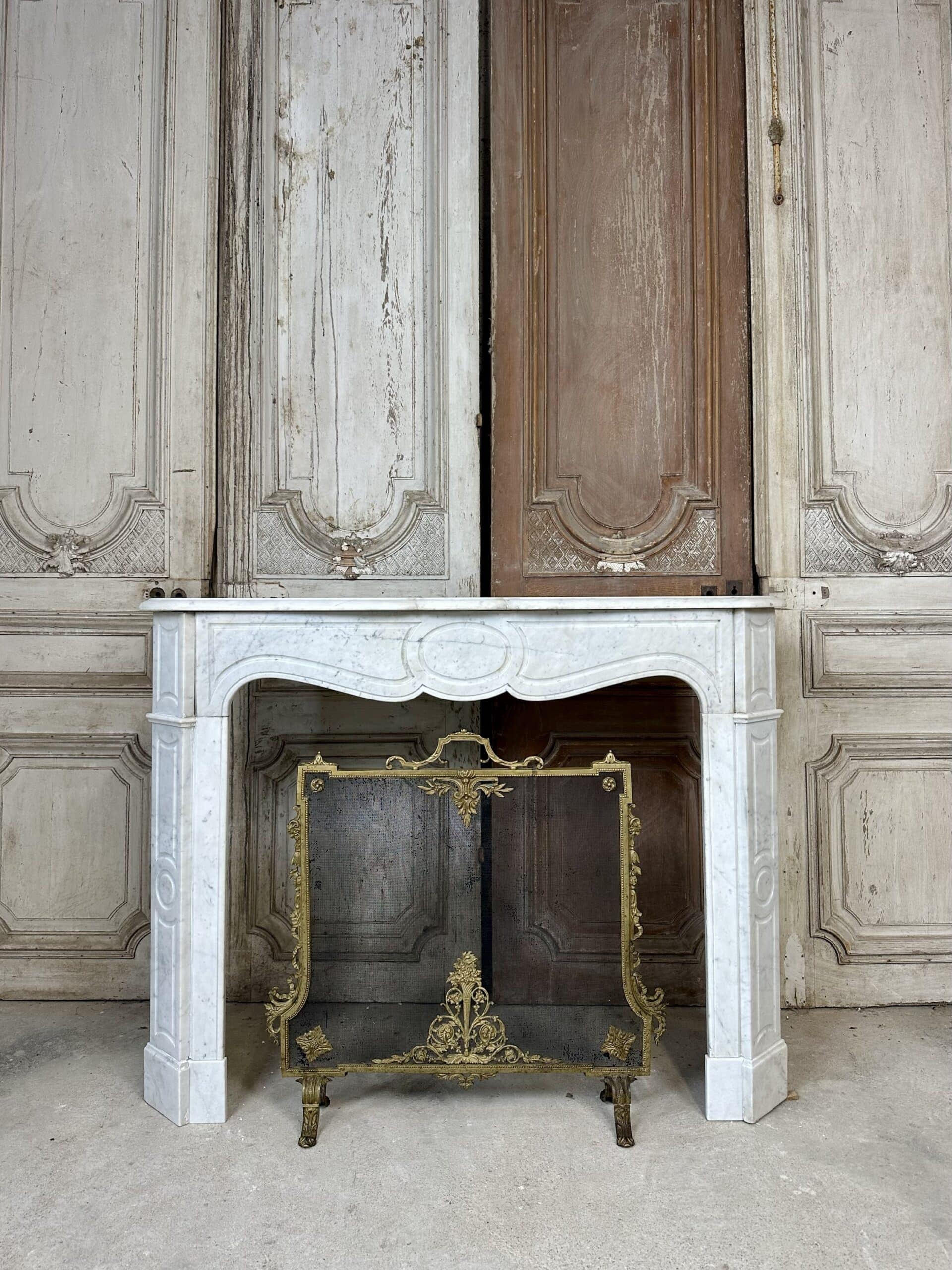 Cheminée plate de style Louis XV circa 1900. Jambages et linteau décreusés, plateau à bec de corbin d’une simple épaisseur.