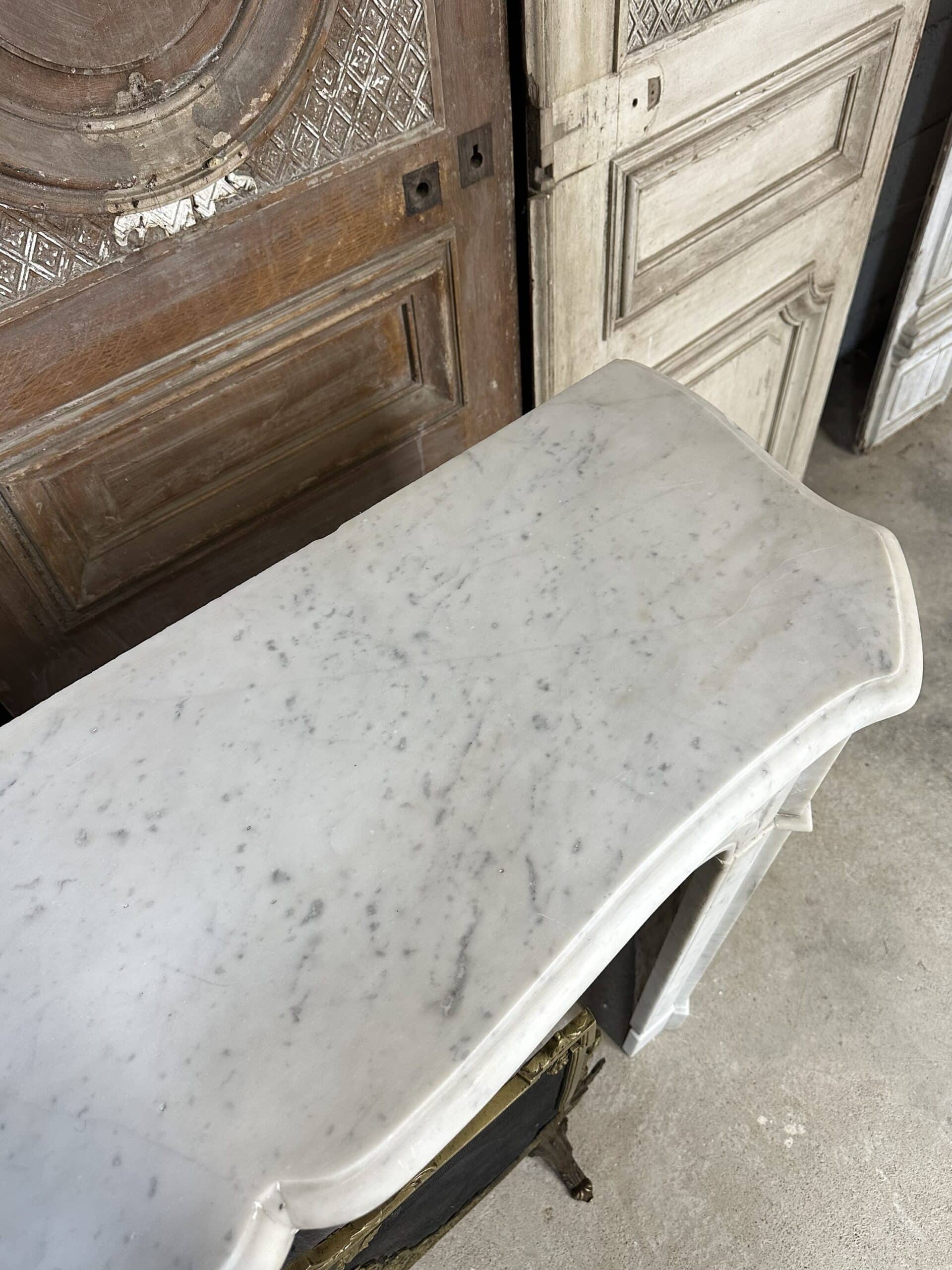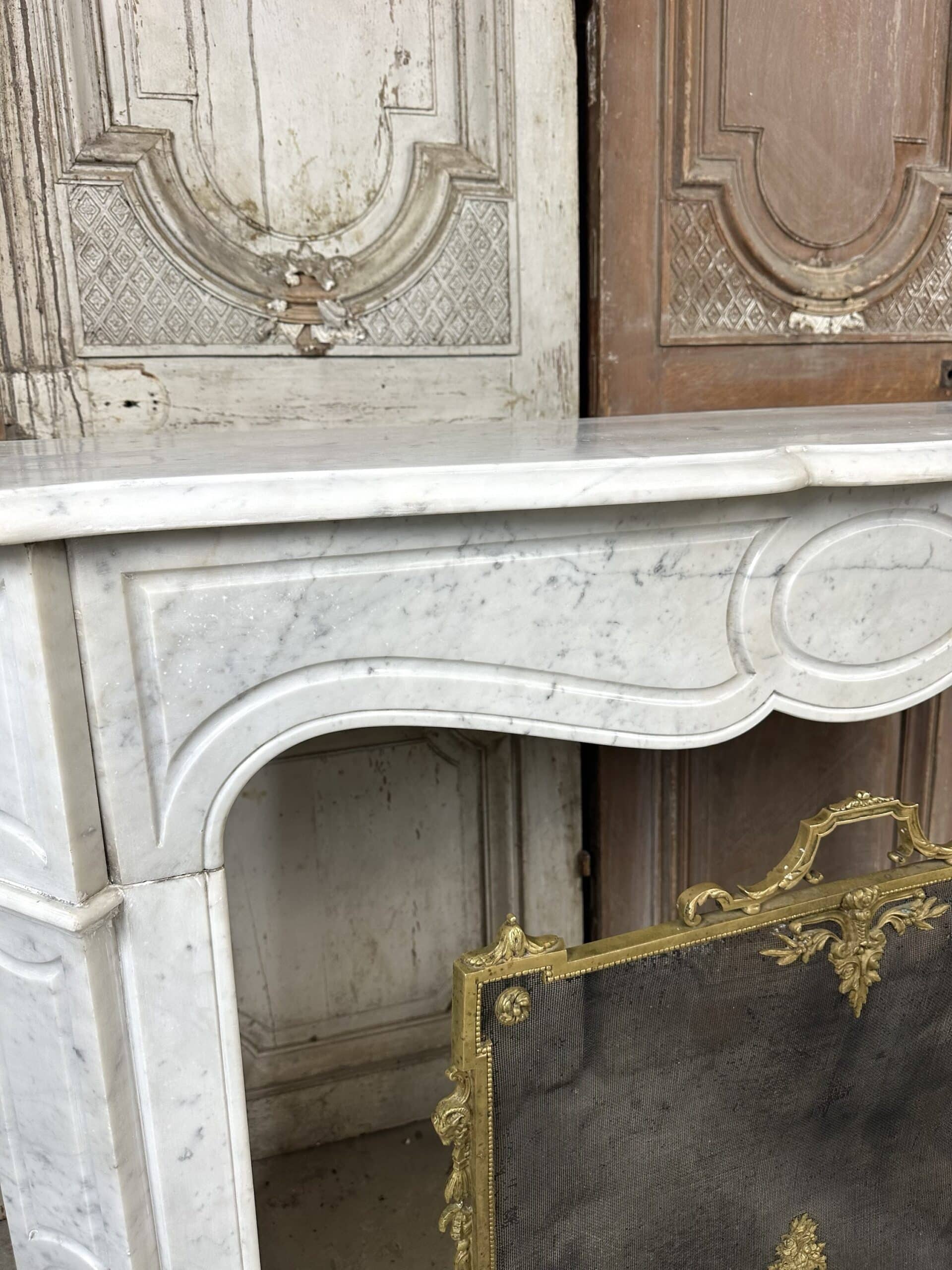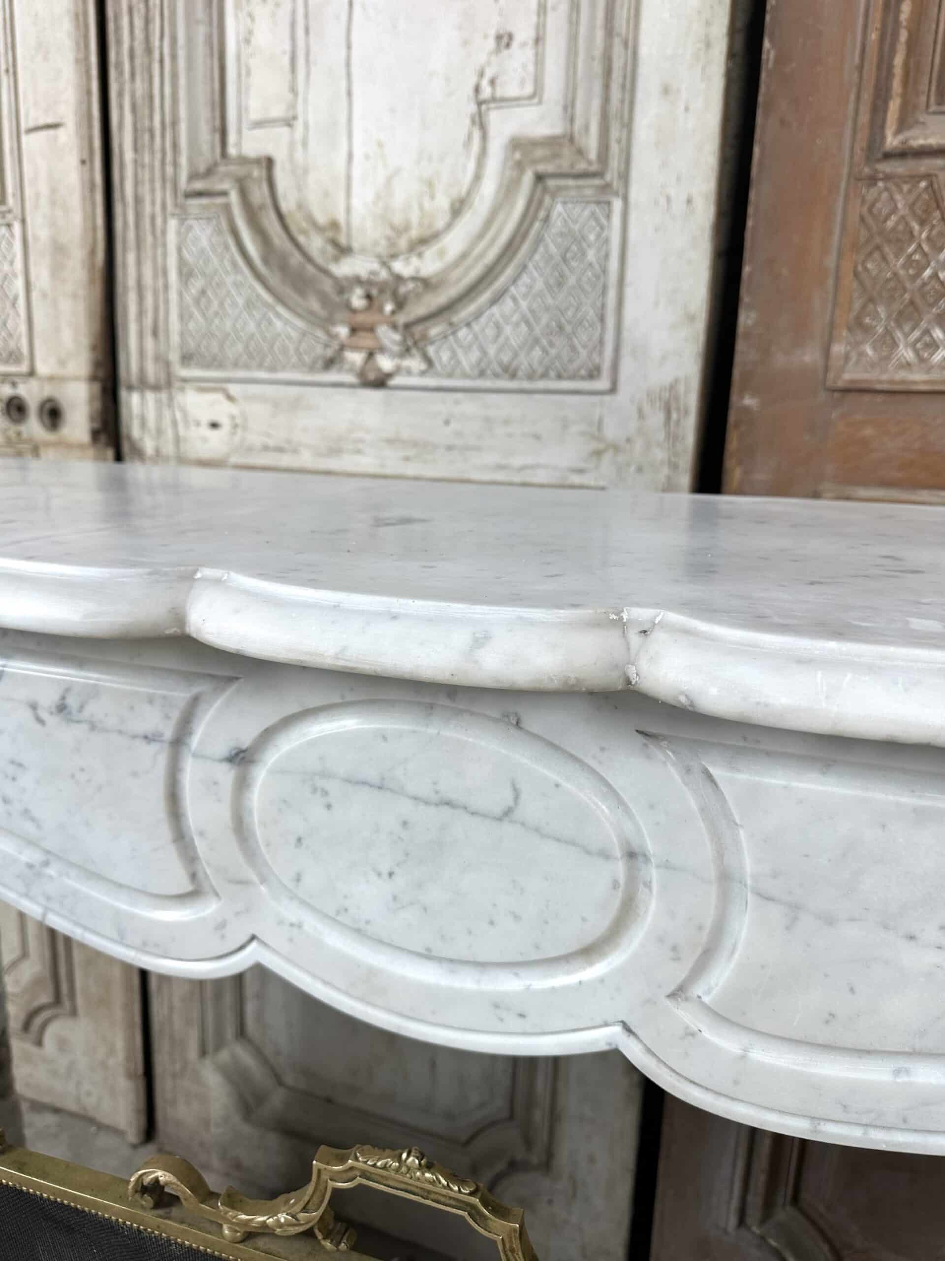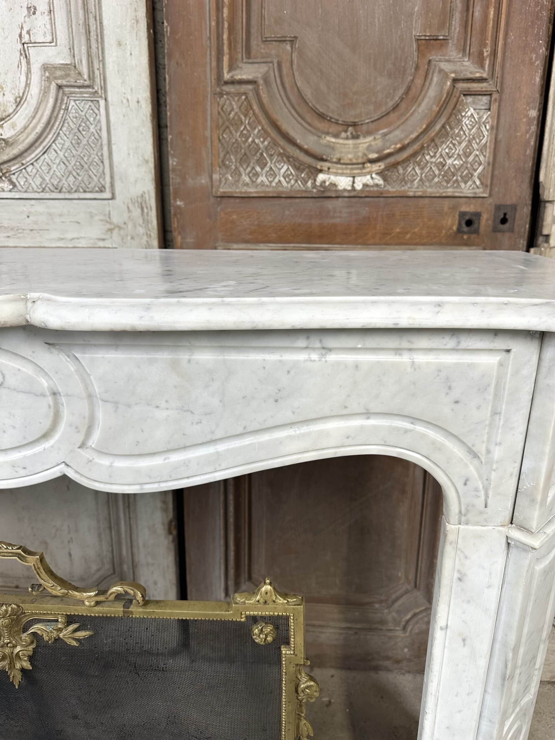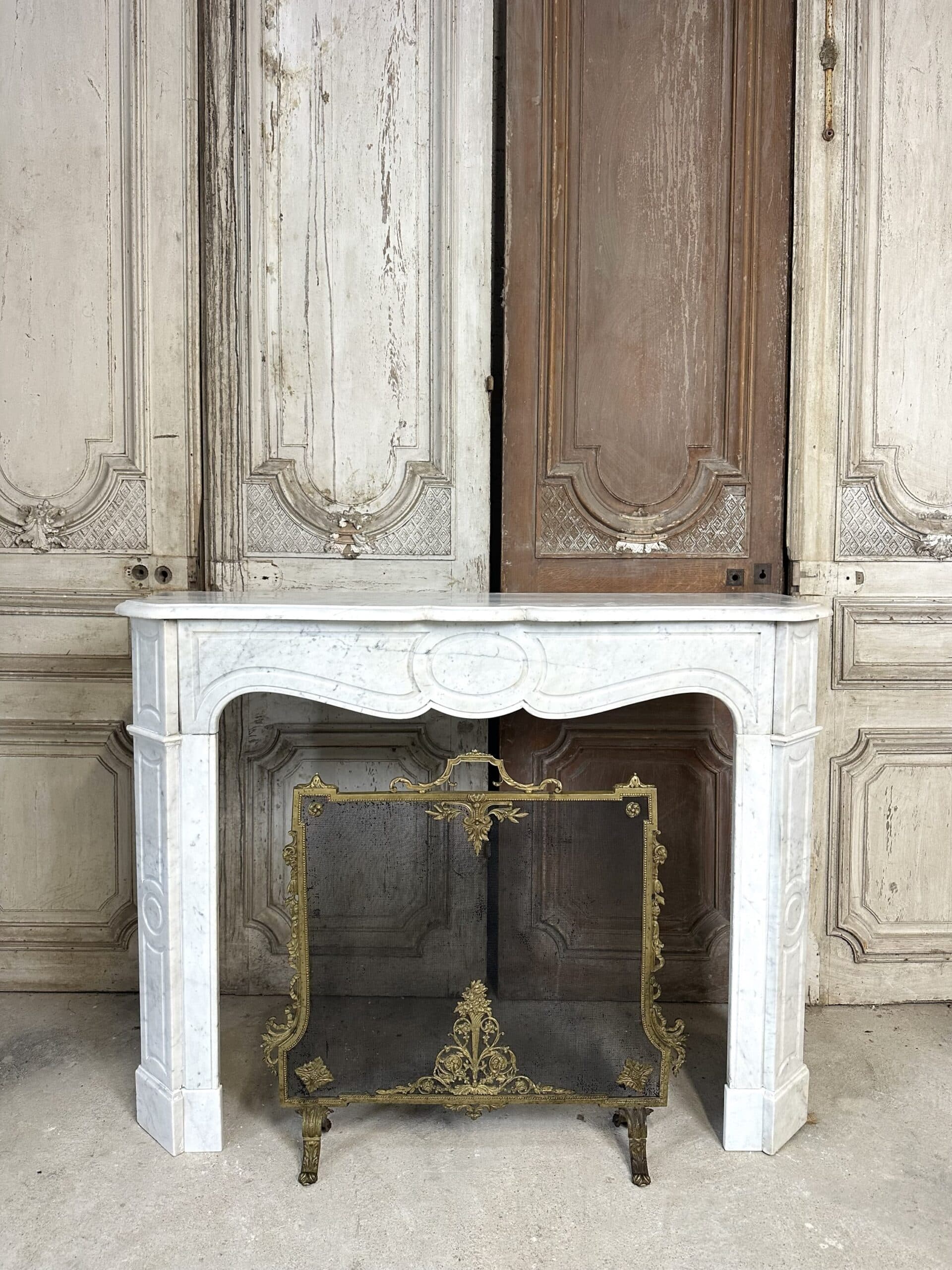 Cheminée plate de style Louis XV circa 1900. Jambages et linteau décreusés, plateau à bec de corbin d’une simple épaisseur.