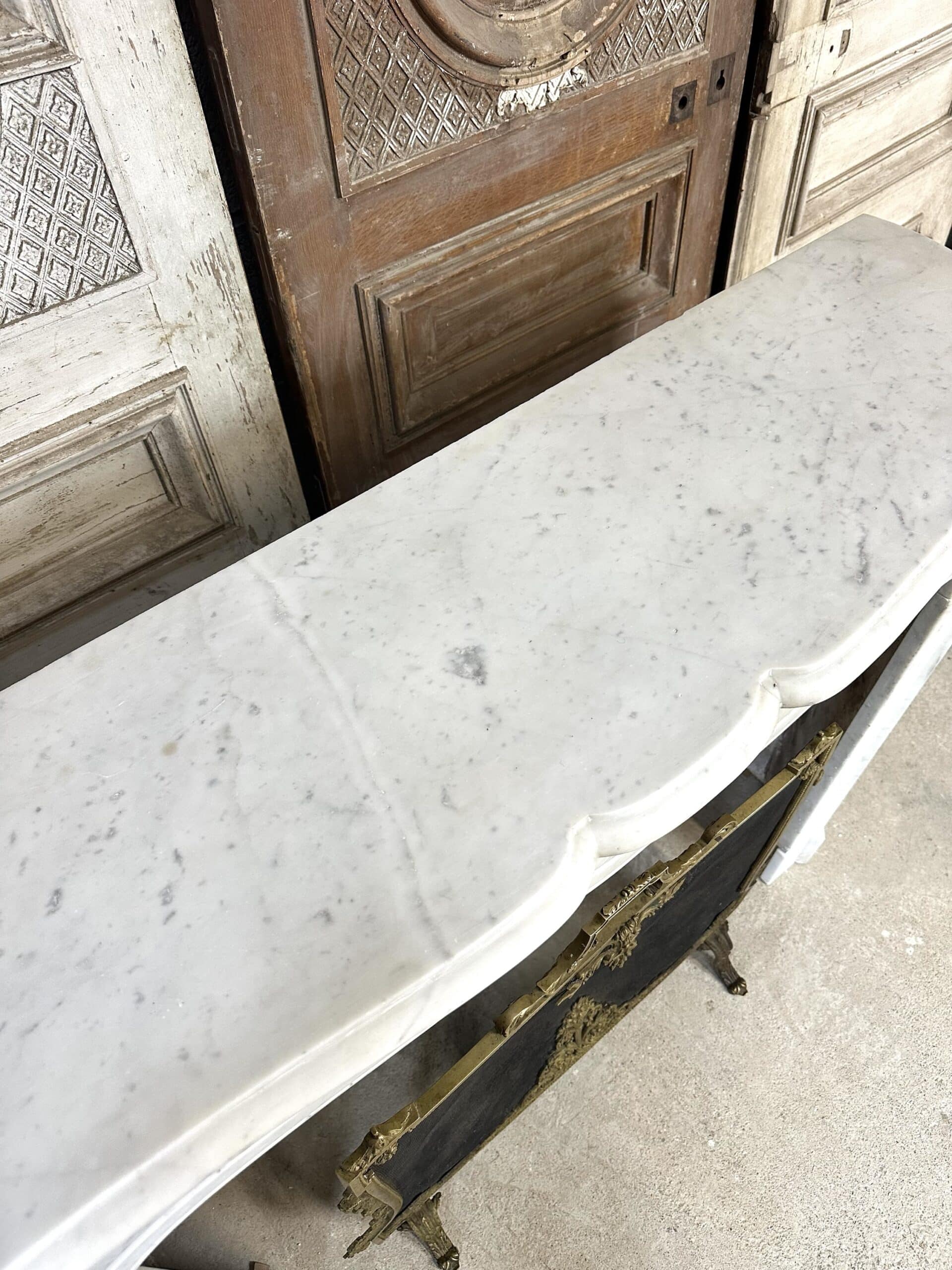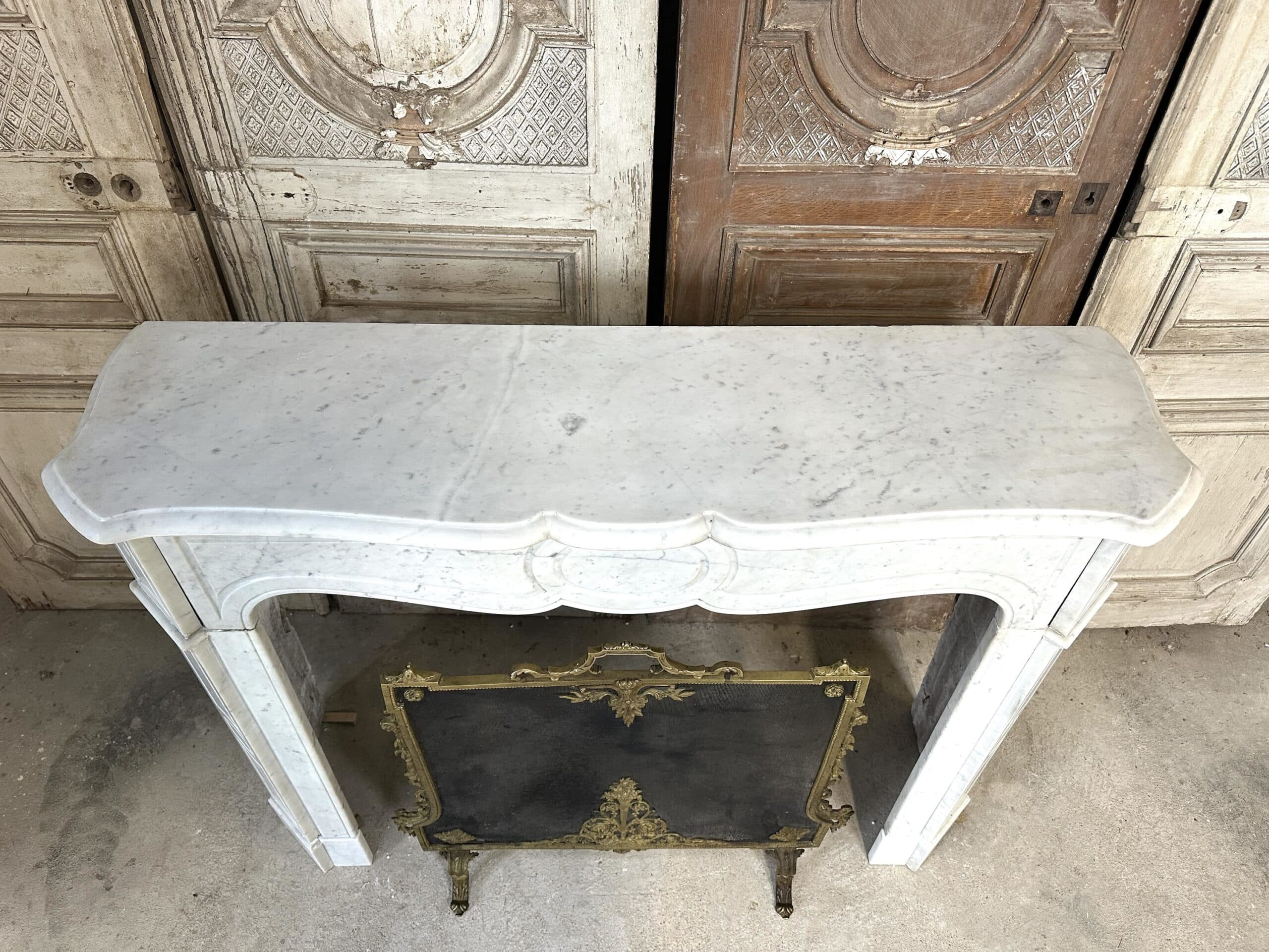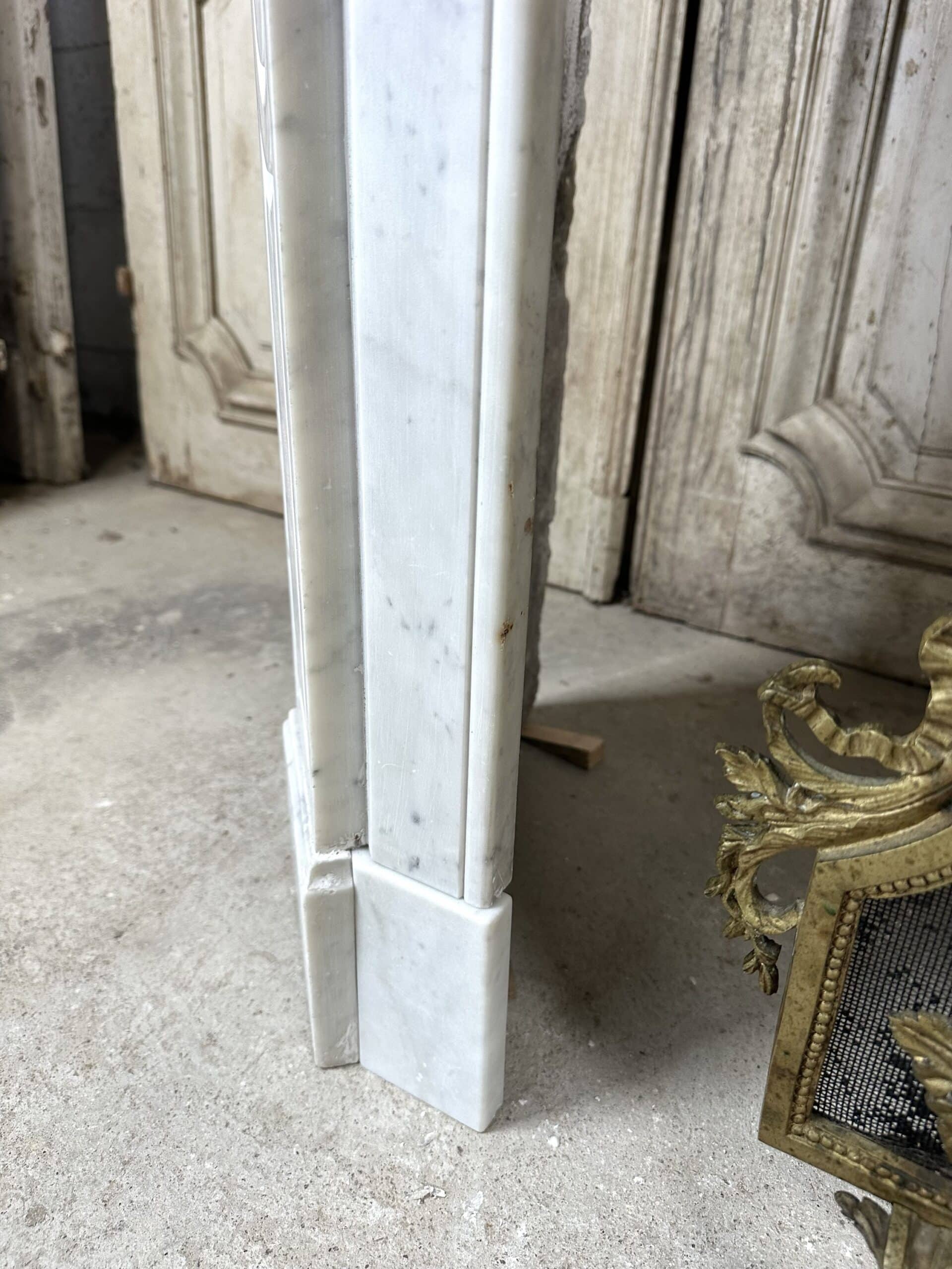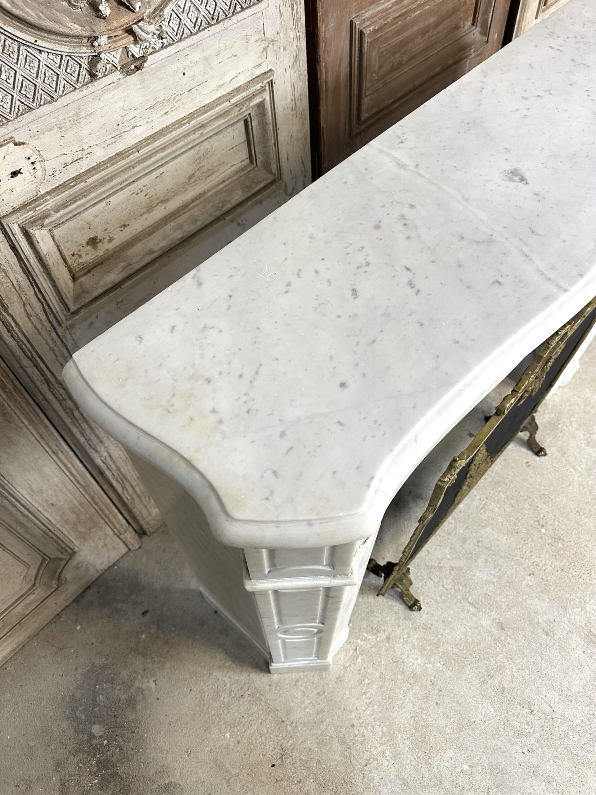 Cheminée plate de style Louis XV circa 1900. Jambages et linteau décreusés, plateau à bec de corbin d’une simple épaisseur.