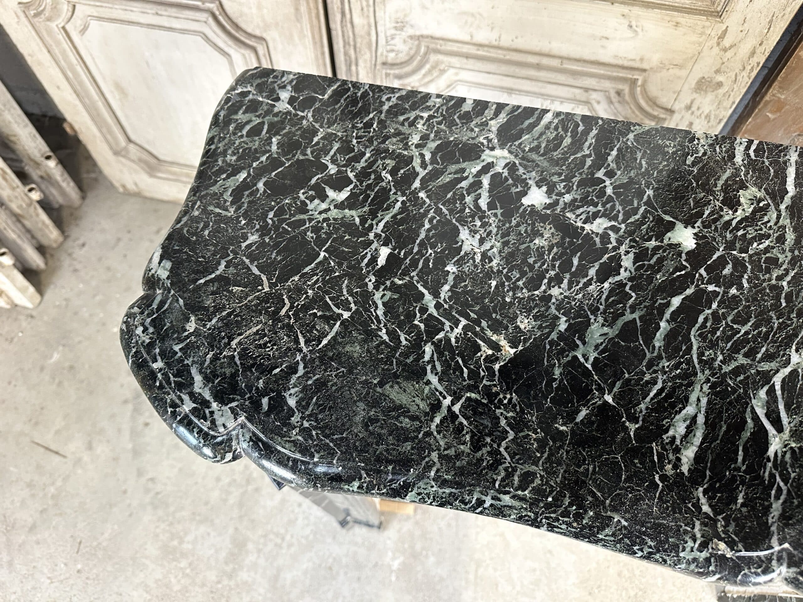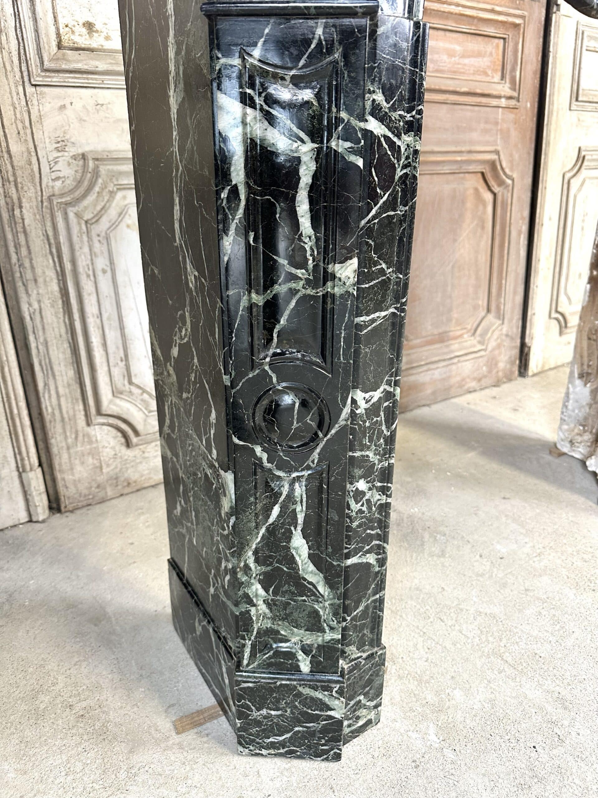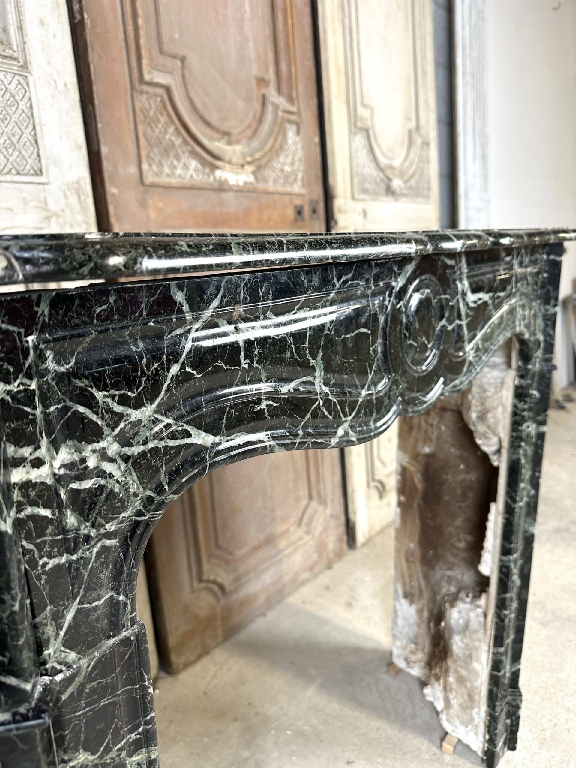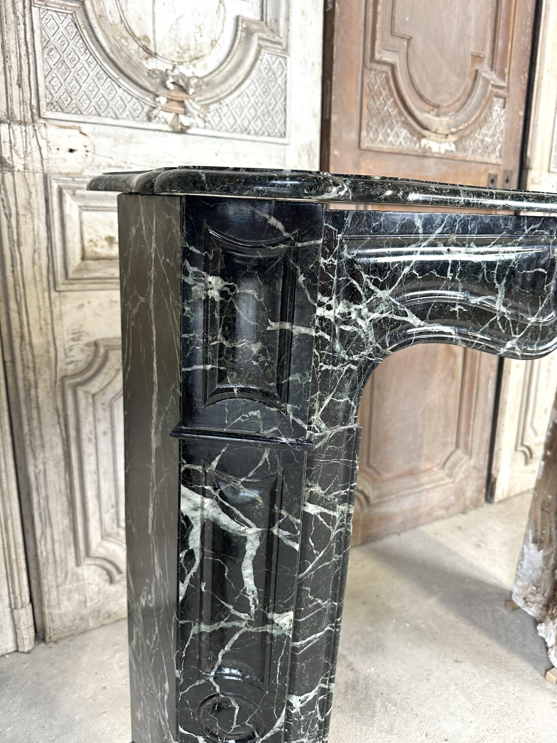 Cheminée de style Louis XV en marbre vert de mer circa 1900. Jambages et linteau avec des moulures, plateau à bec de corbin. Très beau marbre provenant d’une demeure en Anjou.