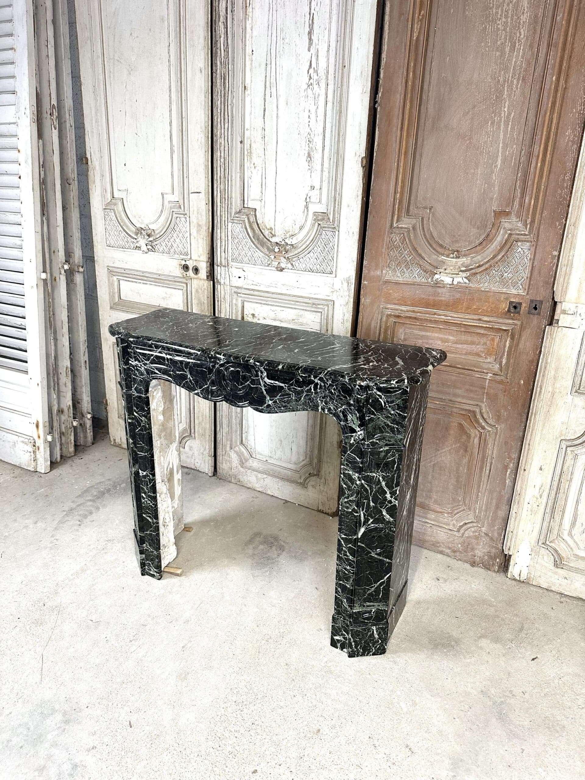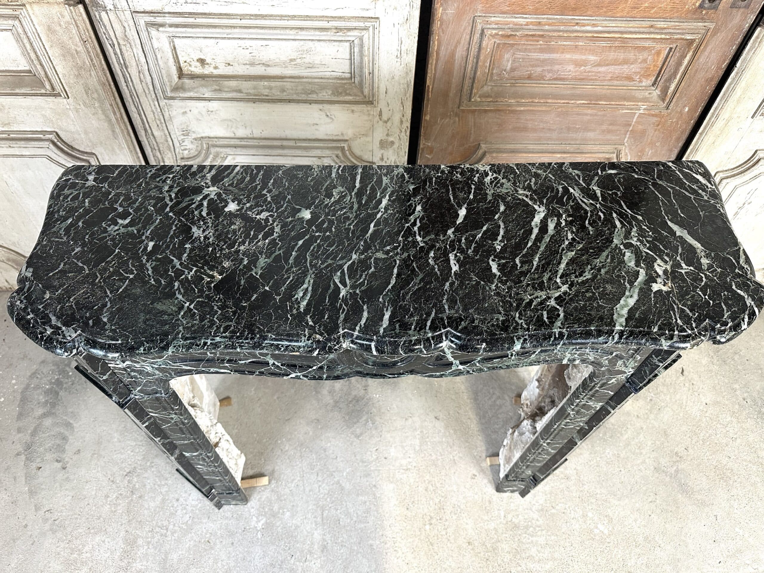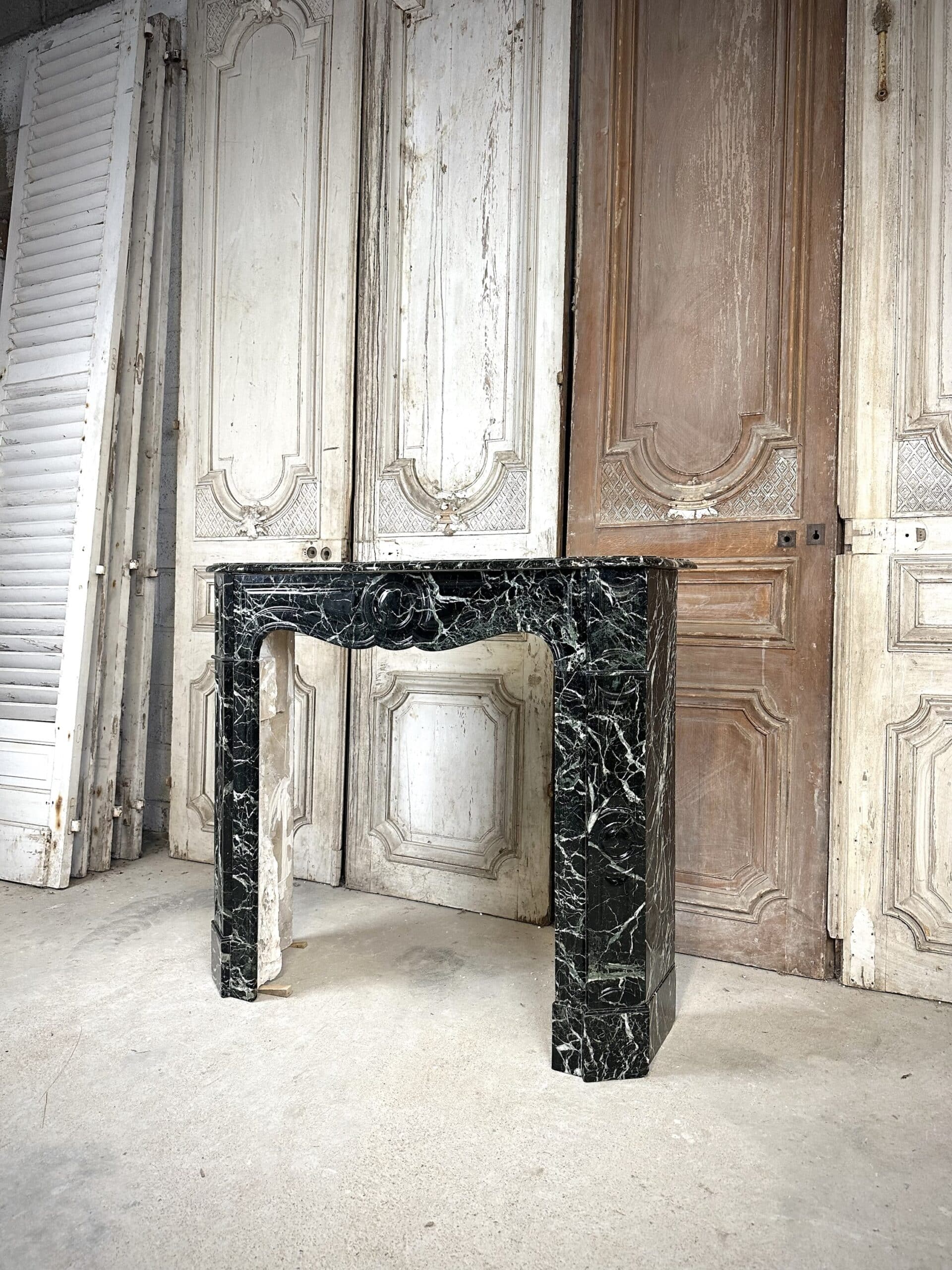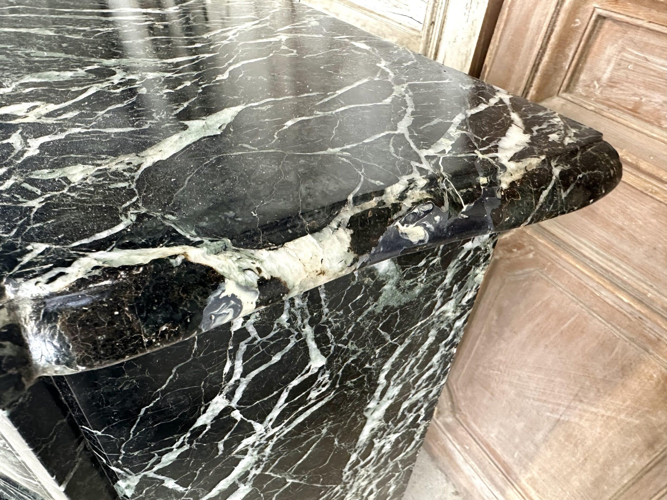 Cheminée de style Louis XV en marbre vert de mer circa 1900. Jambages et linteau avec des moulures, plateau à bec de corbin. Très beau marbre provenant d’une demeure en Anjou.