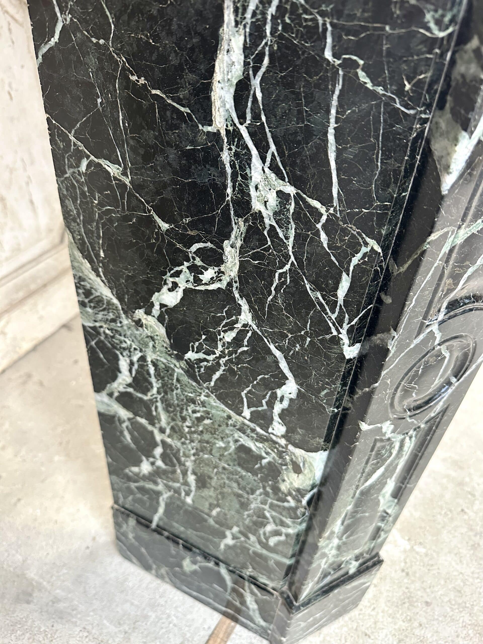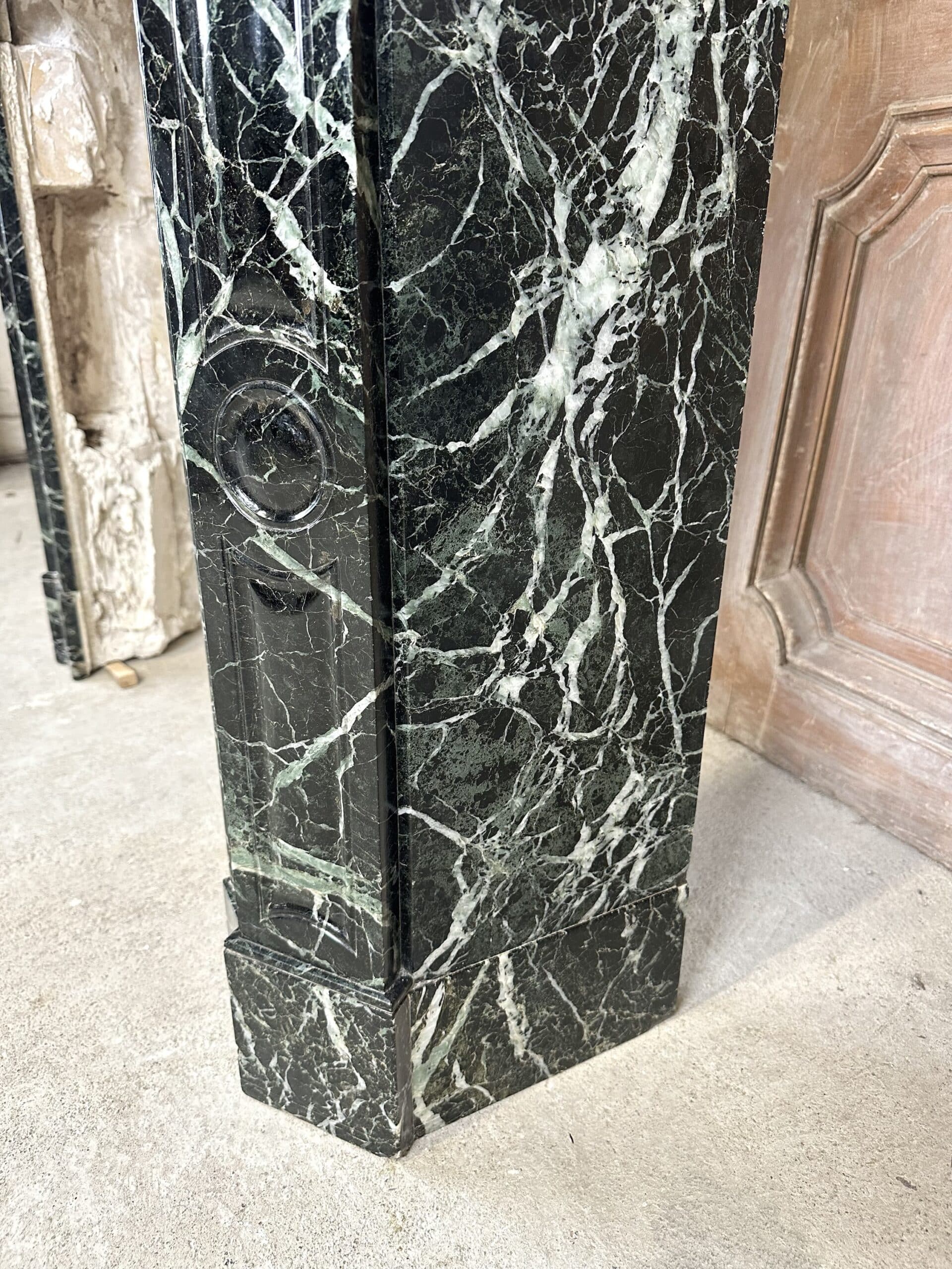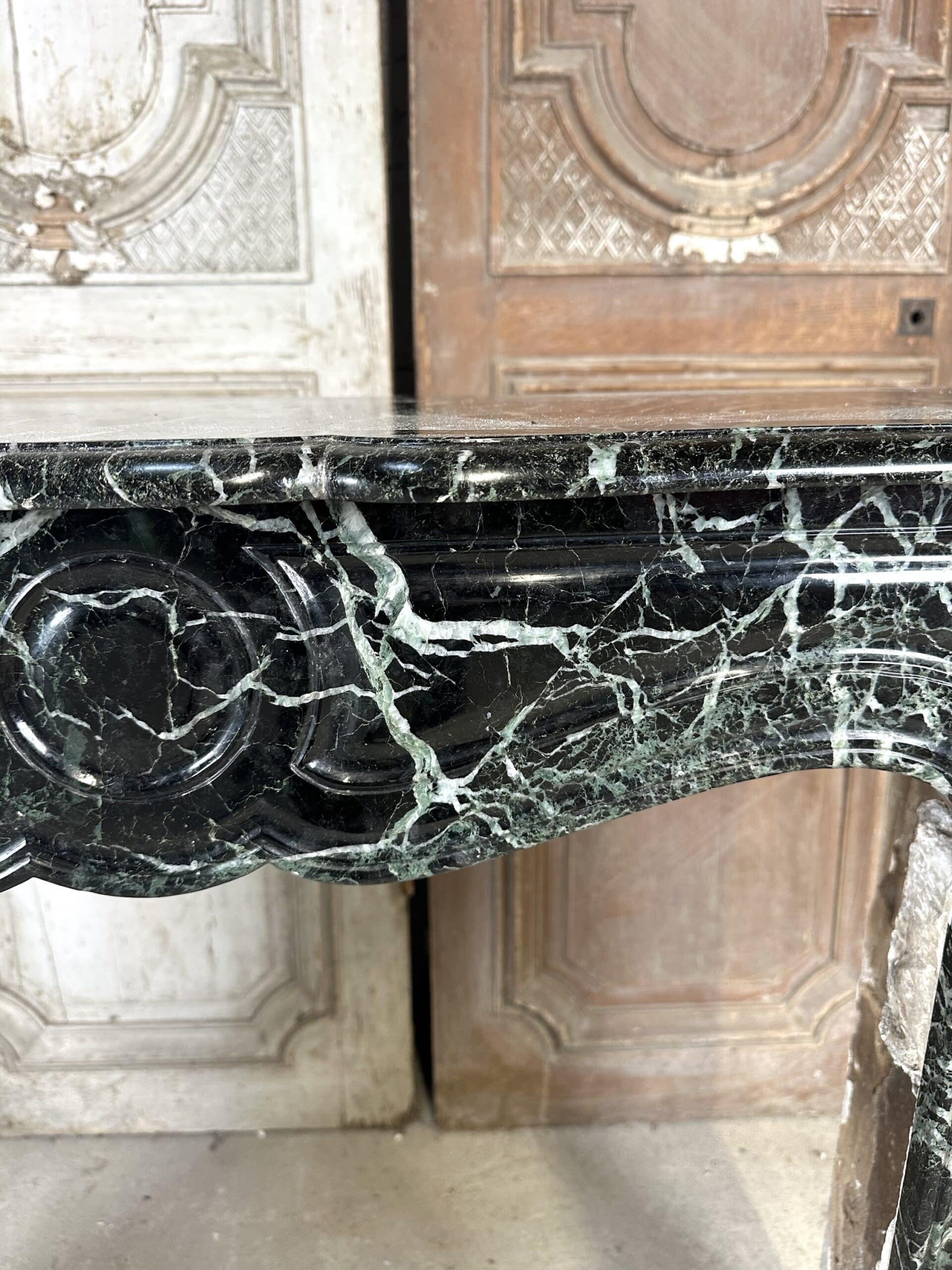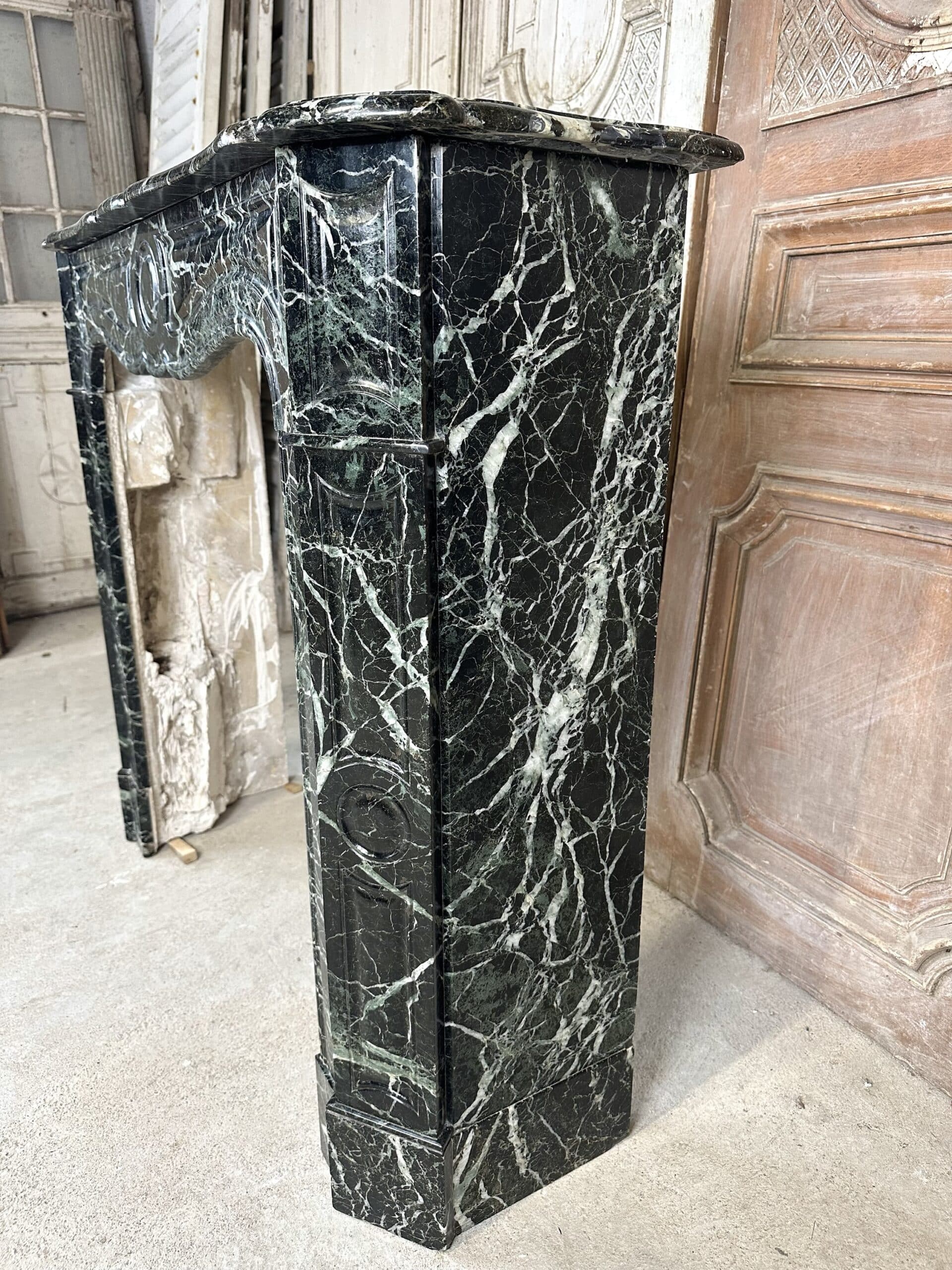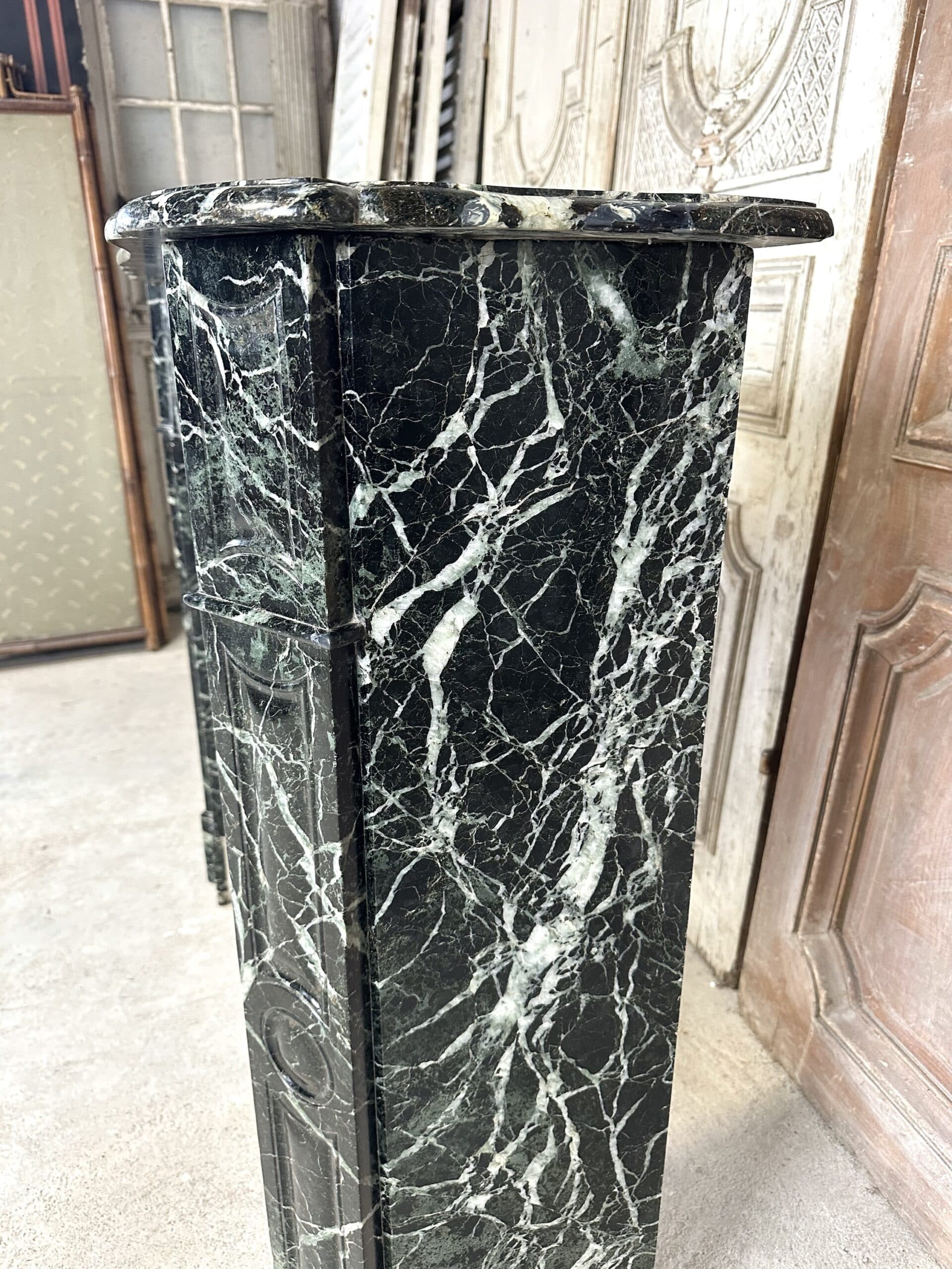 Cheminée de style Louis XV en marbre vert de mer circa 1900. Jambages et linteau avec des moulures, plateau à bec de corbin. Très beau marbre provenant d’une demeure en Anjou.