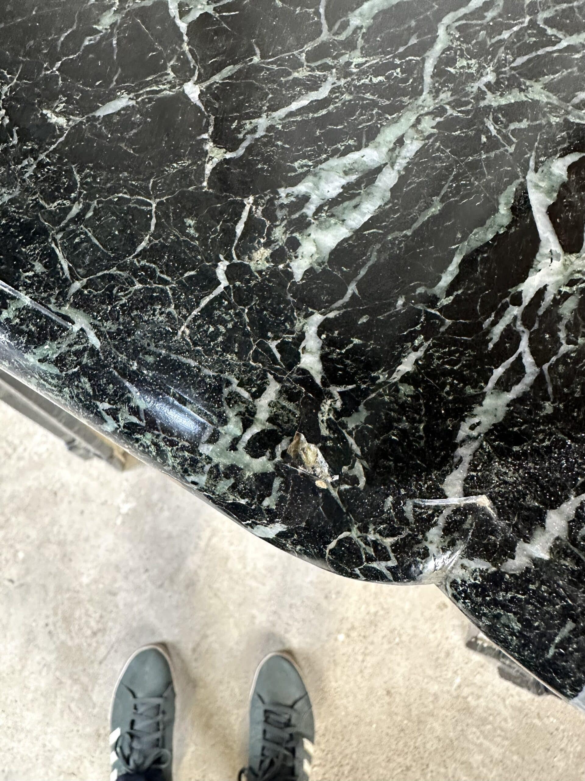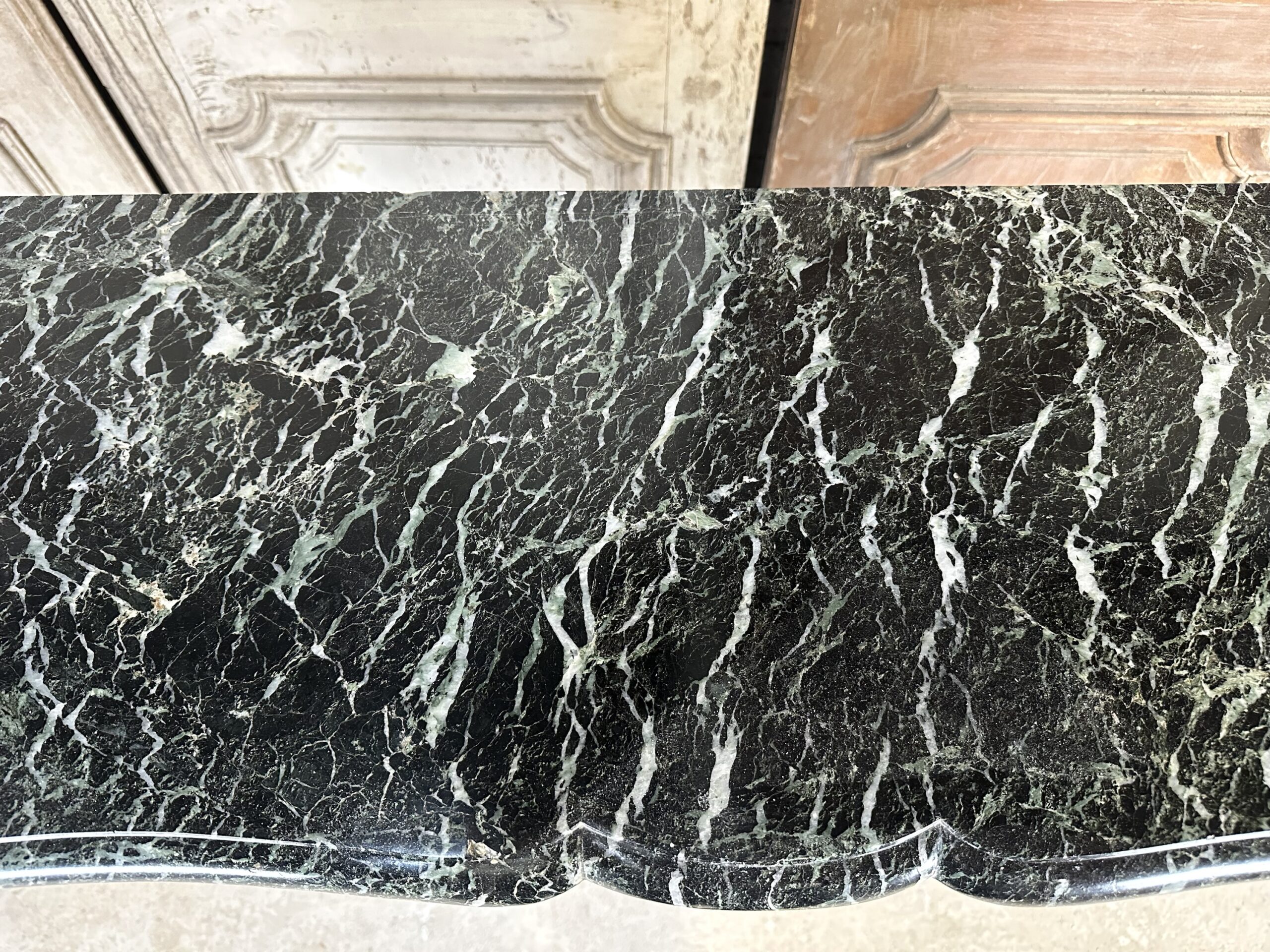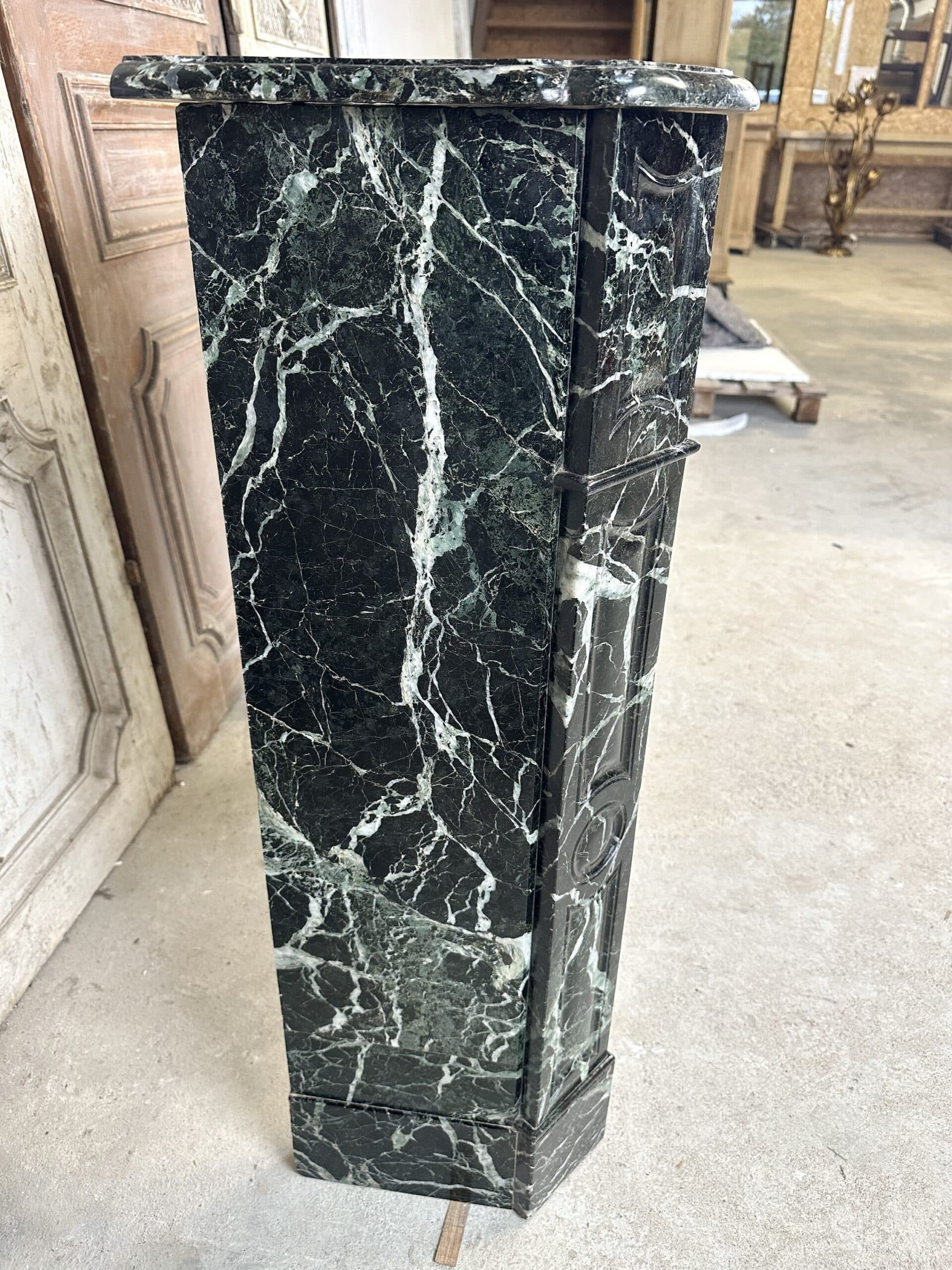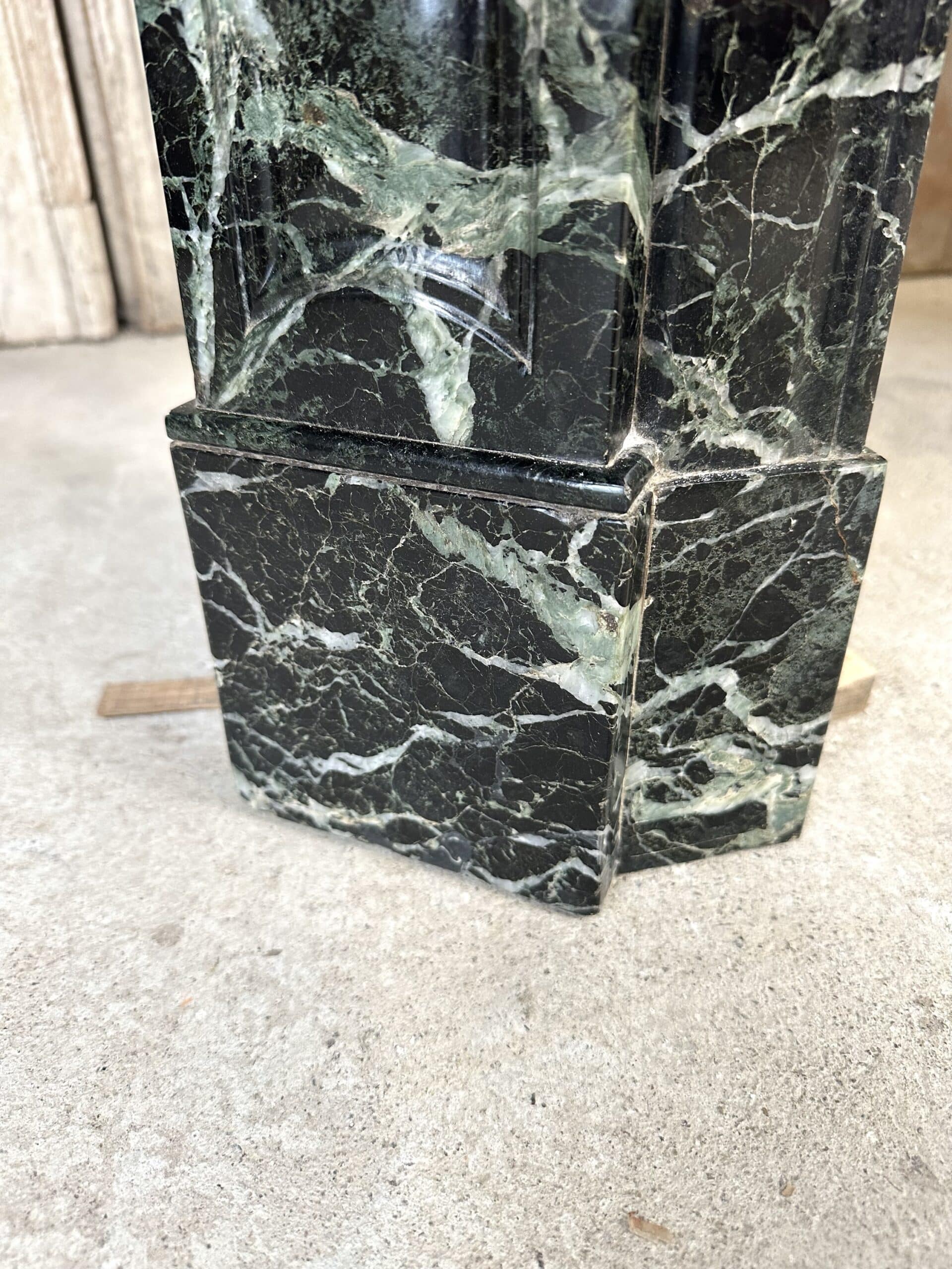 Cheminée de style Louis XV en marbre vert de mer circa 1900. Jambages et linteau avec des moulures, plateau à bec de corbin. Très beau marbre provenant d’une demeure en Anjou.
