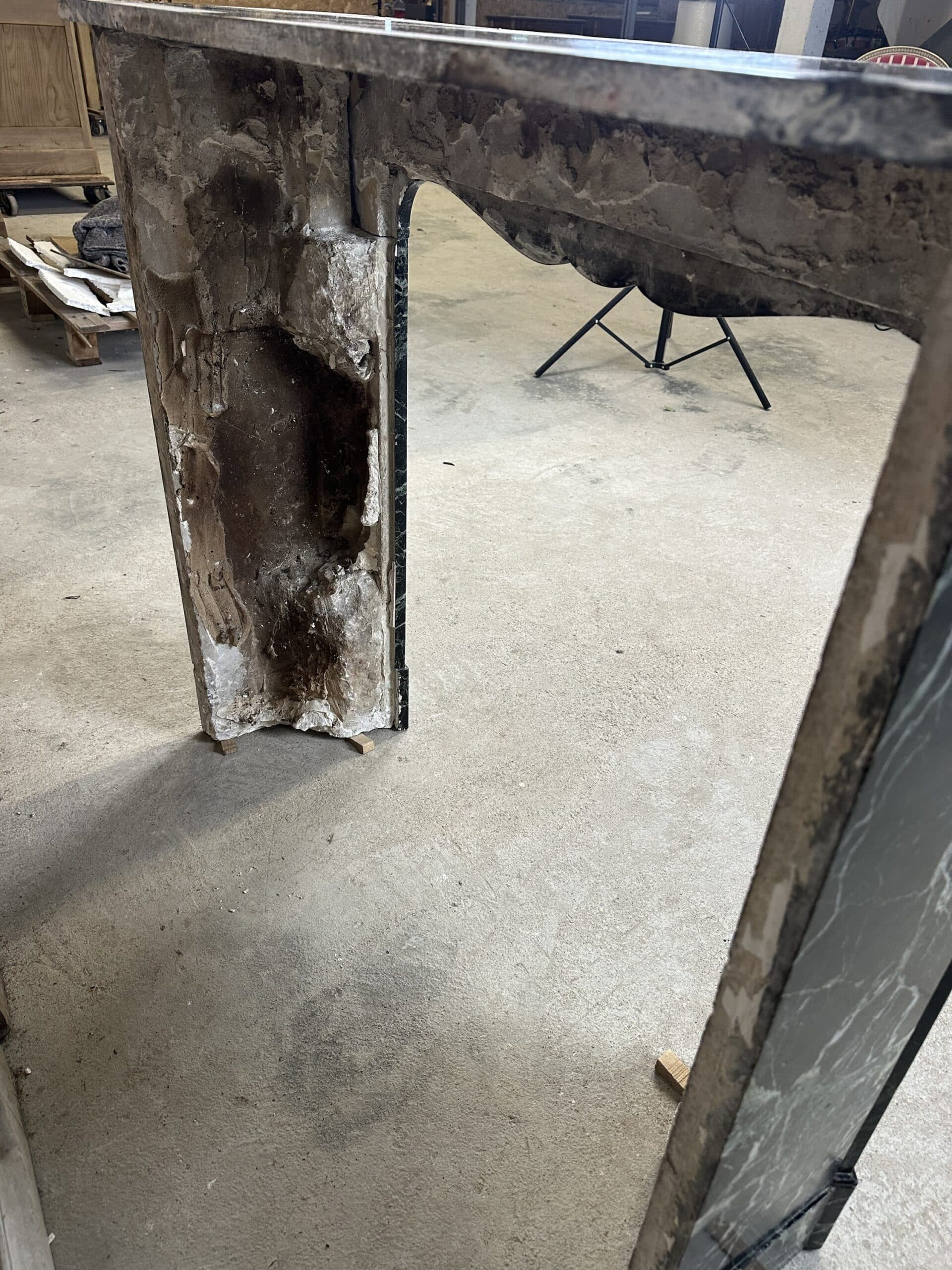 À signaler des restaurations au angles à l’arrière du plateau, en bas d’un jambage et sur un côté.