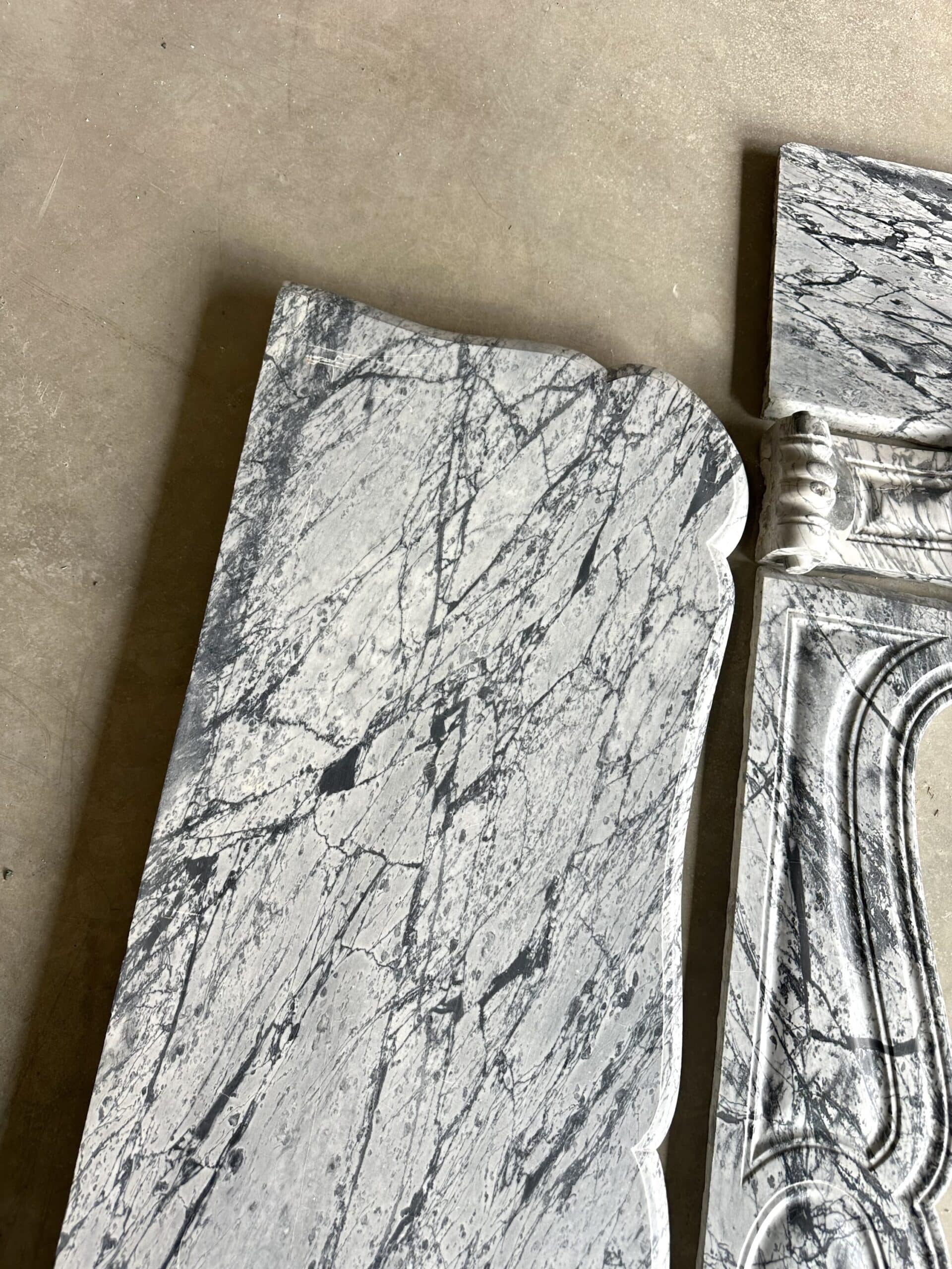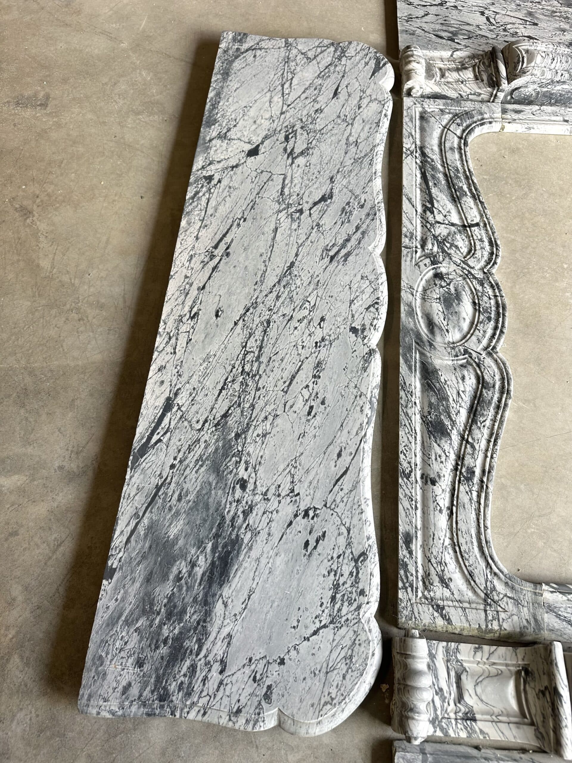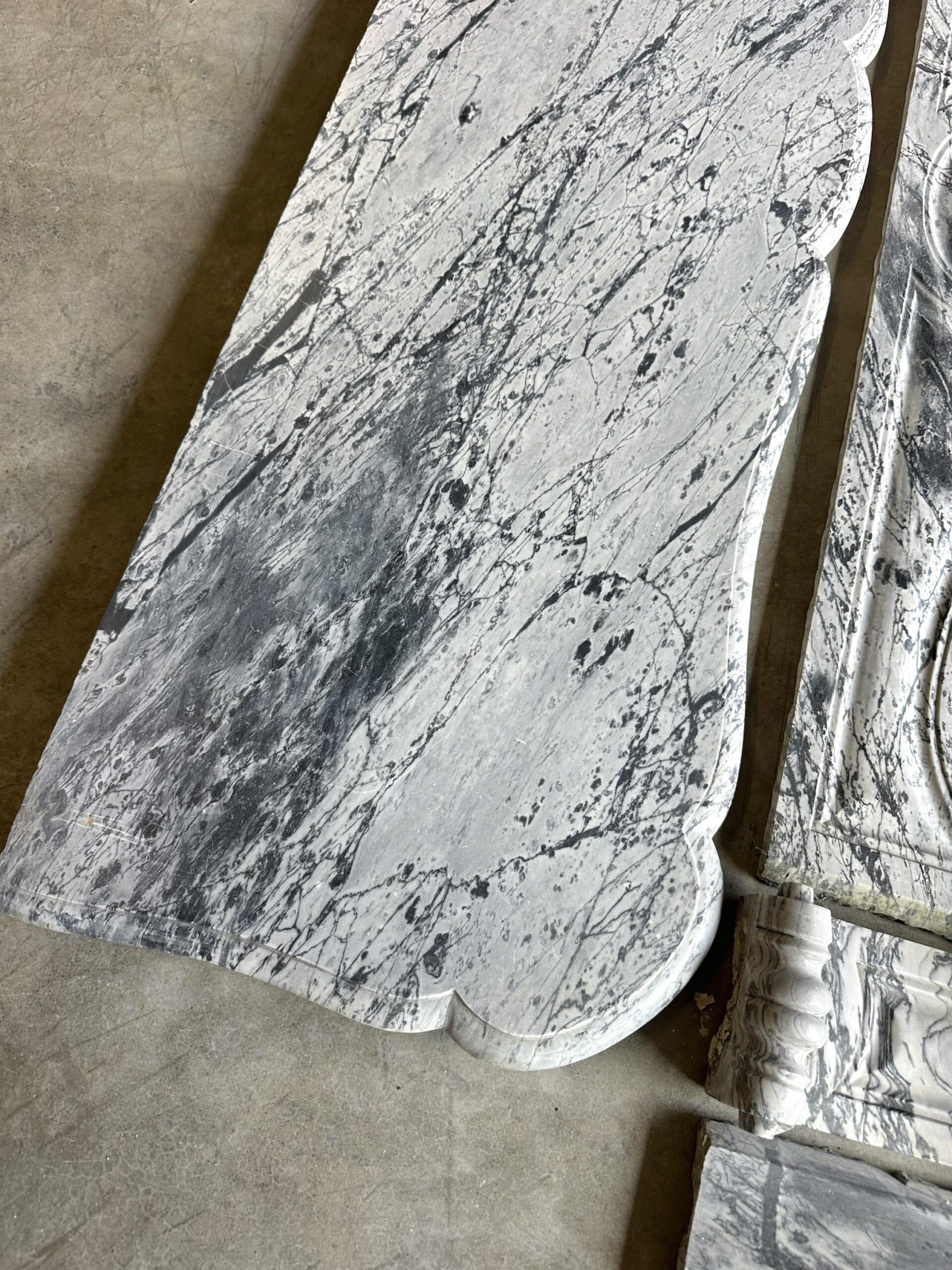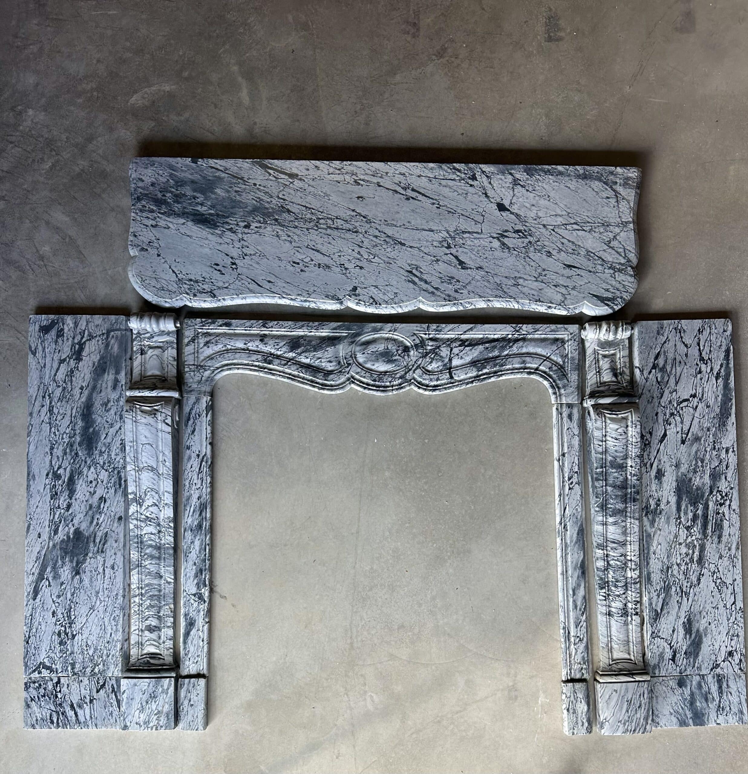 Cheminée de style Louis XV en marbre bleu fleuri époque fin du 19e siècle. Linteau et jambages avec des moulures décreusés. Plateau chantourné avec sa sous tablette. Finition cirée.