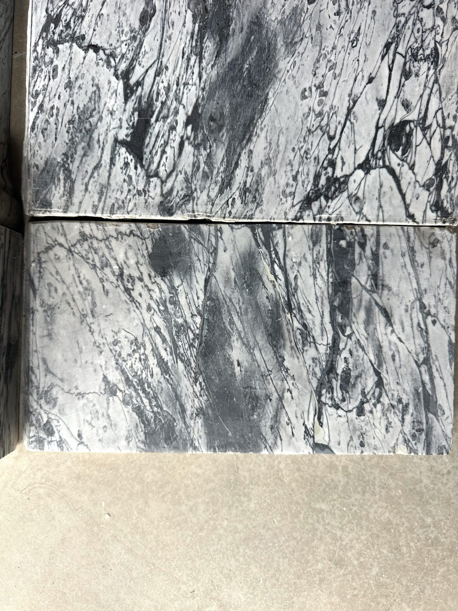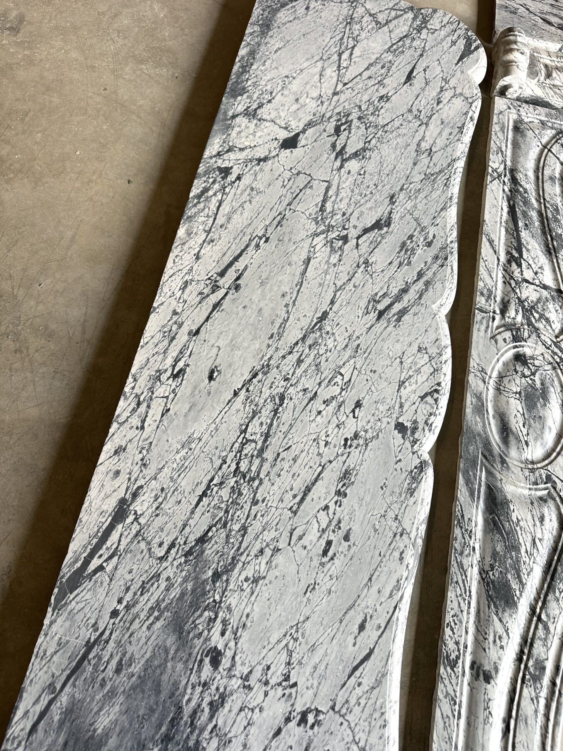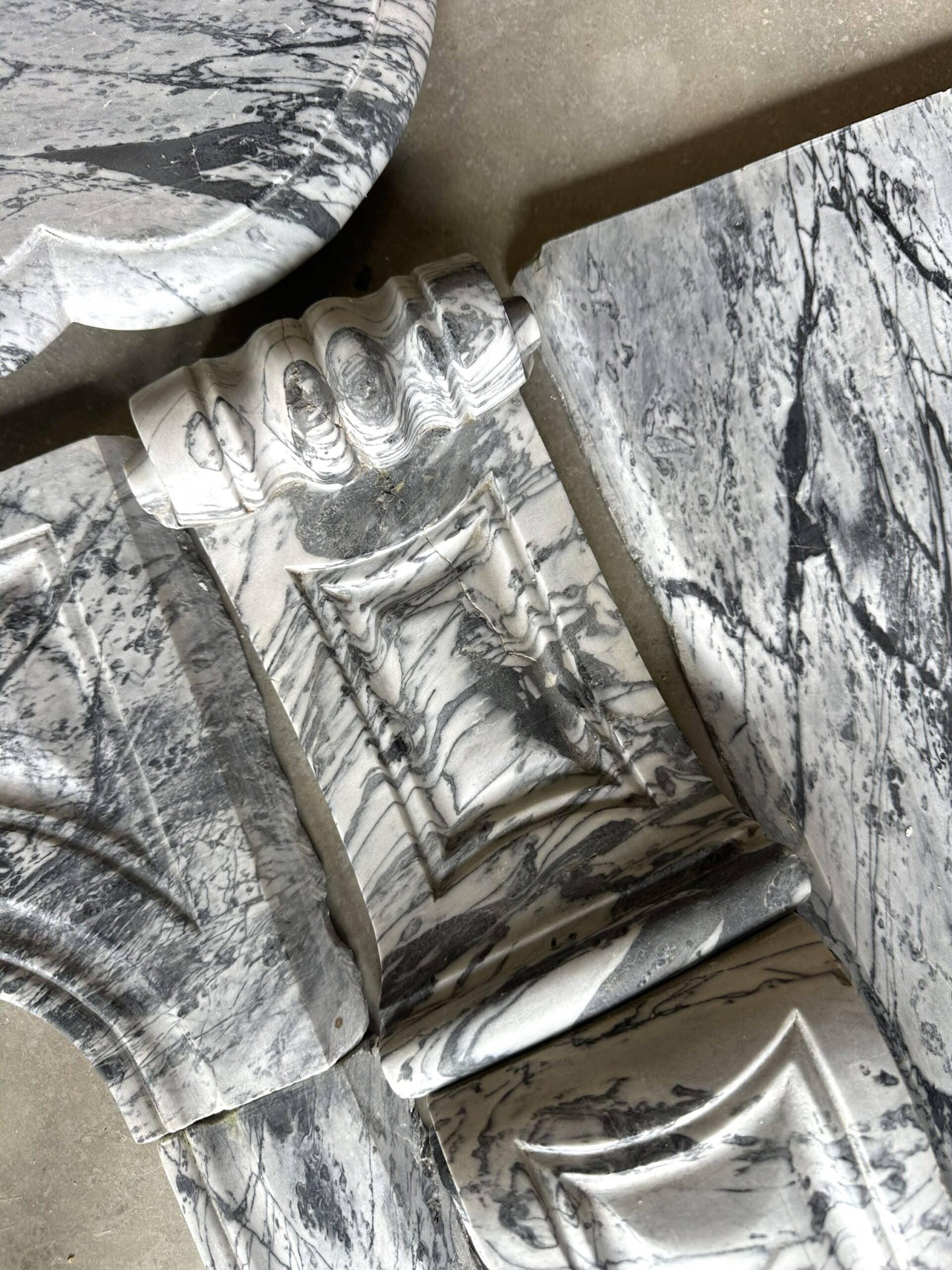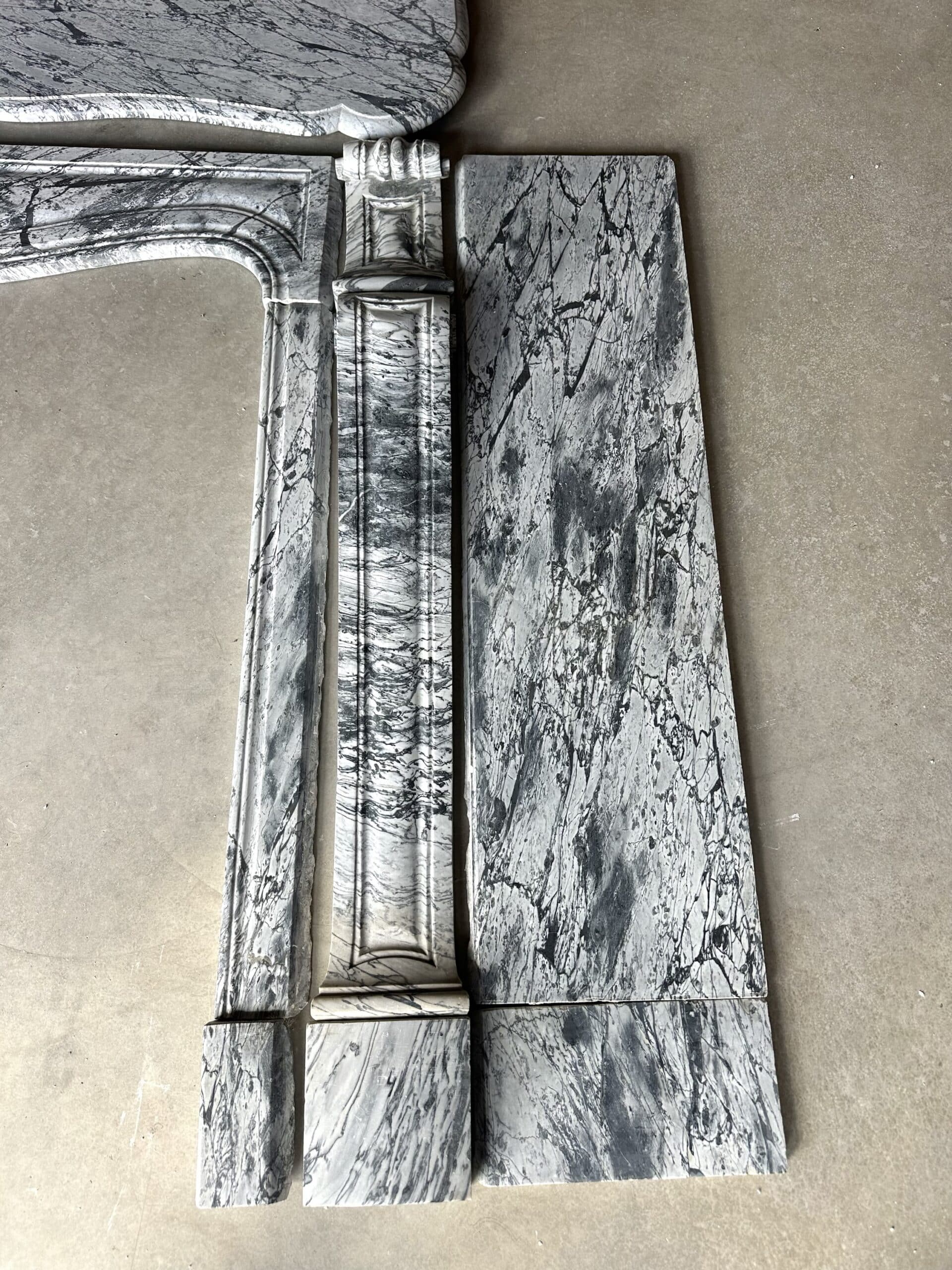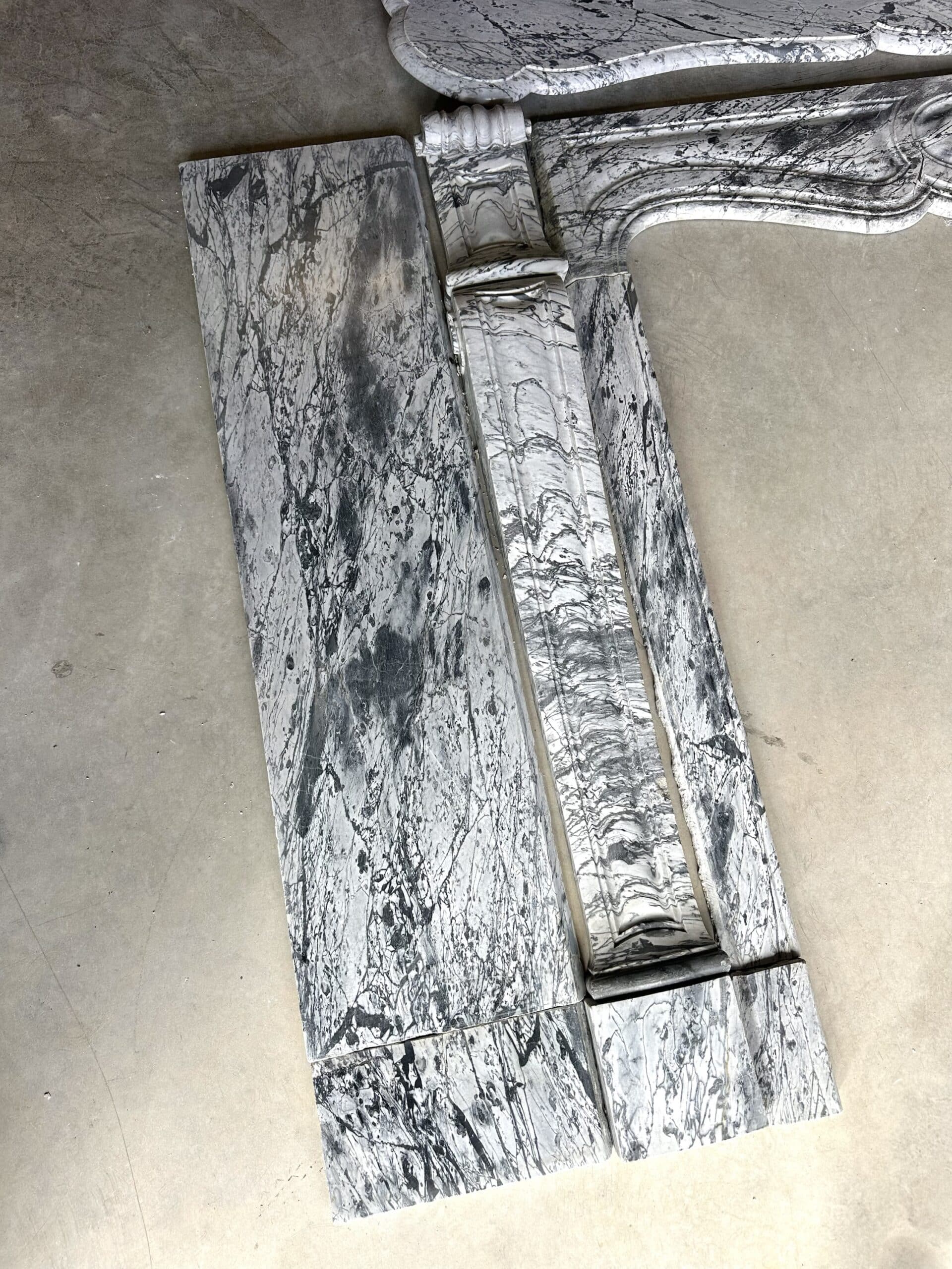 Cheminée de style Louis XV en marbre bleu fleuri époque fin du 19e siècle. Linteau et jambages avec des moulures décreusés. Plateau chantourné avec sa sous tablette. Finition cirée.