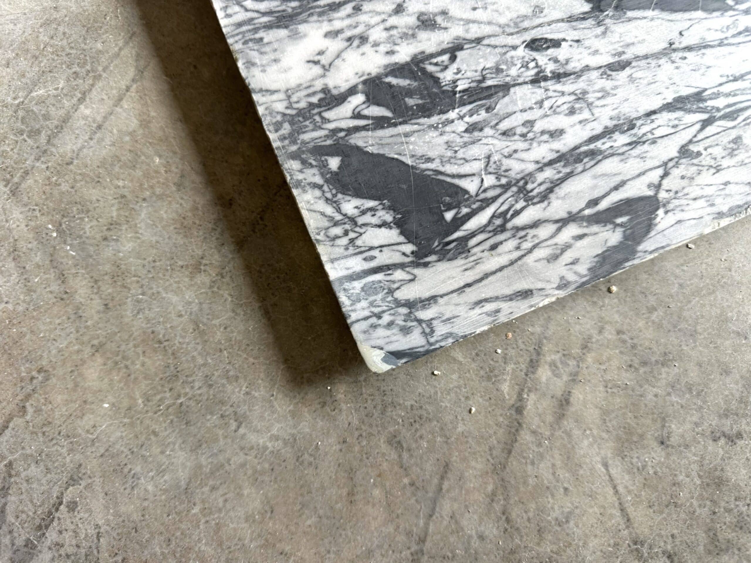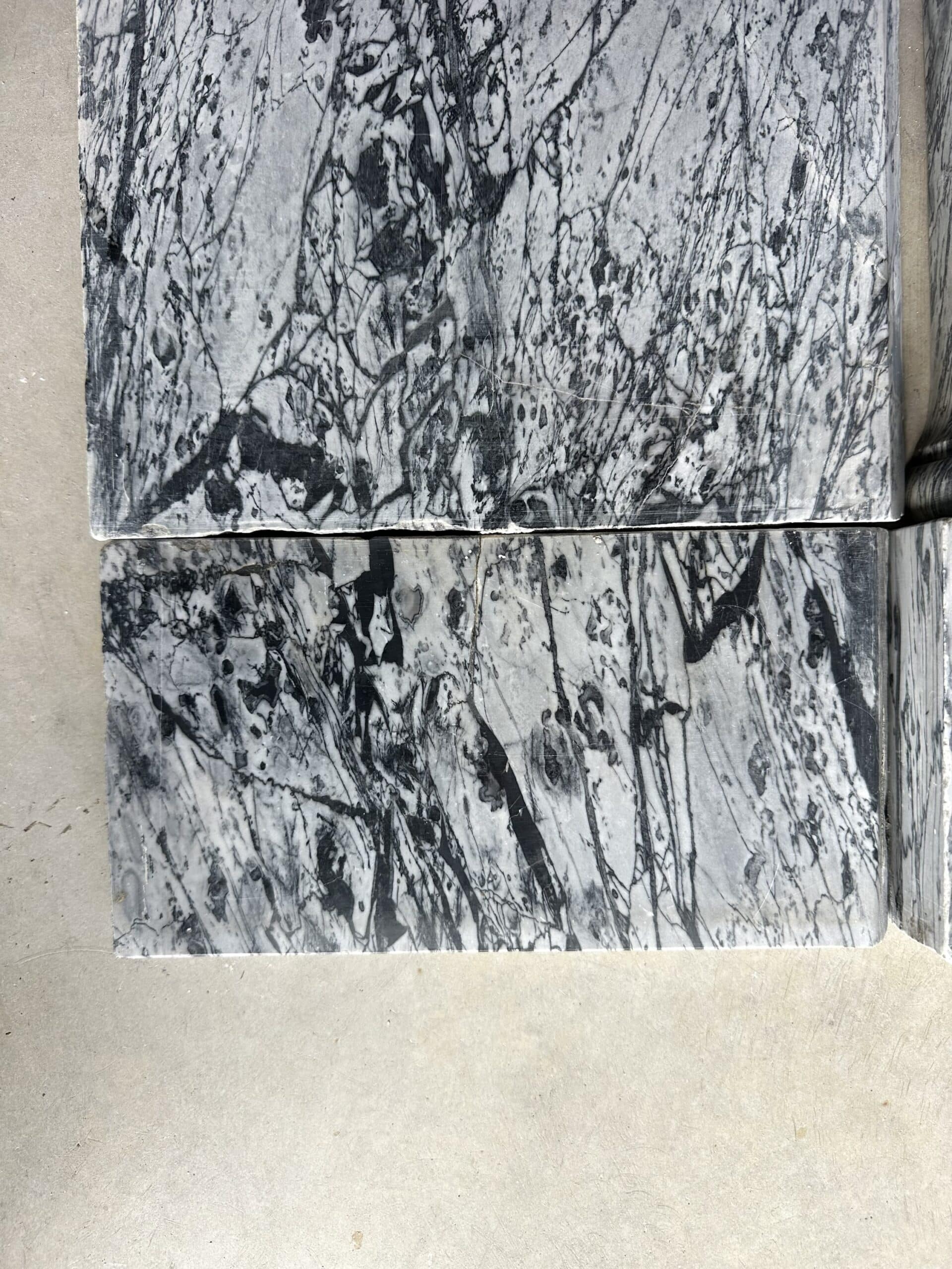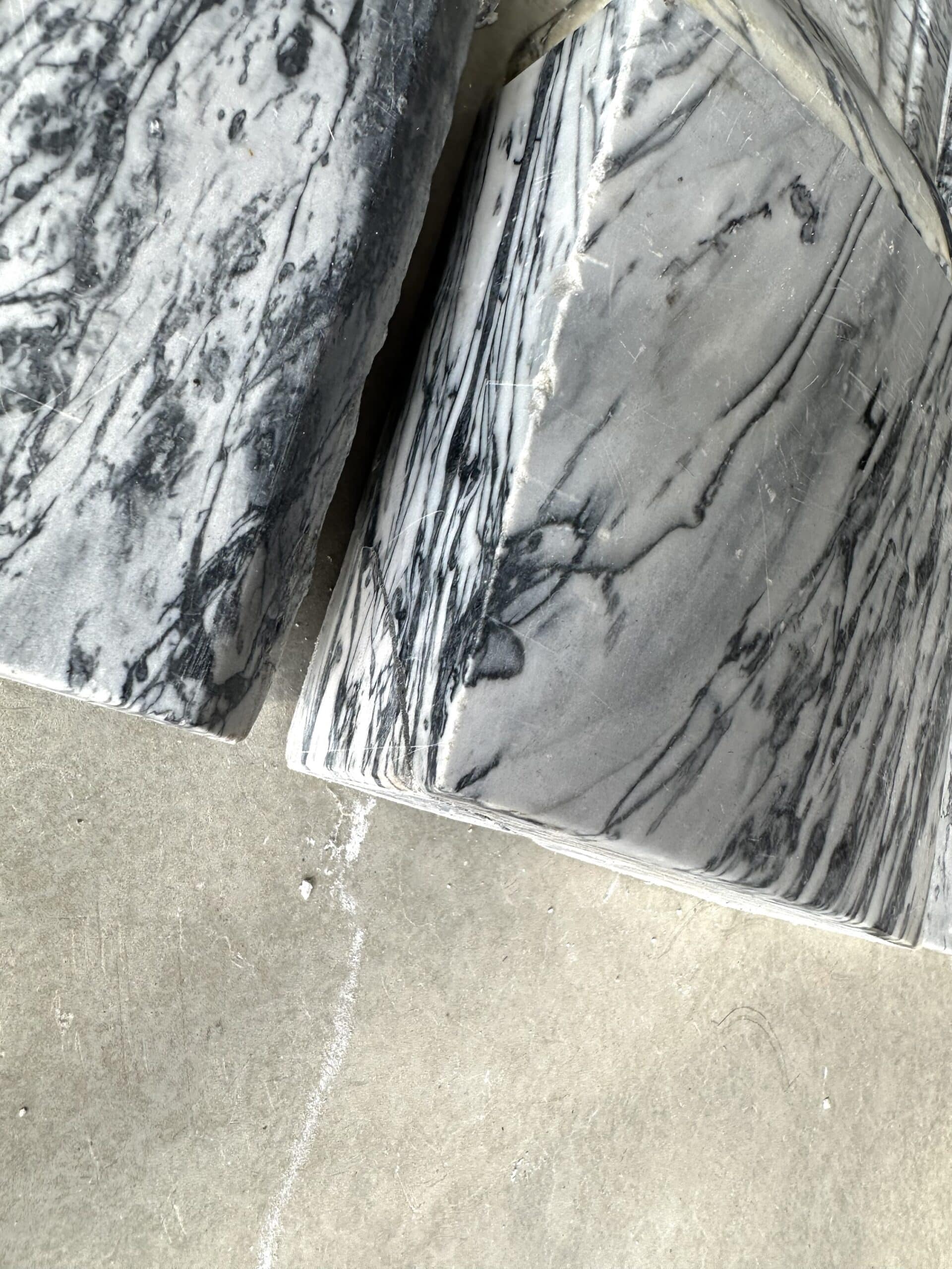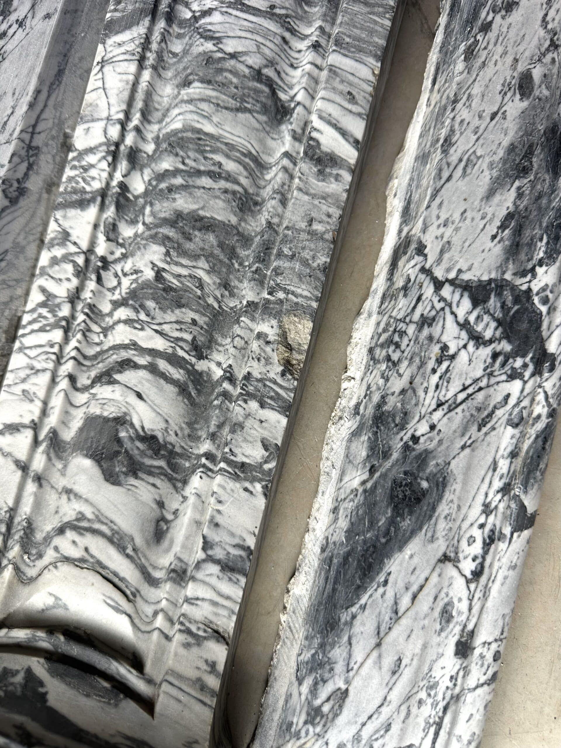 Cheminée de style Louis XV en marbre bleu fleuri époque fin du 19e siècle. Linteau et jambages avec des moulures décreusés. Plateau chantourné avec sa sous tablette. Finition cirée.