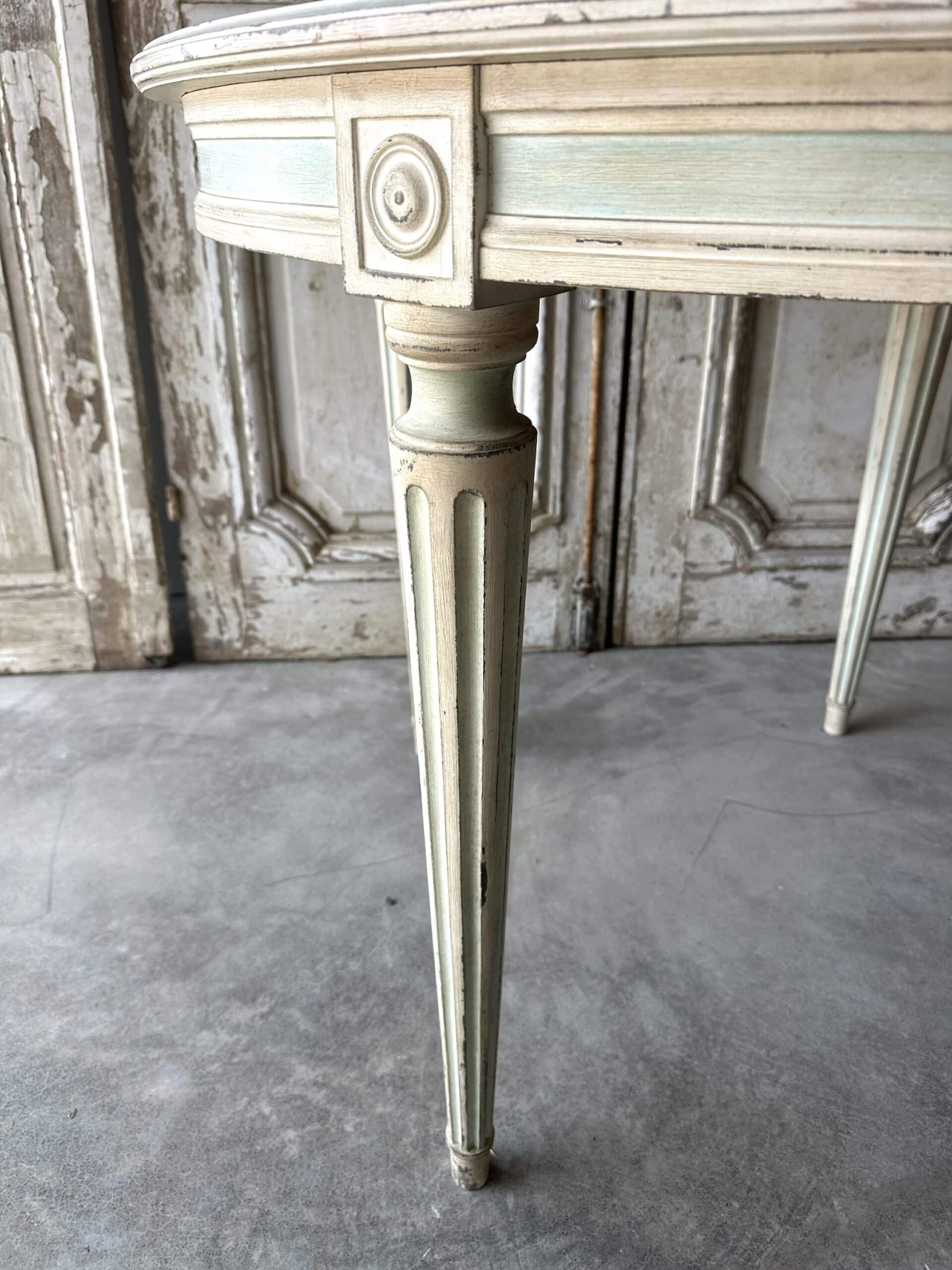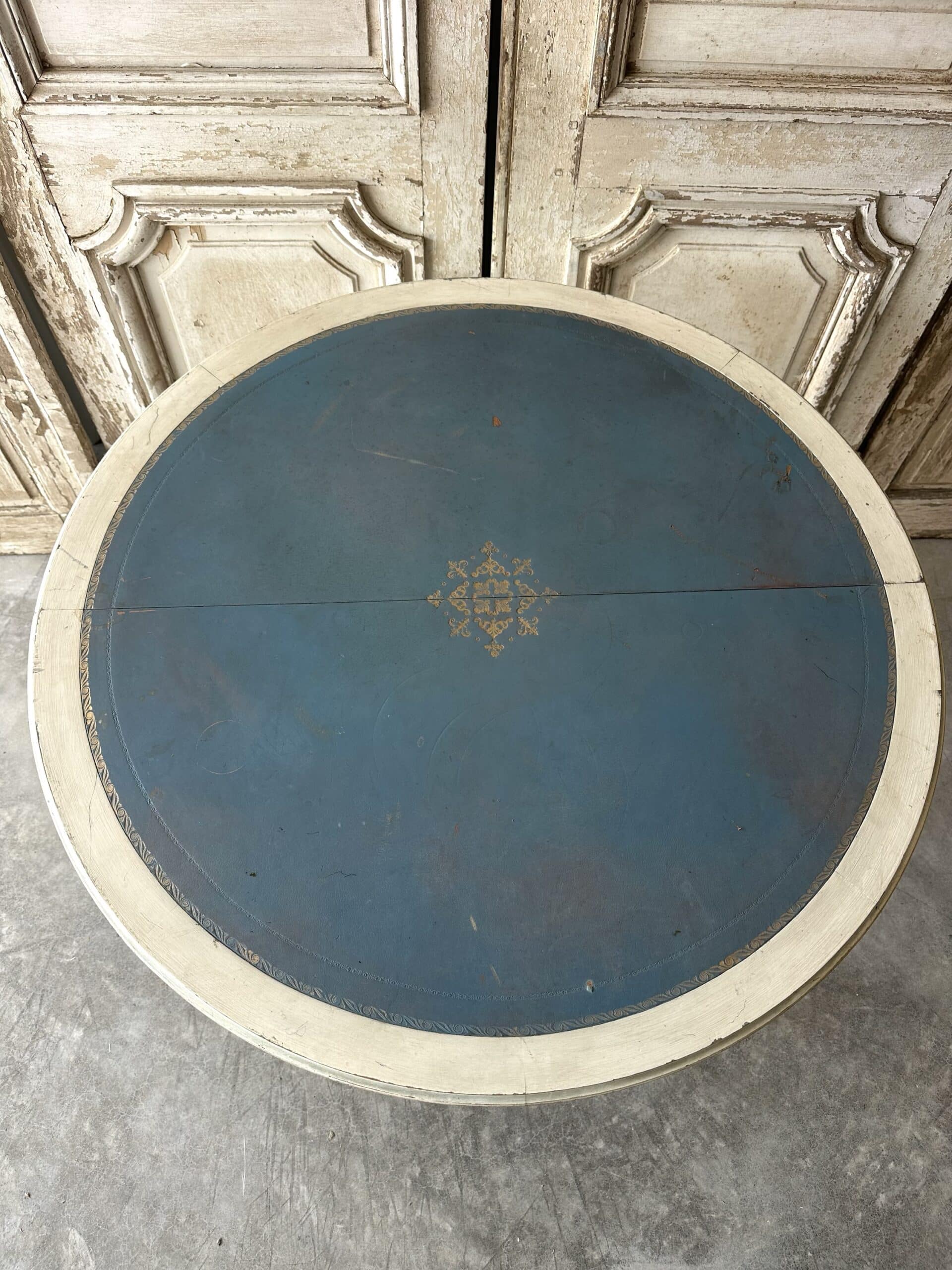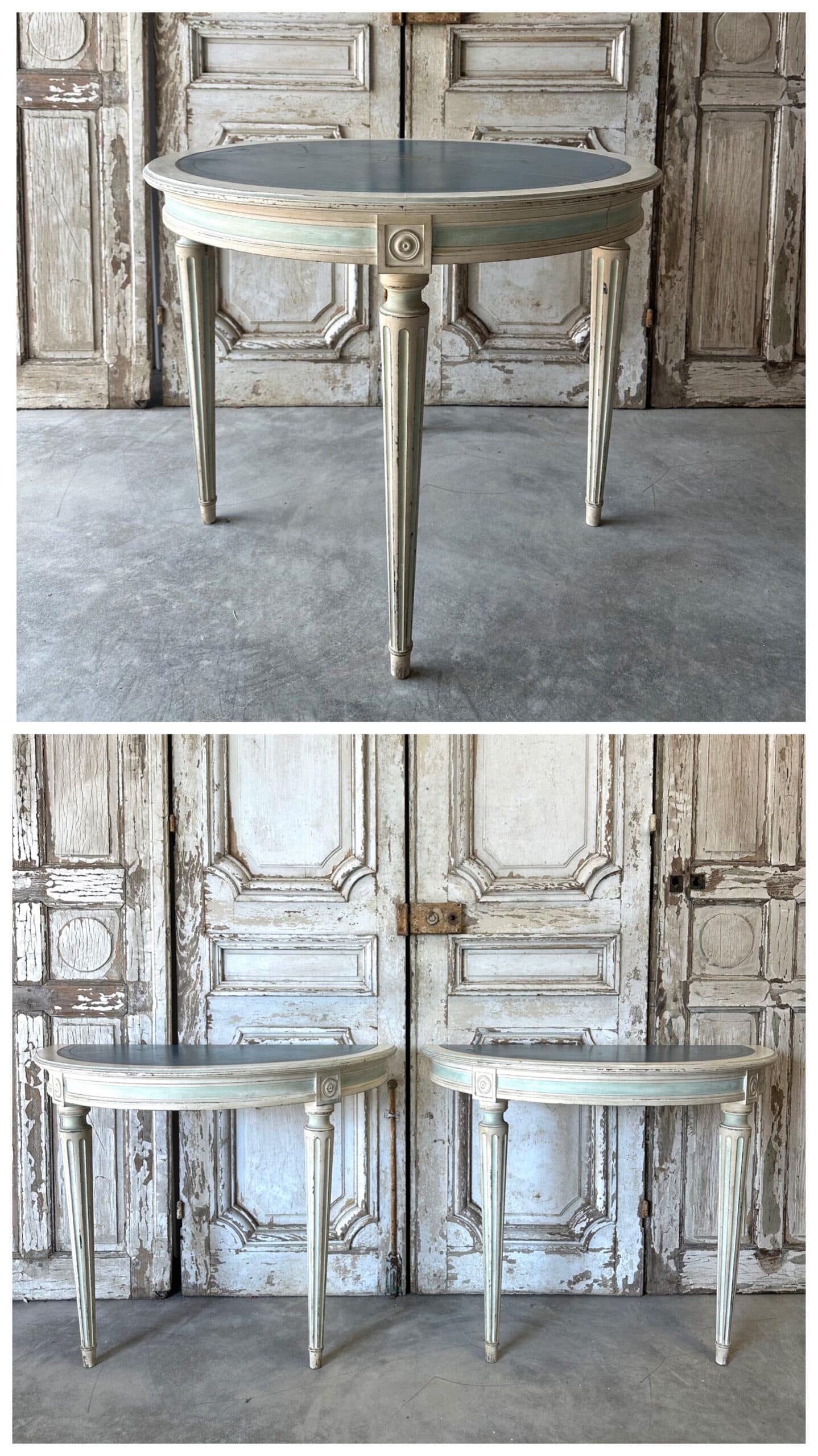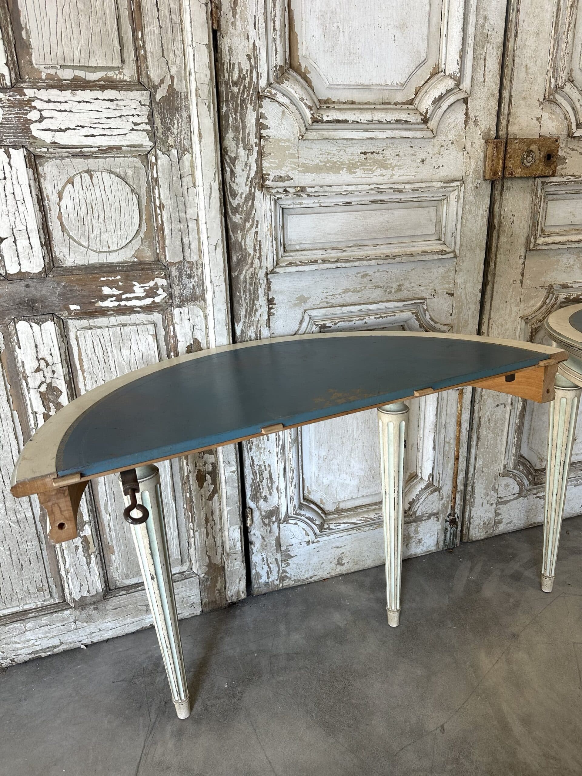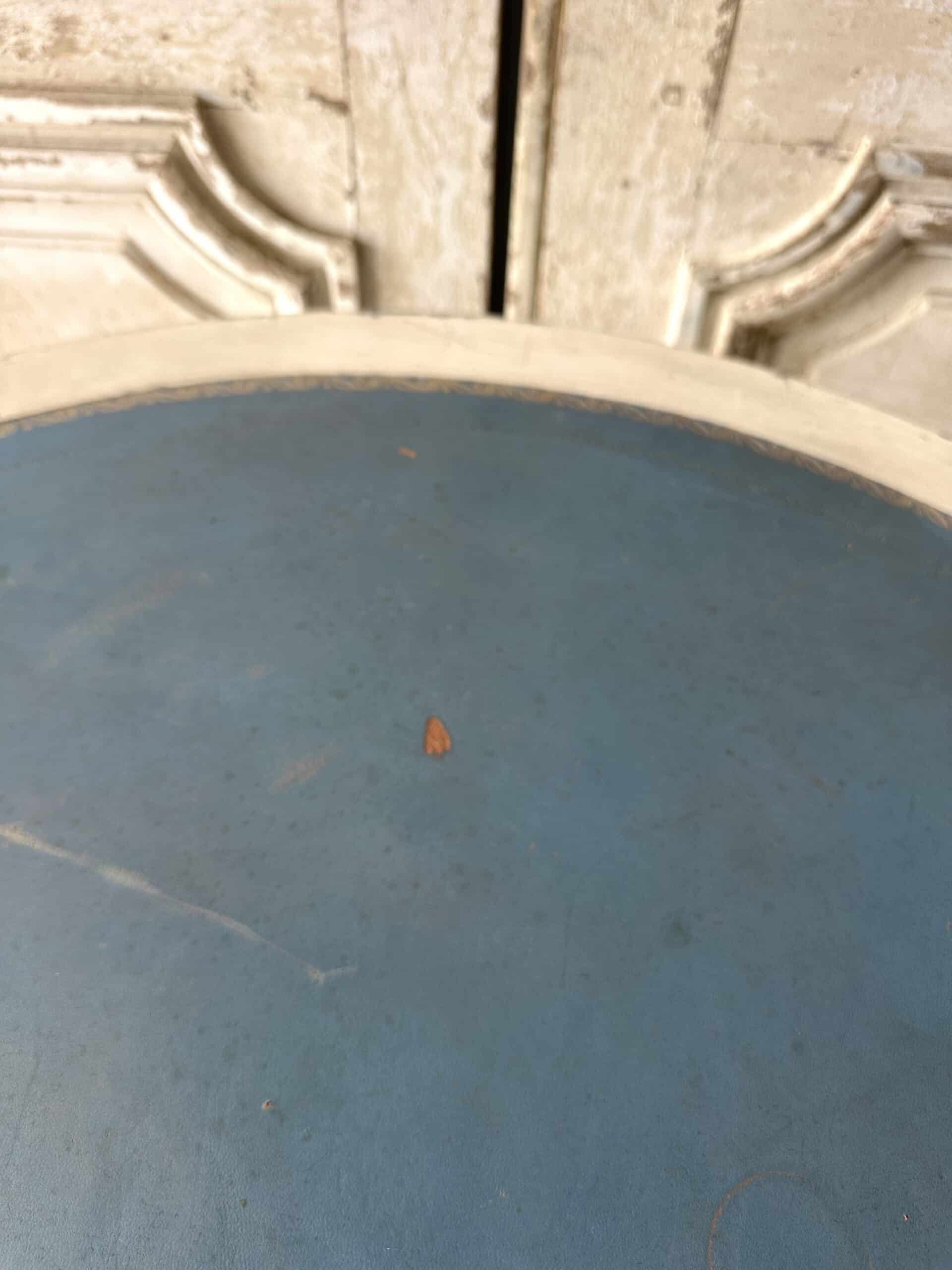 Guéridon de style Louis XVI en bois laqué blanc et rechampi bleu azur circa 1970. Il se sépare en deux parties avec un système de fixation pouvant faire une paire de consoles d’applique en retirant le système et les tenons.