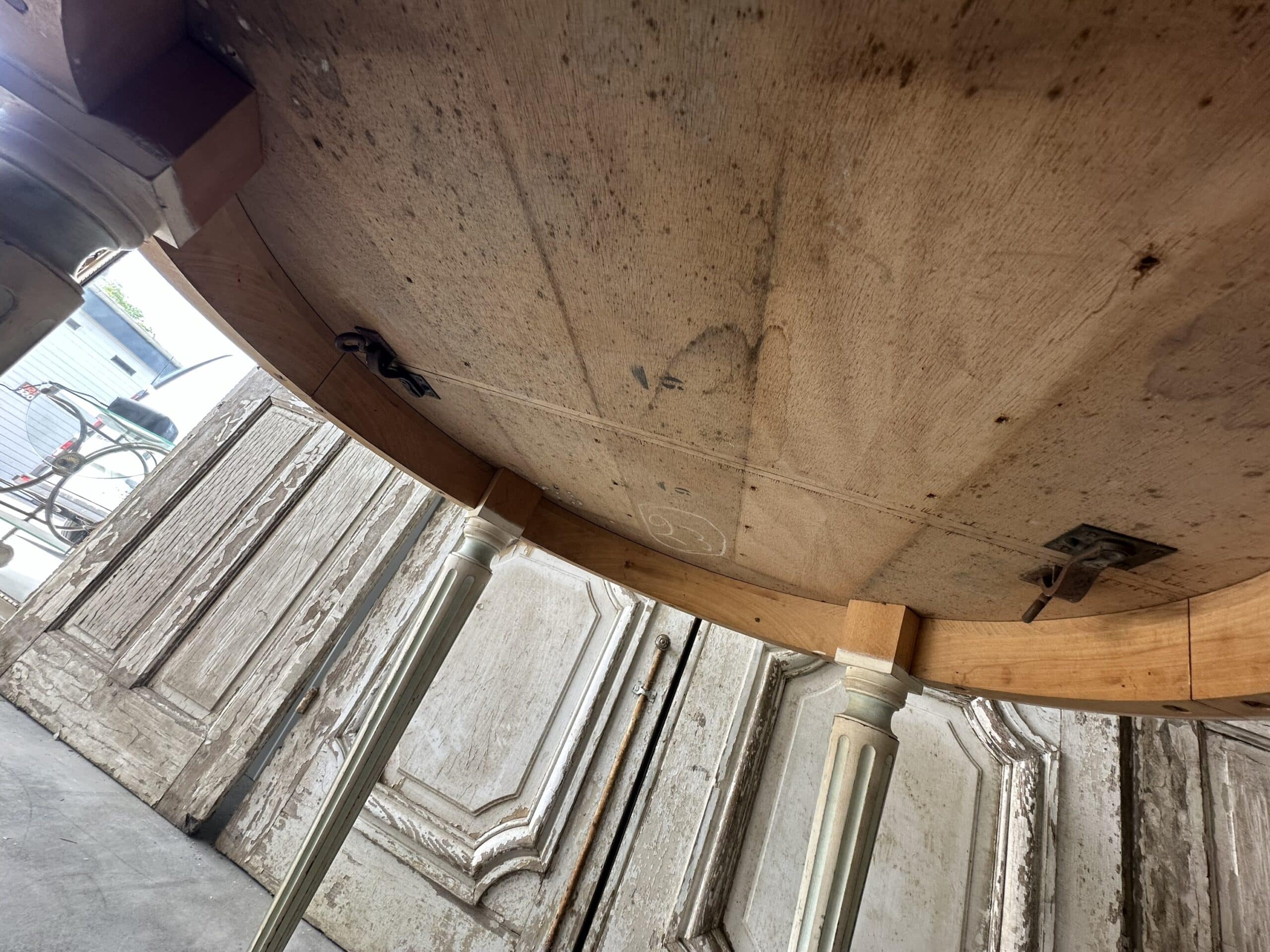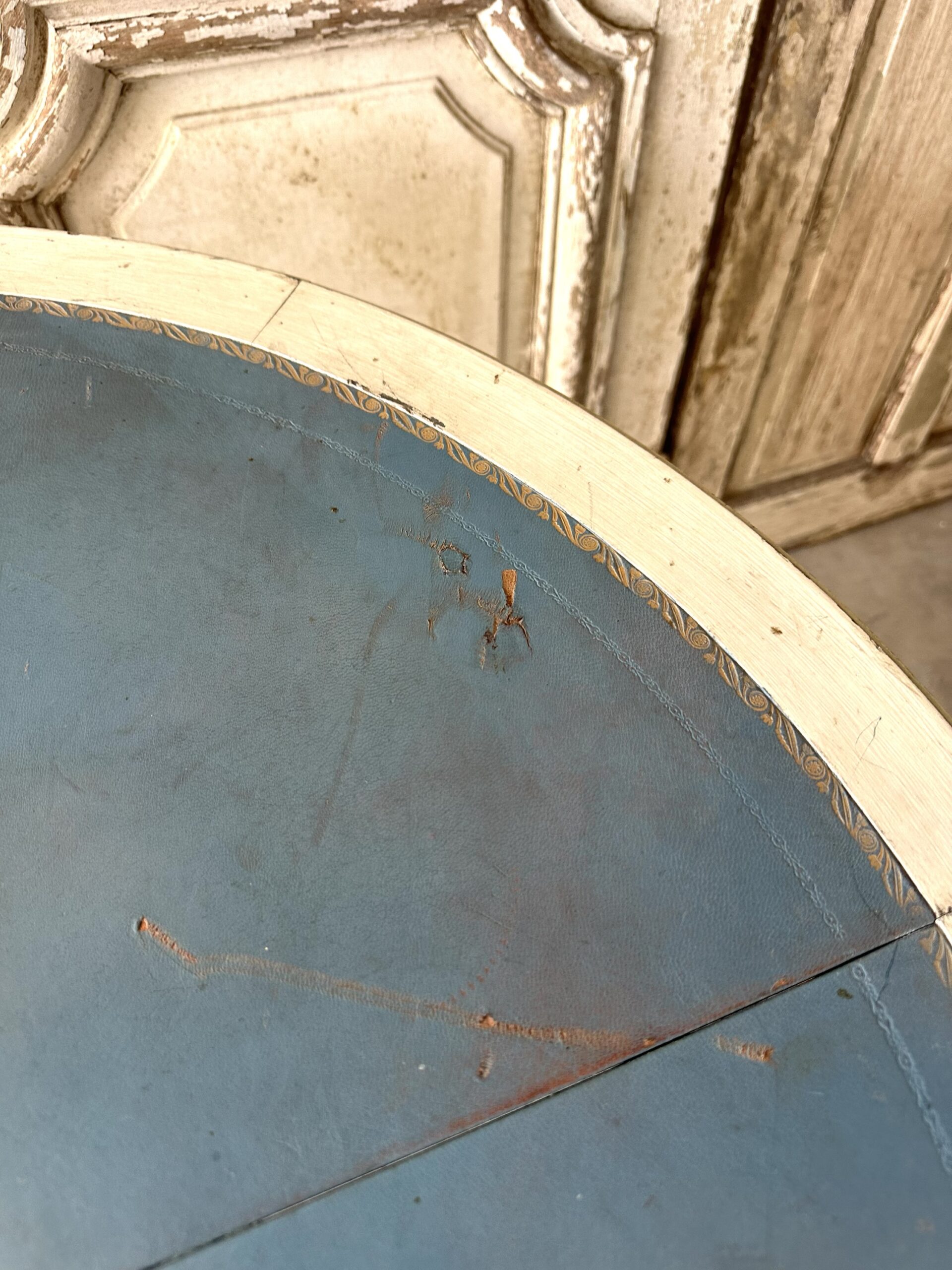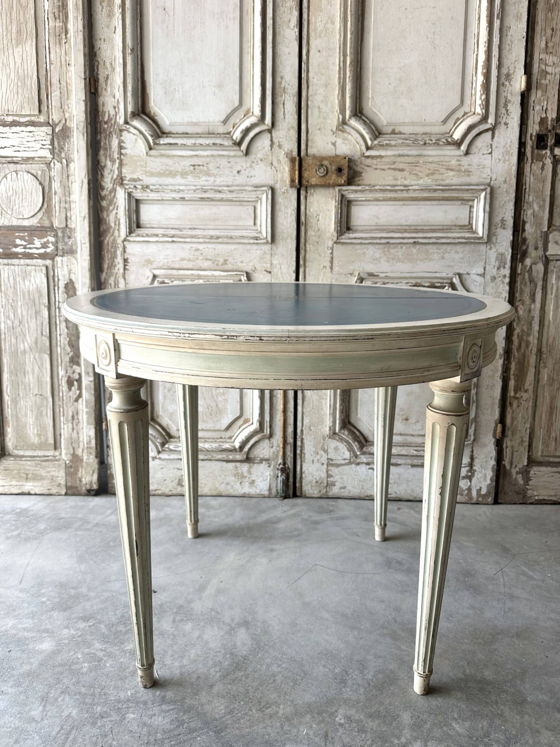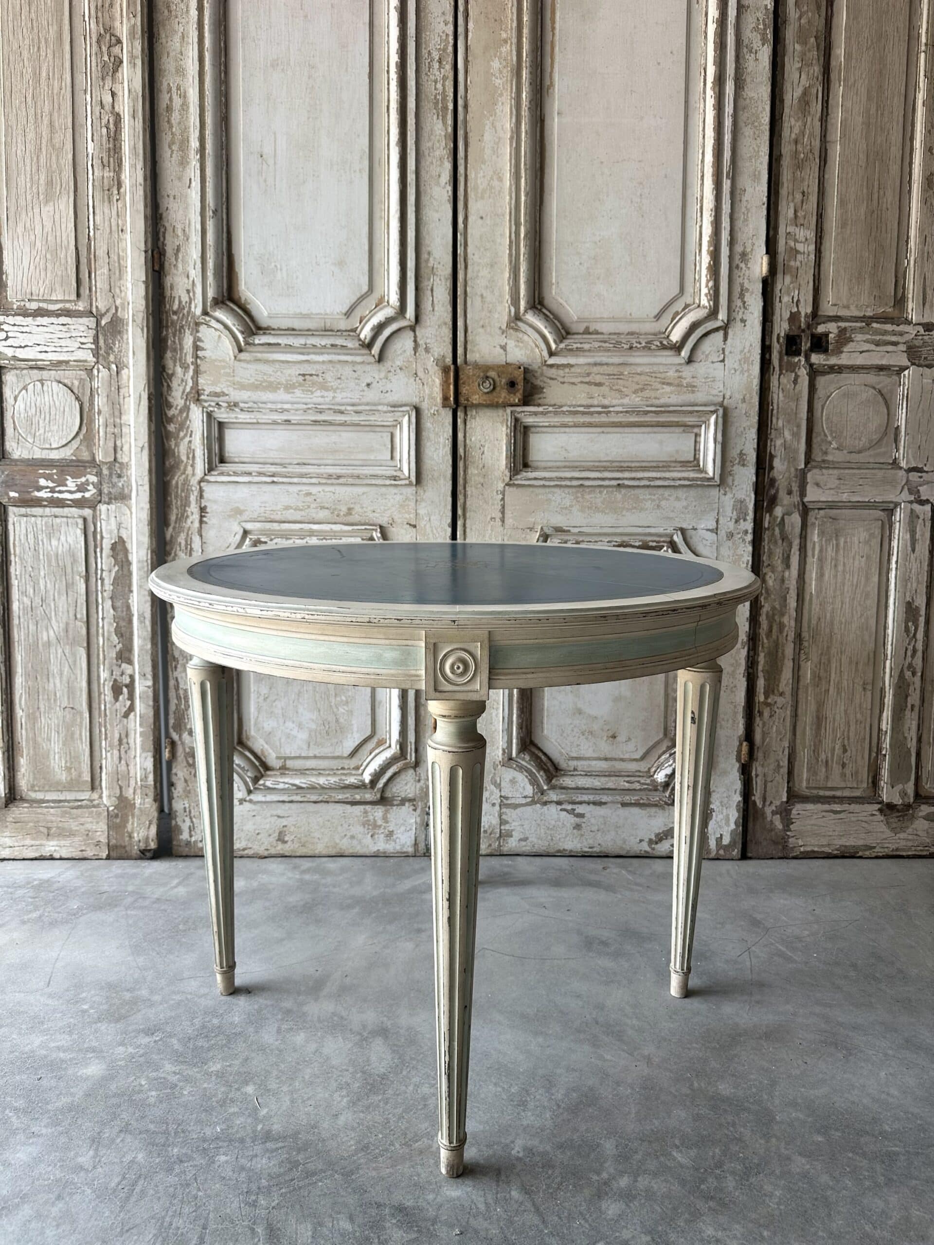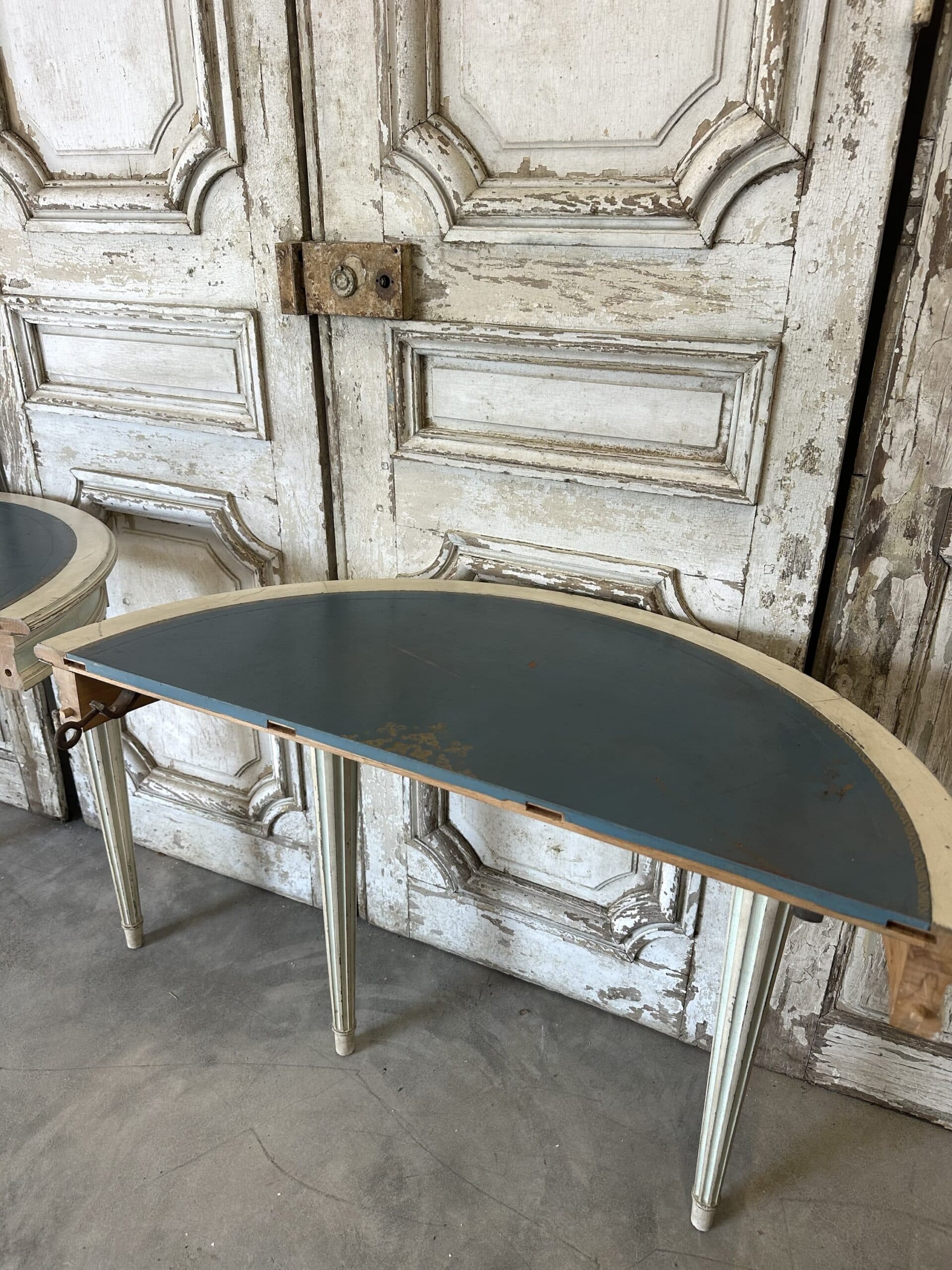 Guéridon de style Louis XVI en bois laqué blanc et rechampi bleu azur circa 1970. Il se sépare en deux parties avec un système de fixation pouvant faire une paire de consoles d’applique en retirant le système et les tenons.