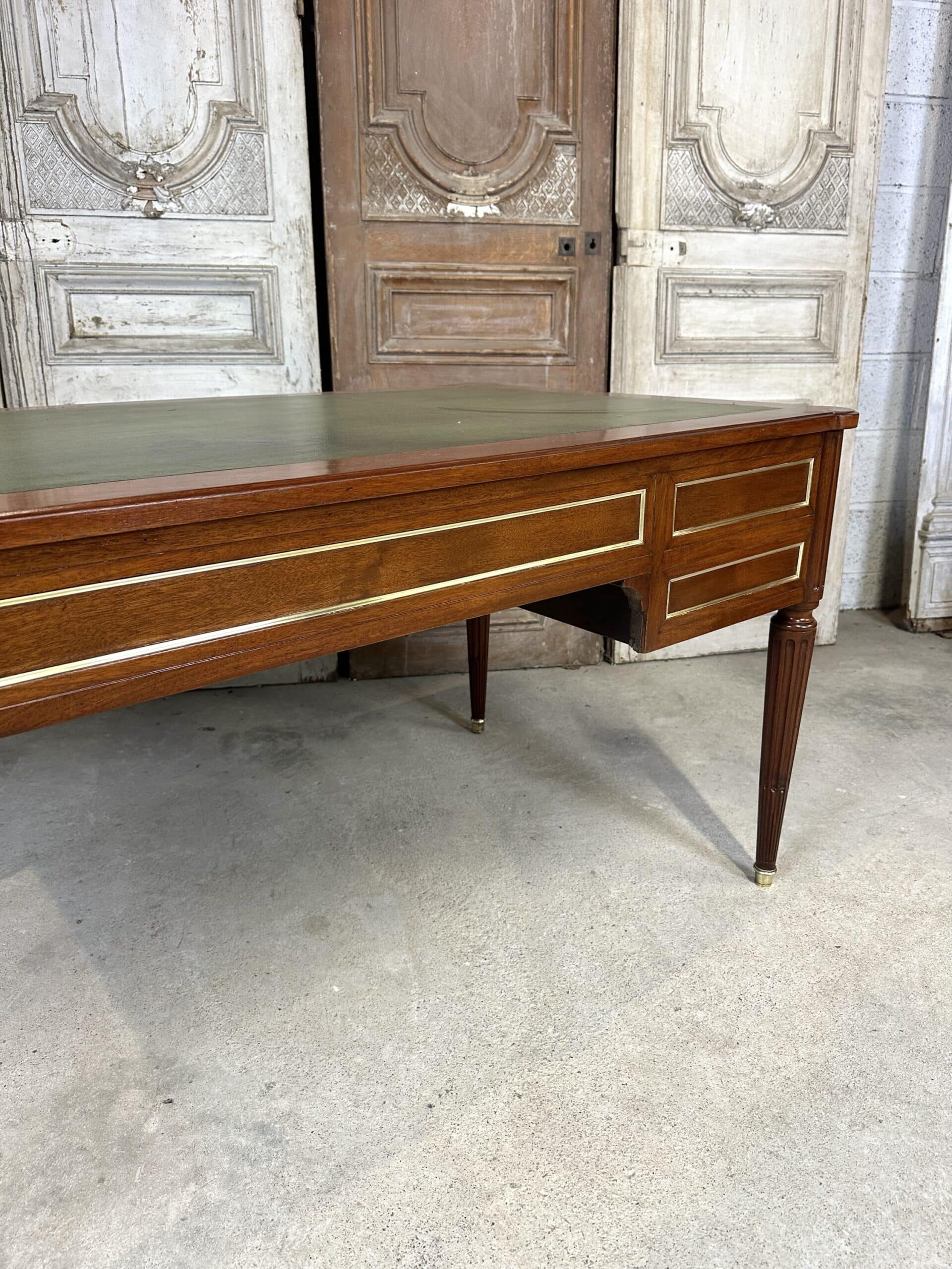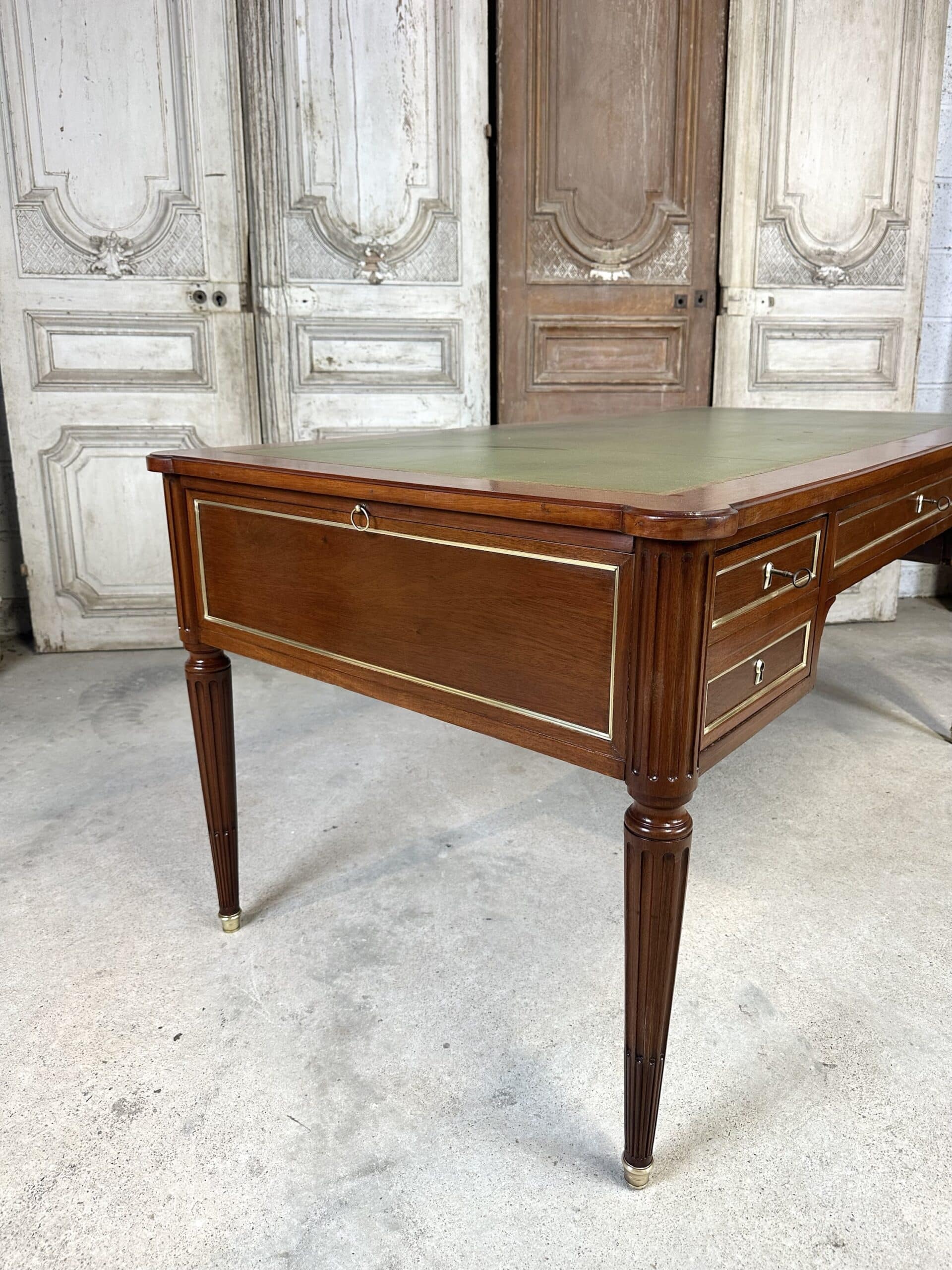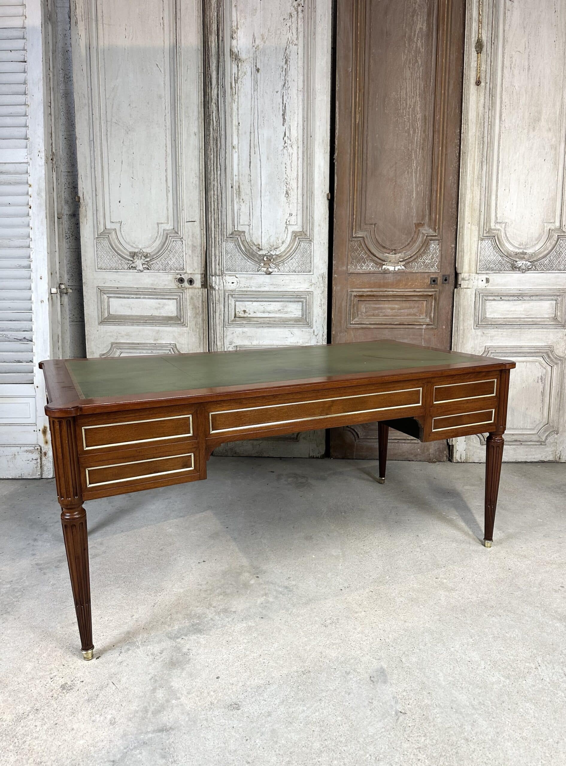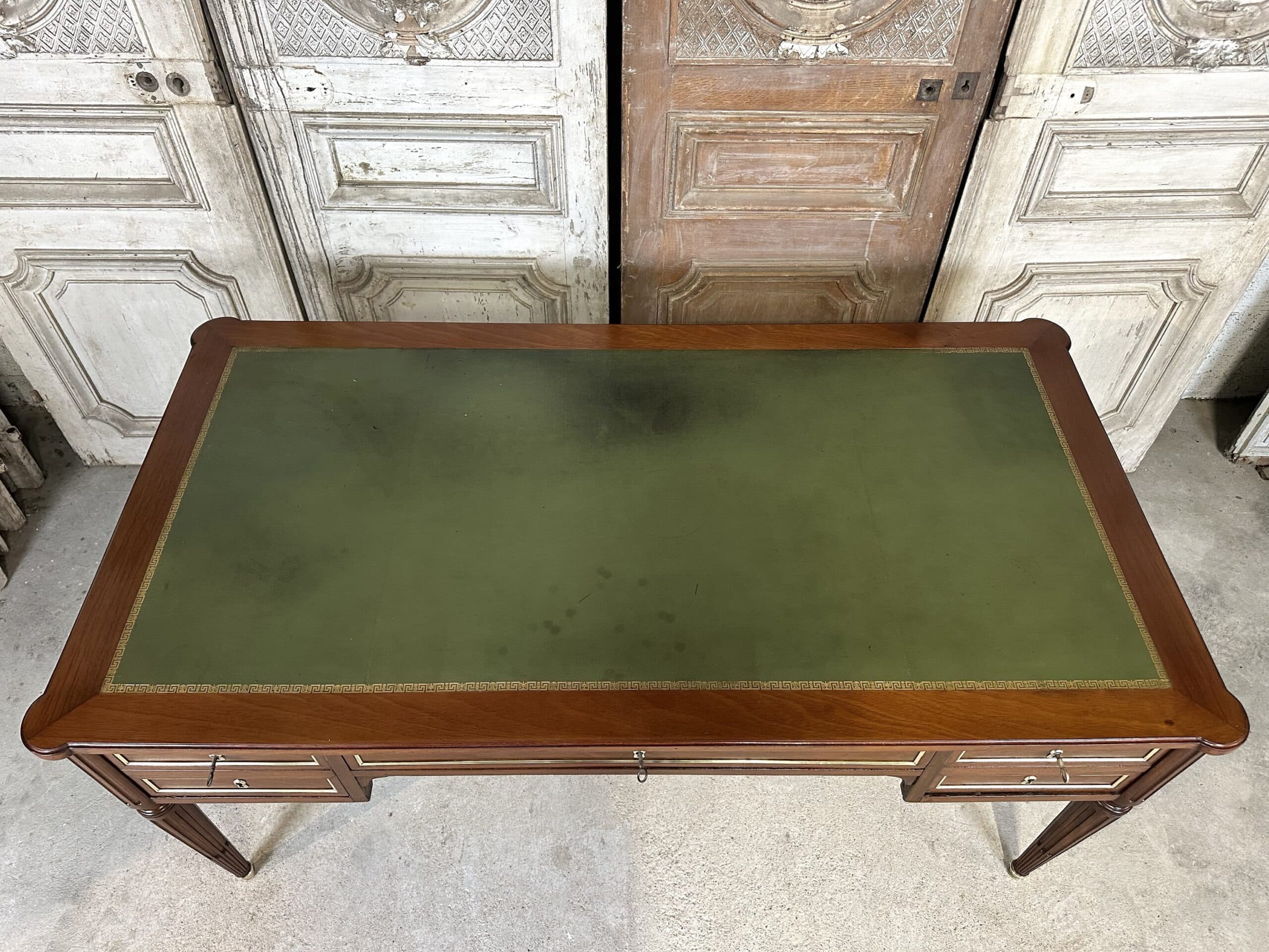 Bureau plat de style Louis XVI en acajou et placage d’acajou circa 1950. Dessus en cuir vert avec deux tirettes. Façade ouvrant à trois tiroirs dont un avec une séparation à droite. Pieds fuselés à cannelures rudentées se terminant par des sabots en bronze. Coté invité avec des simples baguettes en laiton. Clés et serrures non d’origine. Restauré dans un atelier.