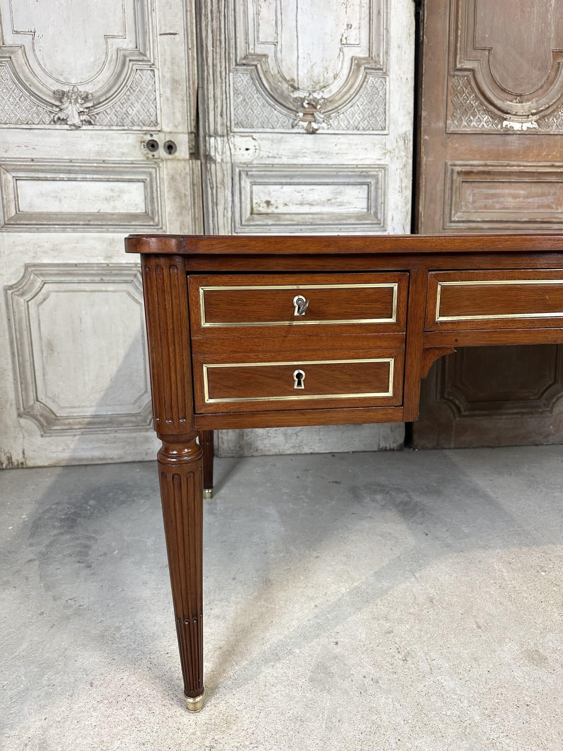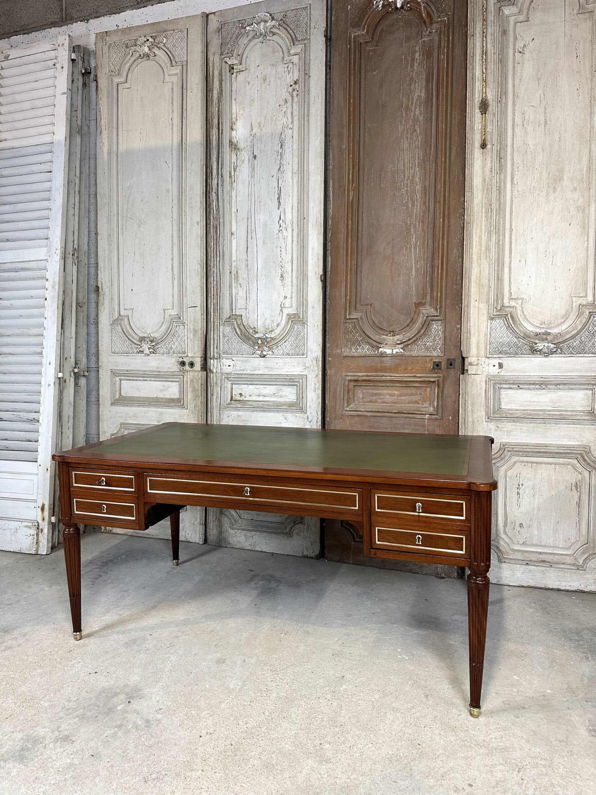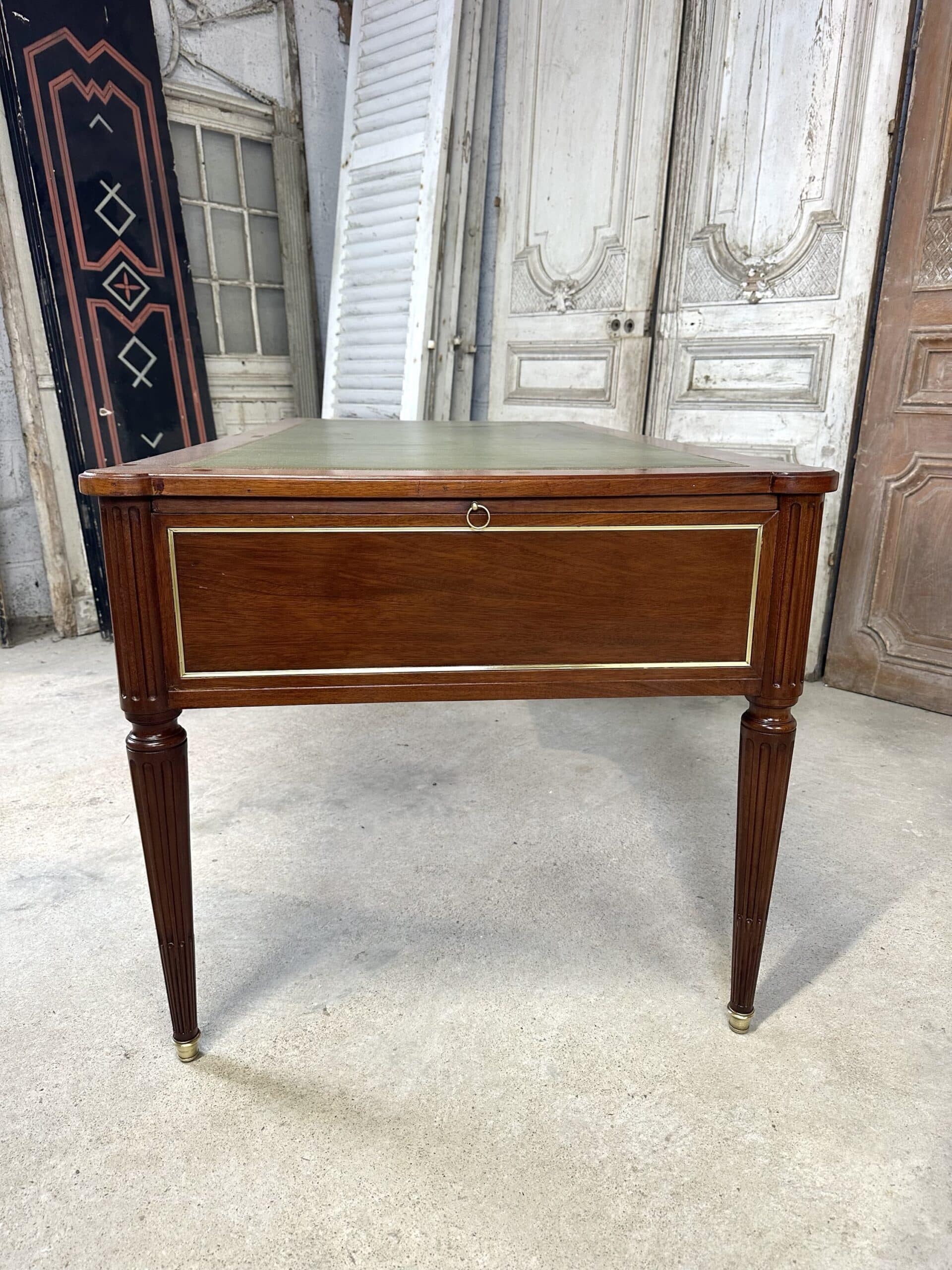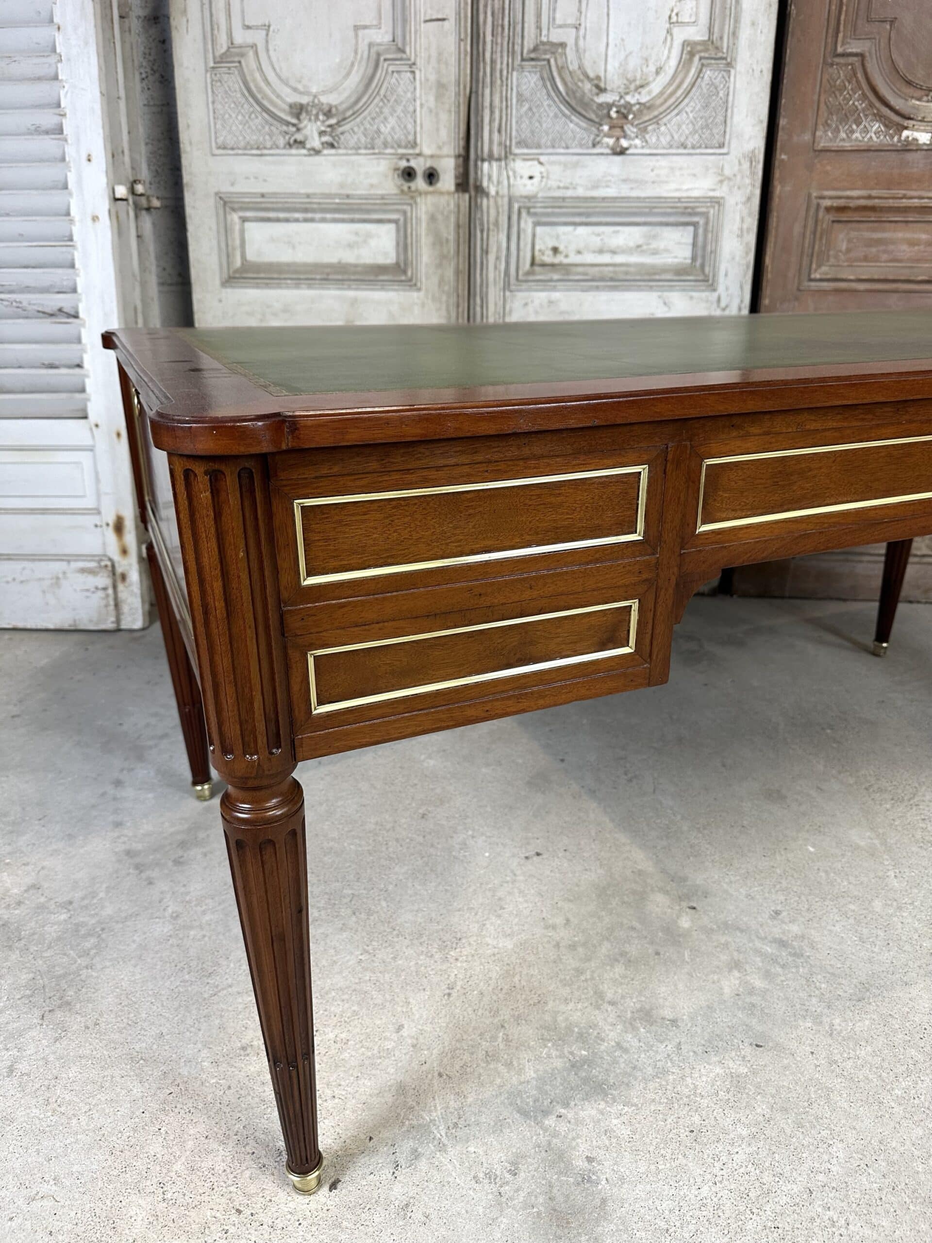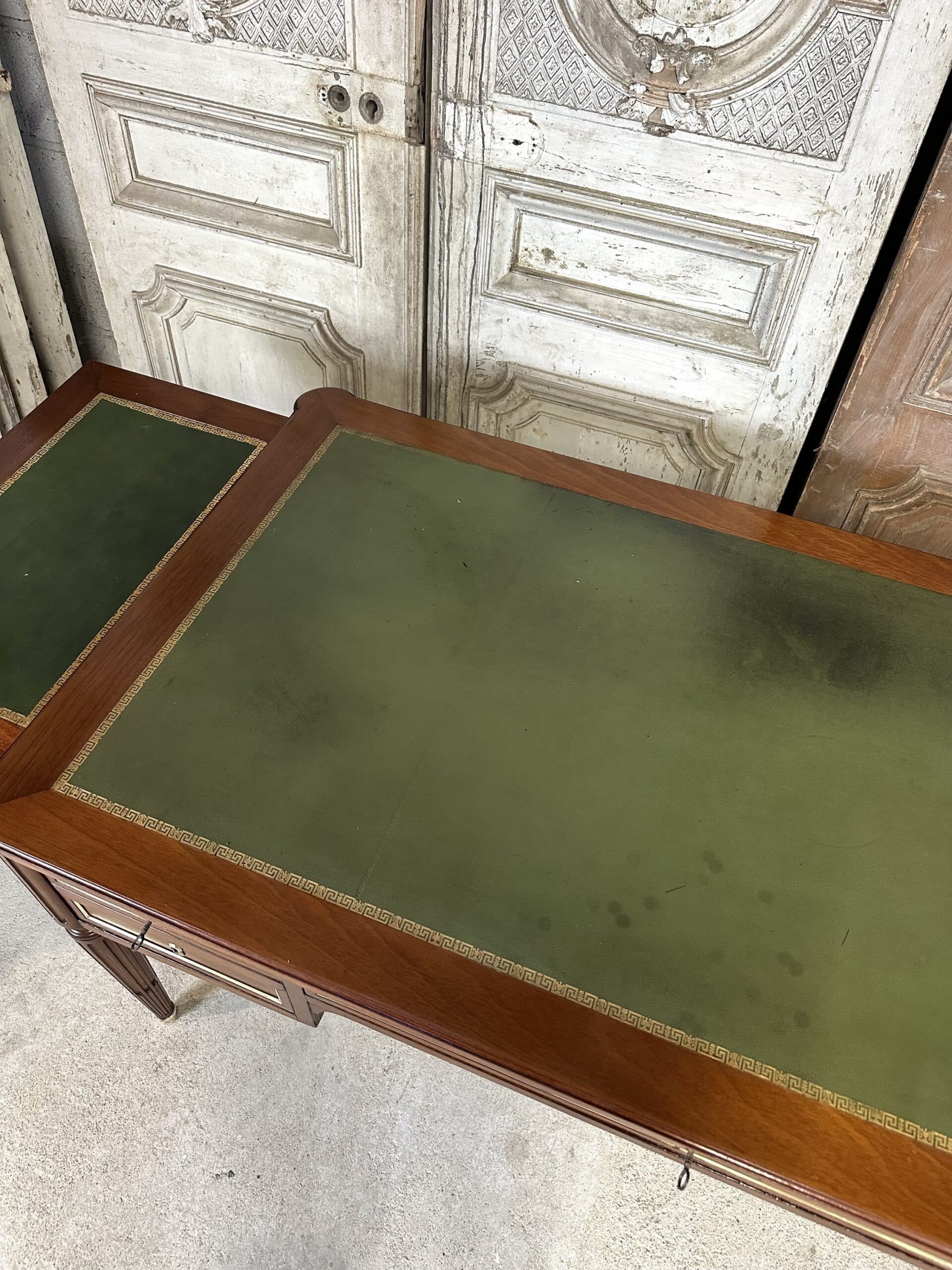 Bureau plat de style Louis XVI en acajou et placage d’acajou circa 1950. Dessus en cuir vert avec deux tirettes. Façade ouvrant à trois tiroirs dont un avec une séparation à droite. Pieds fuselés à cannelures rudentées se terminant par des sabots en bronze. Coté invité avec des simples baguettes en laiton. Clés et serrures non d’origine. Restauré dans un atelier.