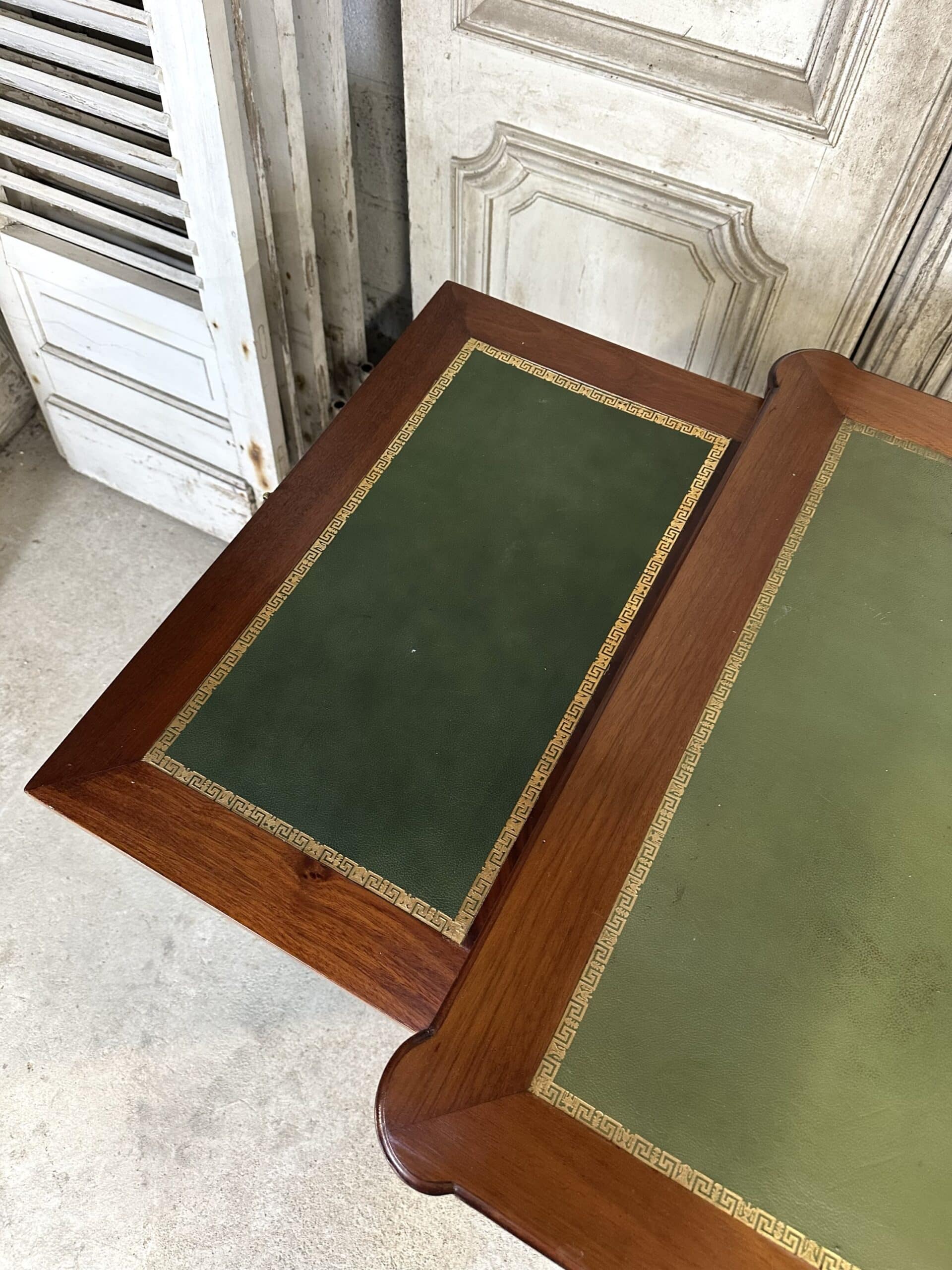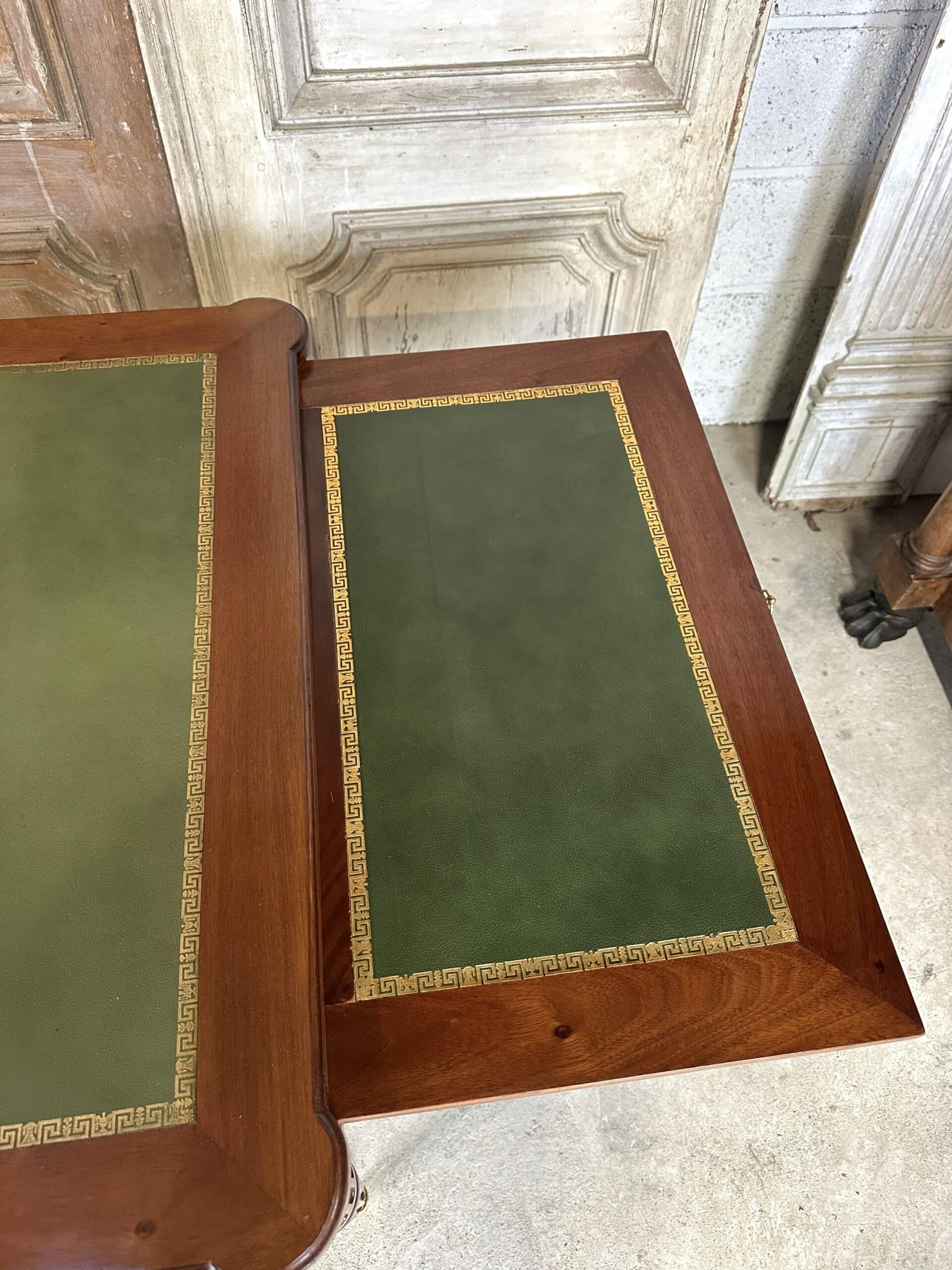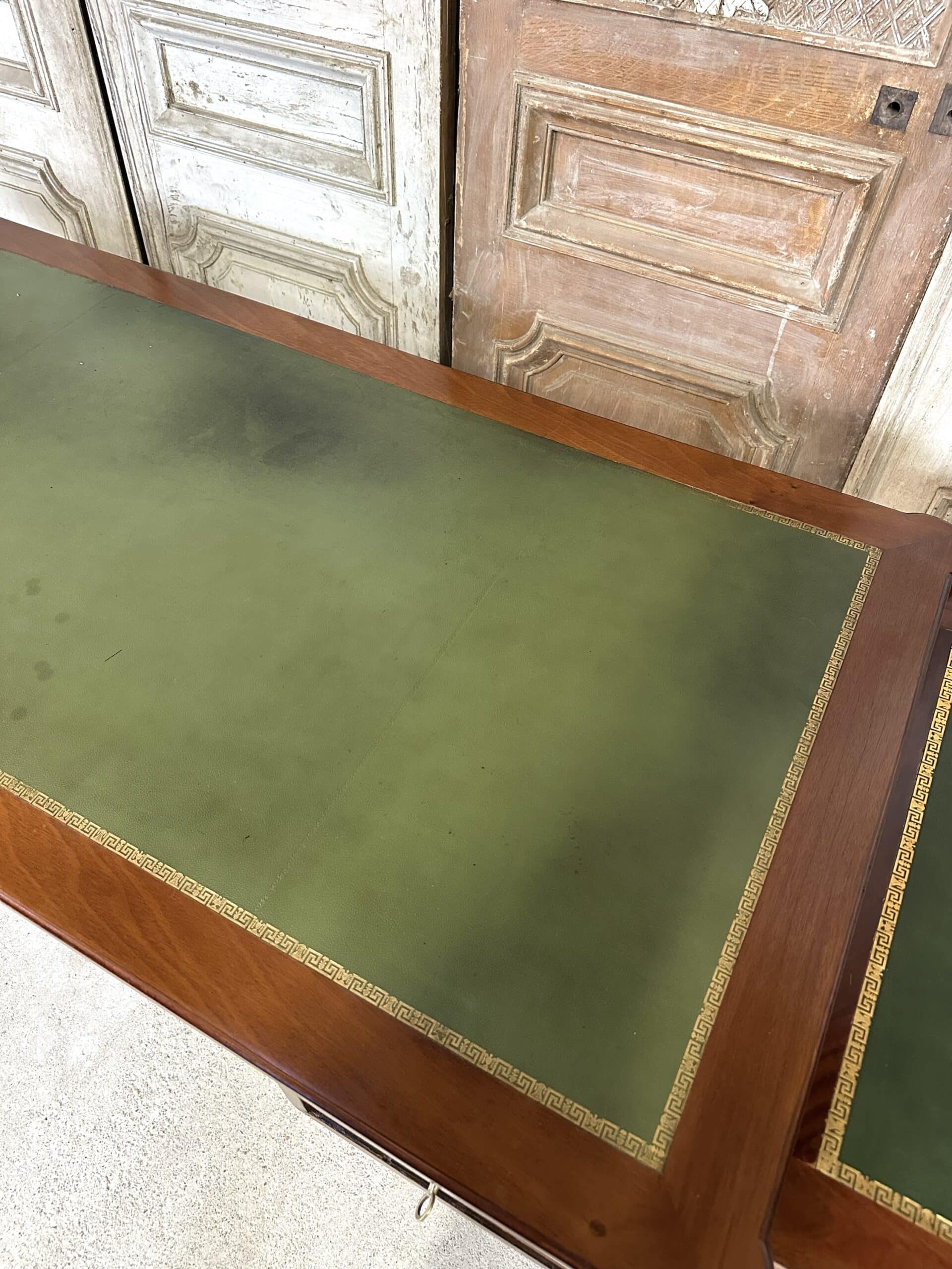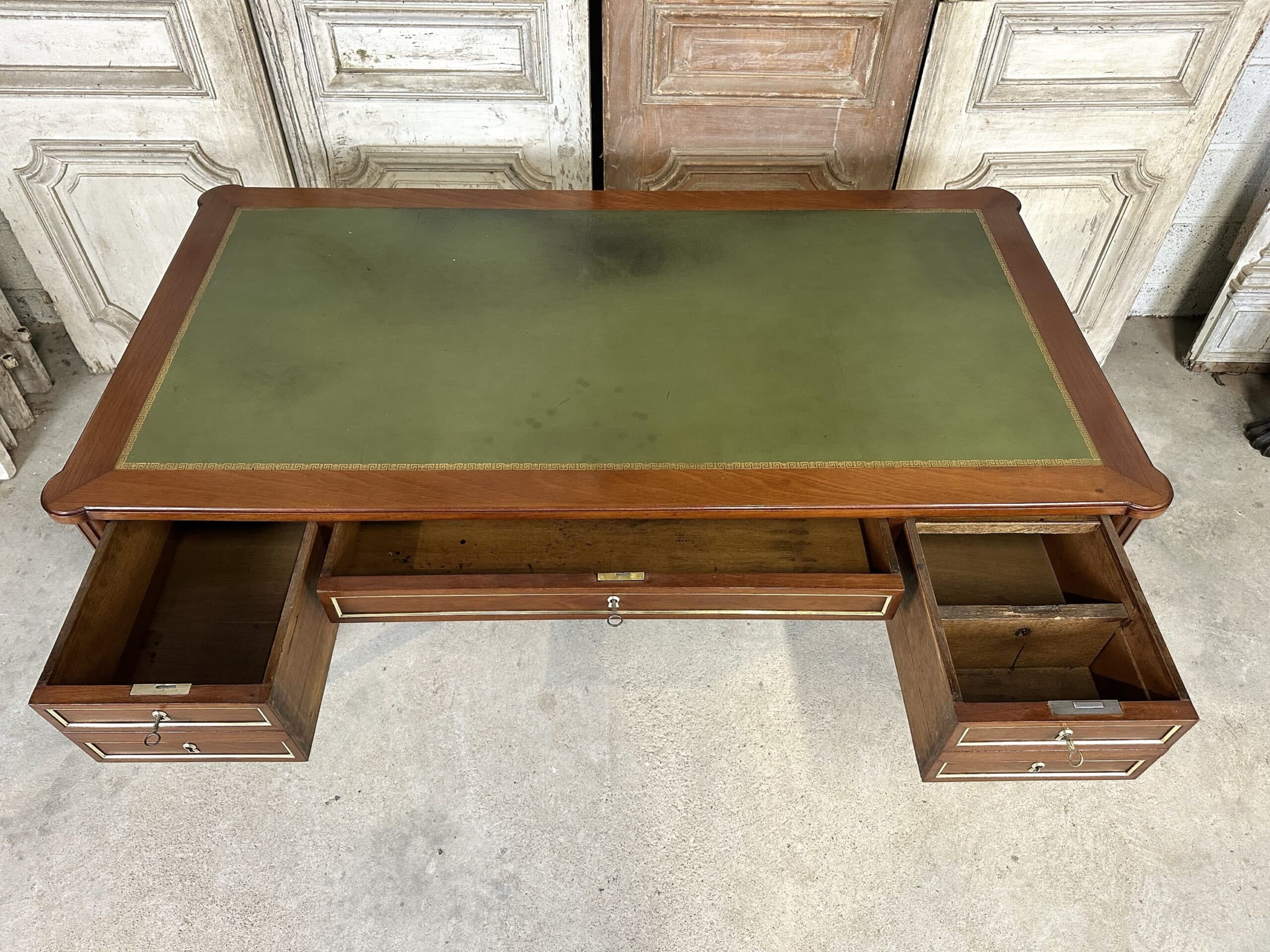 Bureau plat de style Louis XVI en acajou et placage d’acajou circa 1950. Dessus en cuir vert avec deux tirettes. Façade ouvrant à trois tiroirs dont un avec une séparation à droite. Pieds fuselés à cannelures rudentées se terminant par des sabots en bronze. Coté invité avec des simples baguettes en laiton. Clés et serrures non d’origine. Restauré dans un atelier.