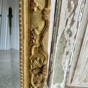 Miroir en bois doré d’époque XVIIIe siècle. Fronton ajouré et cadre à décor de fleurs, acanthes et fine sculpture en arrière plan de motifs géométriques. Glace biseauté au mercure(usures). Quelques éclats à signaler, restauration sur devis possible.