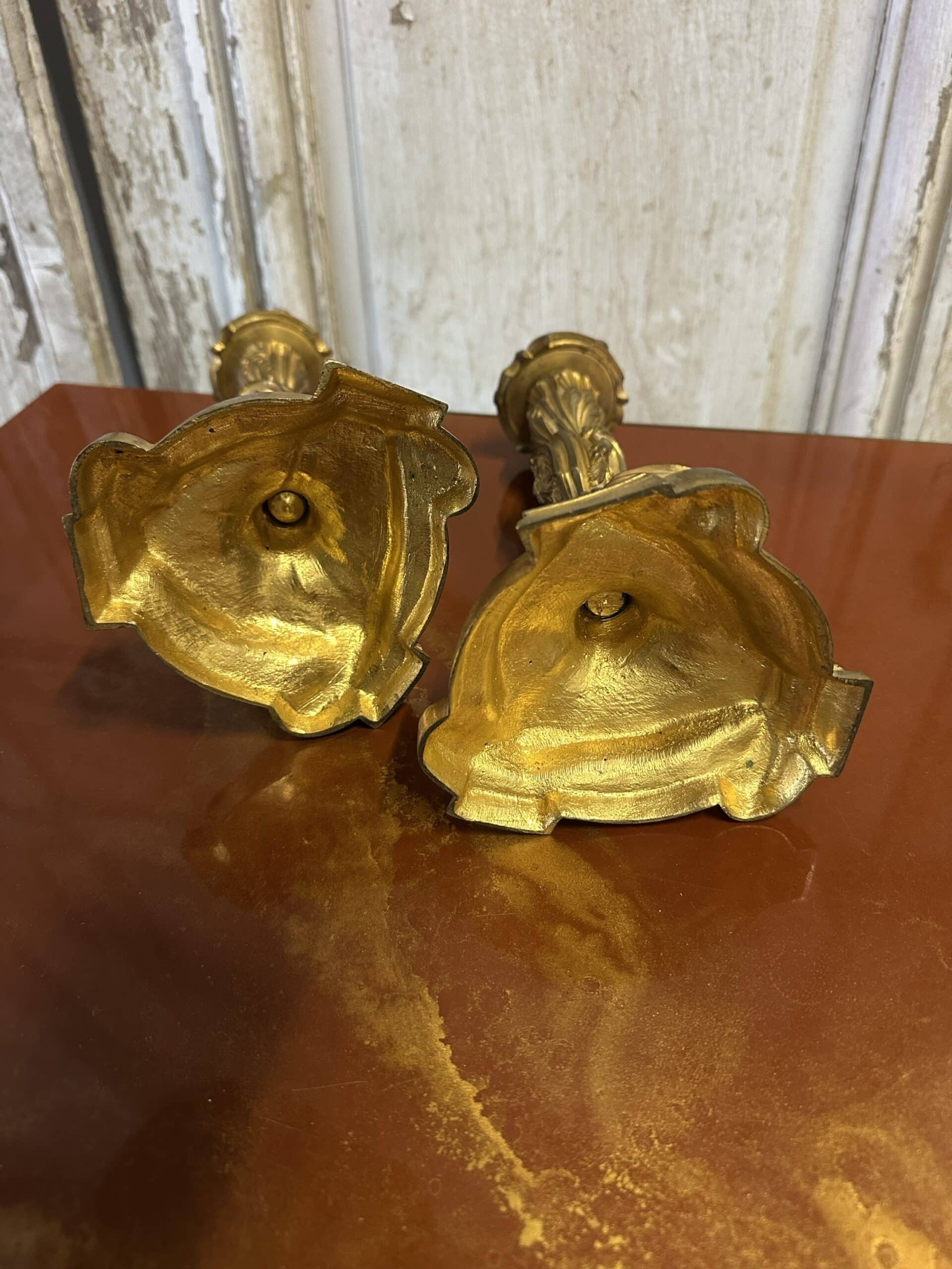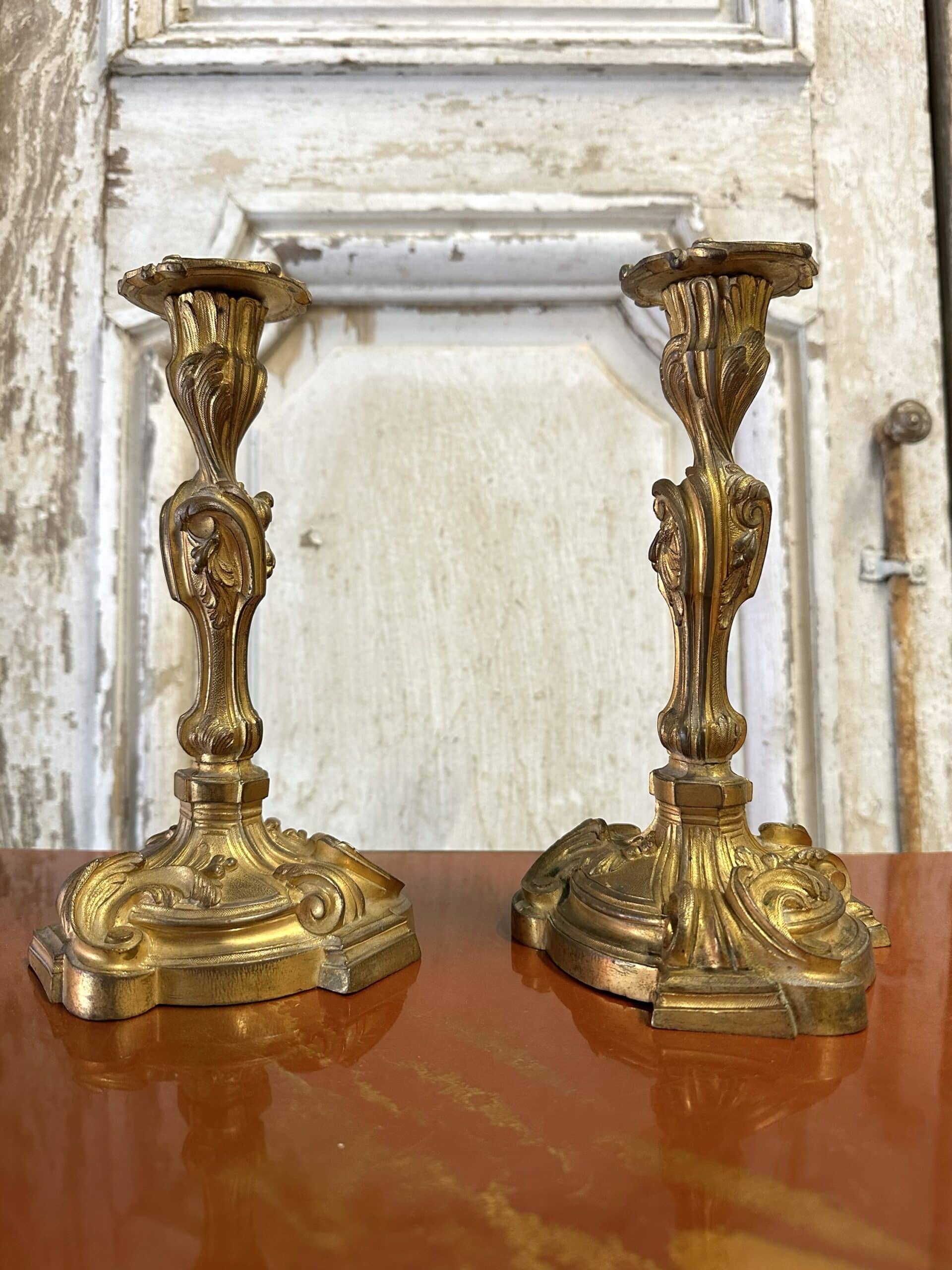 Paire de bougeoirs en bronze de style Louis XV / Rocaille circa 1920. Bon état quelques usures à la dorures.