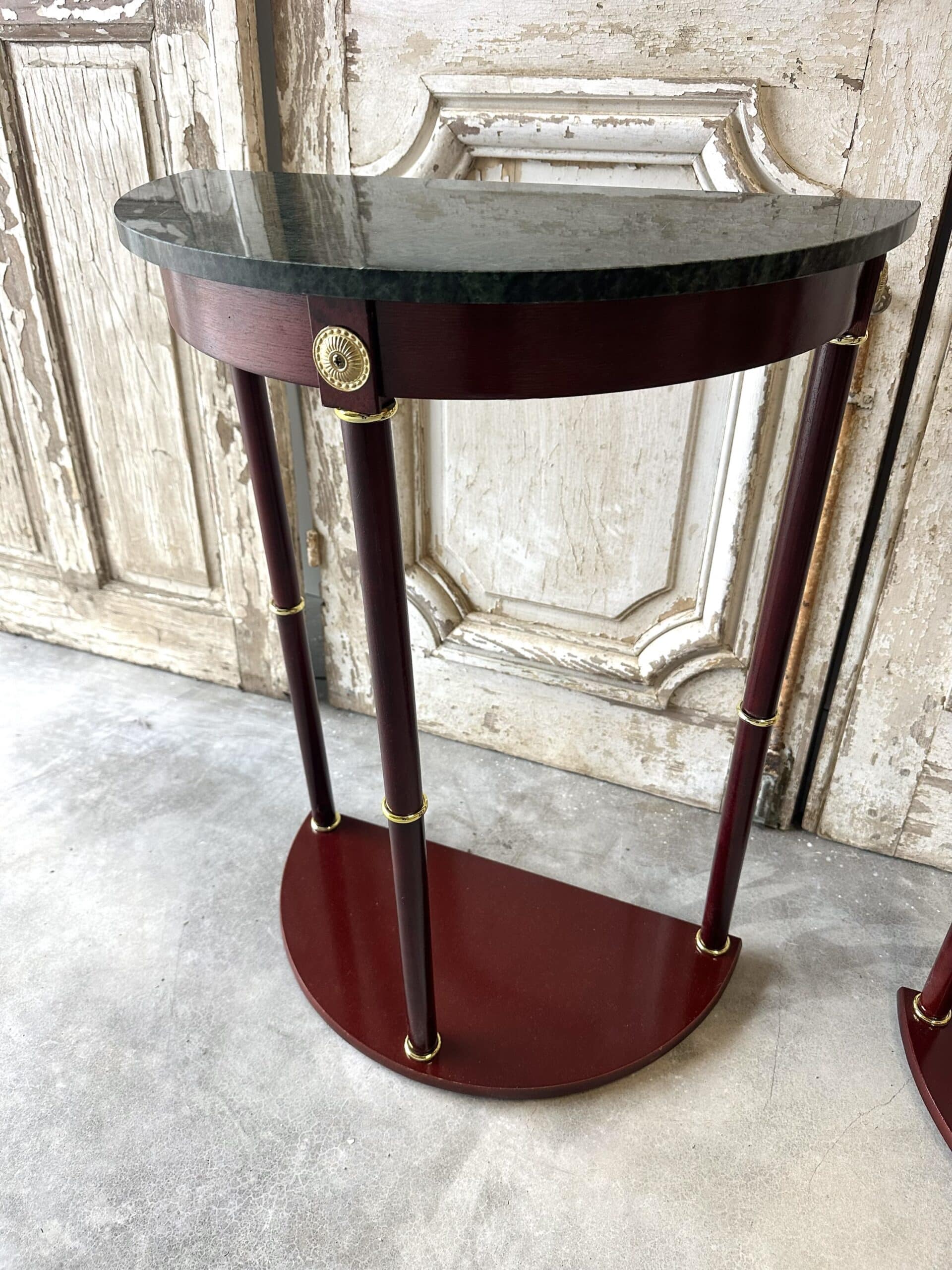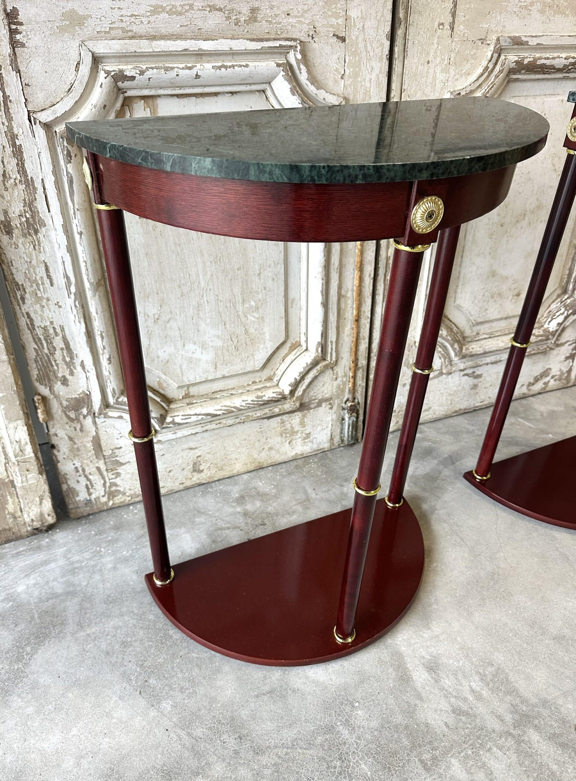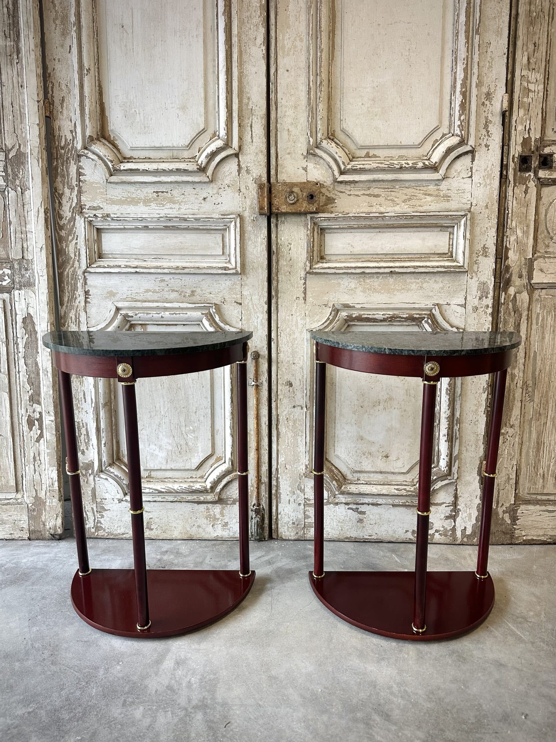 Paire de consoles / tables / chevets en acajou avec un dessus marbre vert de forme demi-lune. Les colonnes sont ornées de bagues. Bon état d’origine. À signaler qu’il s’agit d’une production tardive du 20e siècle.