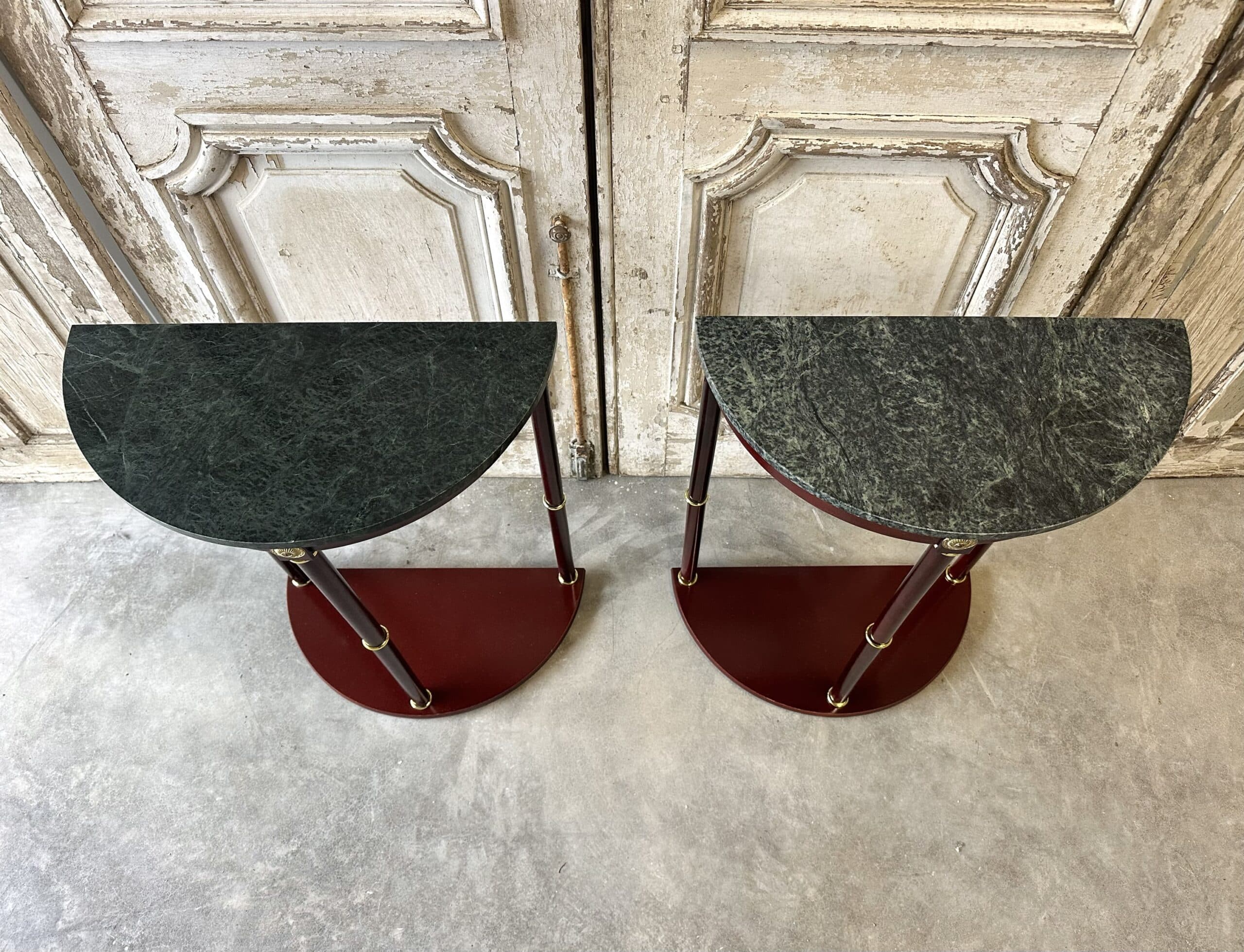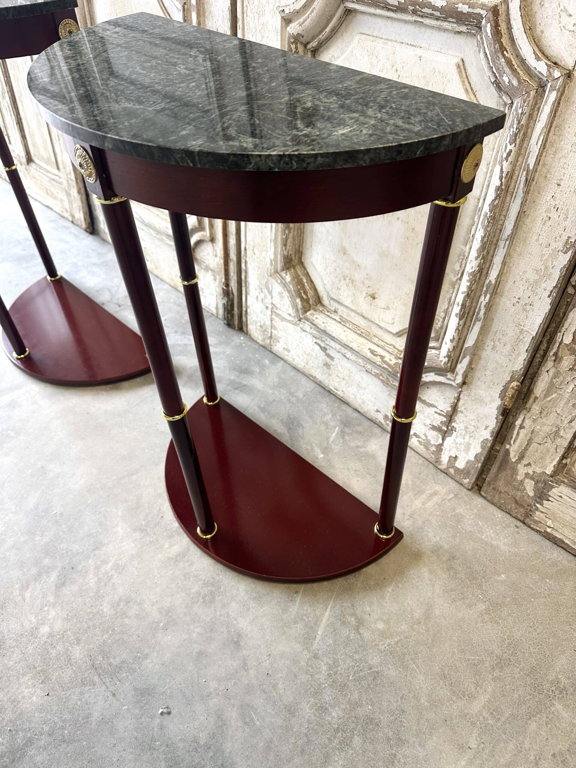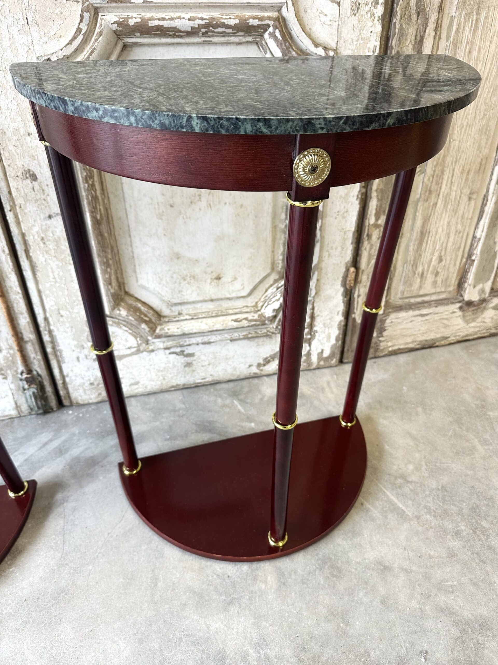 Paire de consoles / tables / chevets en acajou avec un dessus marbre vert de forme demi-lune. Les colonnes sont ornées de bagues. Bon état d’origine. À signaler qu’il s’agit d’une production tardive du 20e siècle.