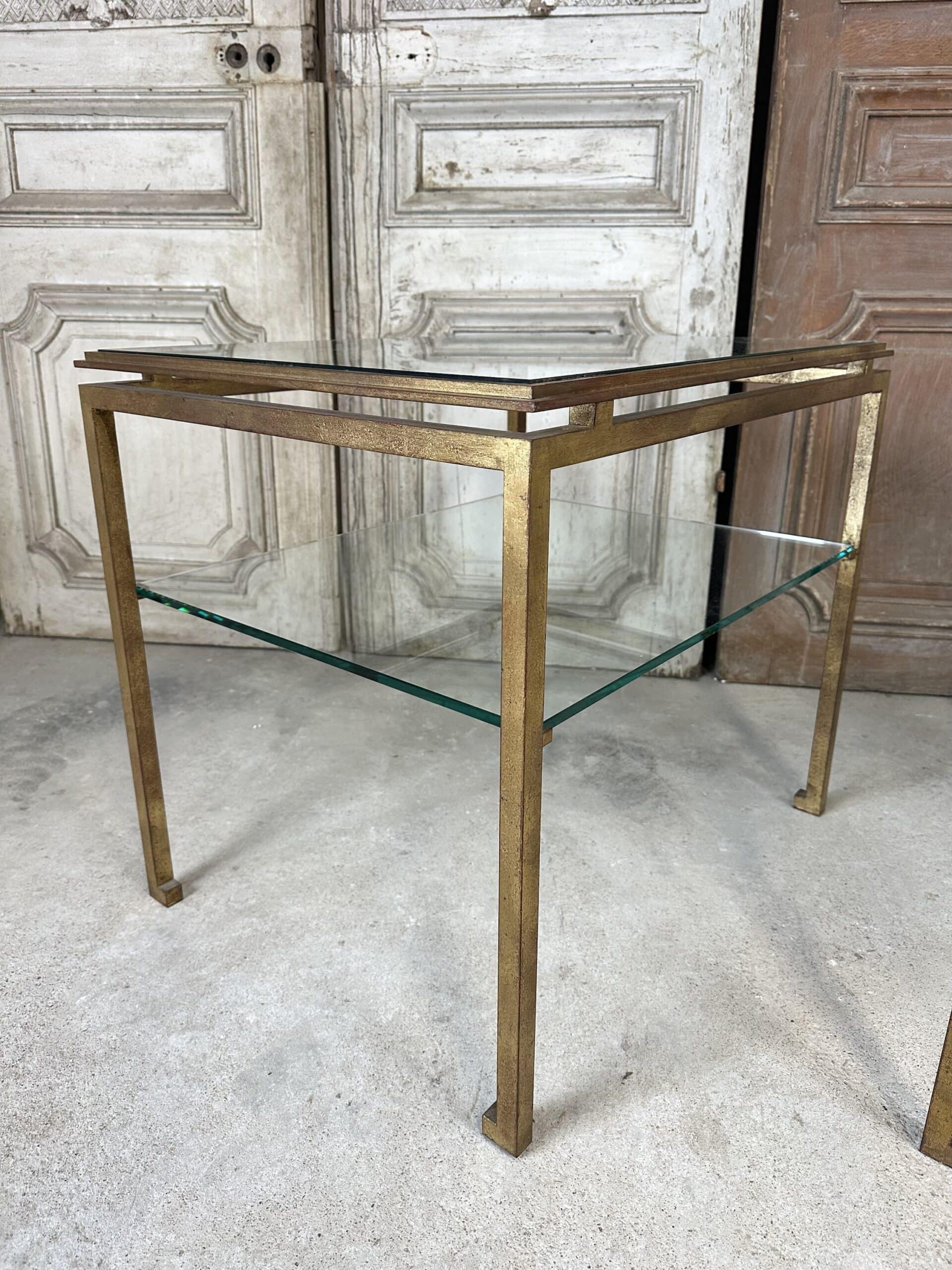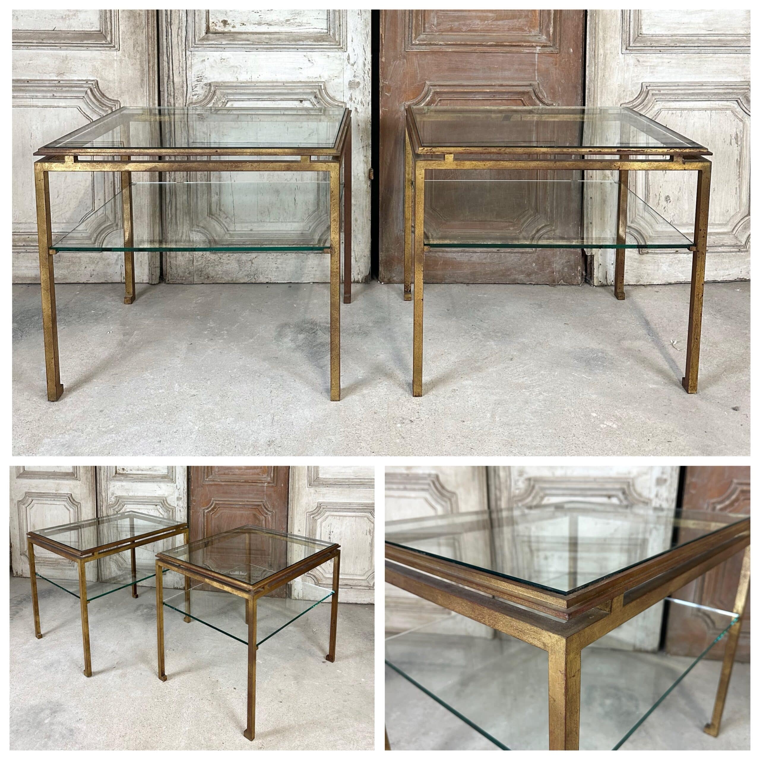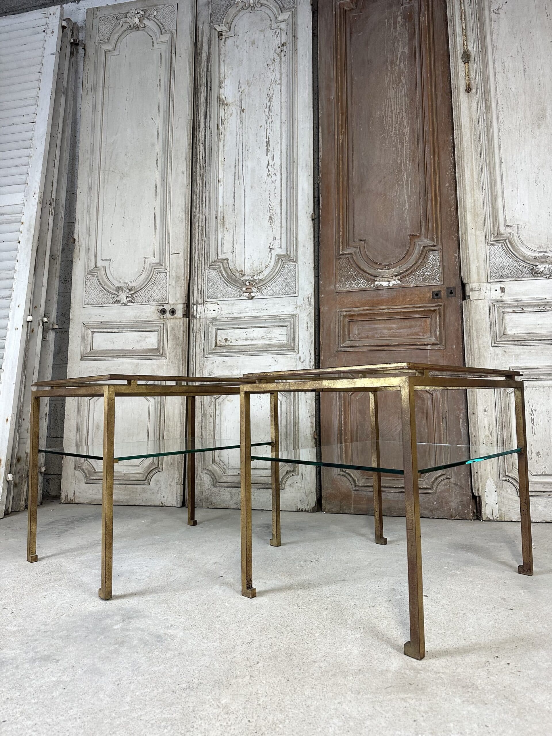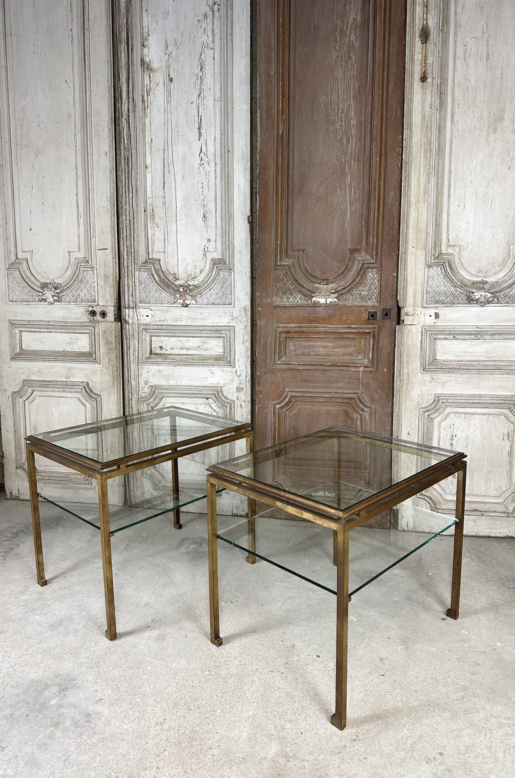 Paire de tables en fer battu doré attribuée à la Maison RAMSAY époque 20e siècle. Double plateau en verre transparent. Modèle dit « étrier » avec les pieds à angle droit.
