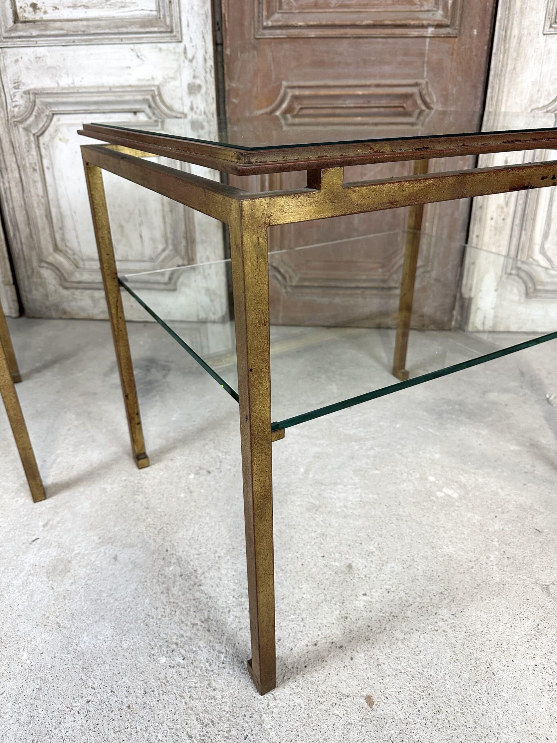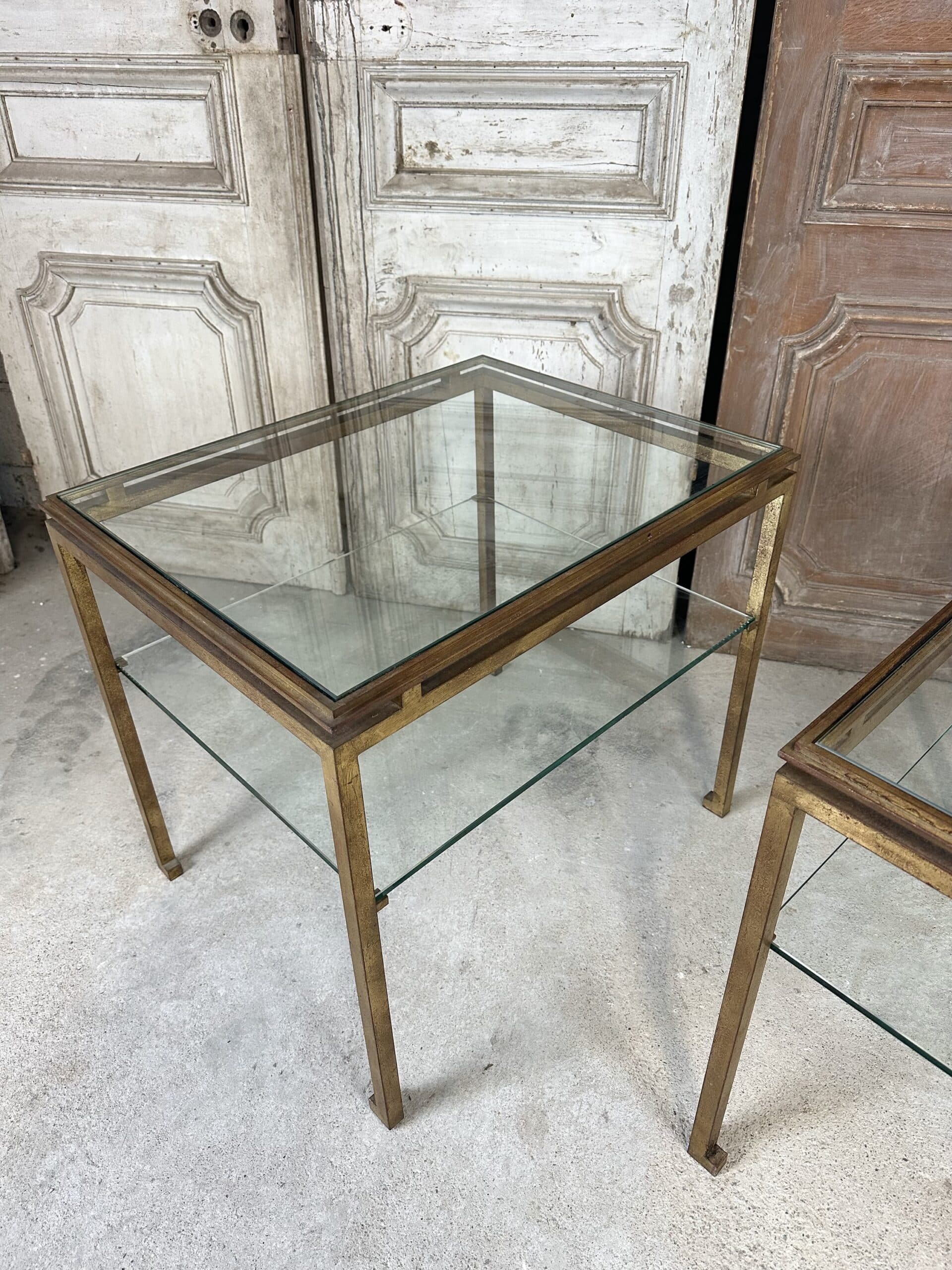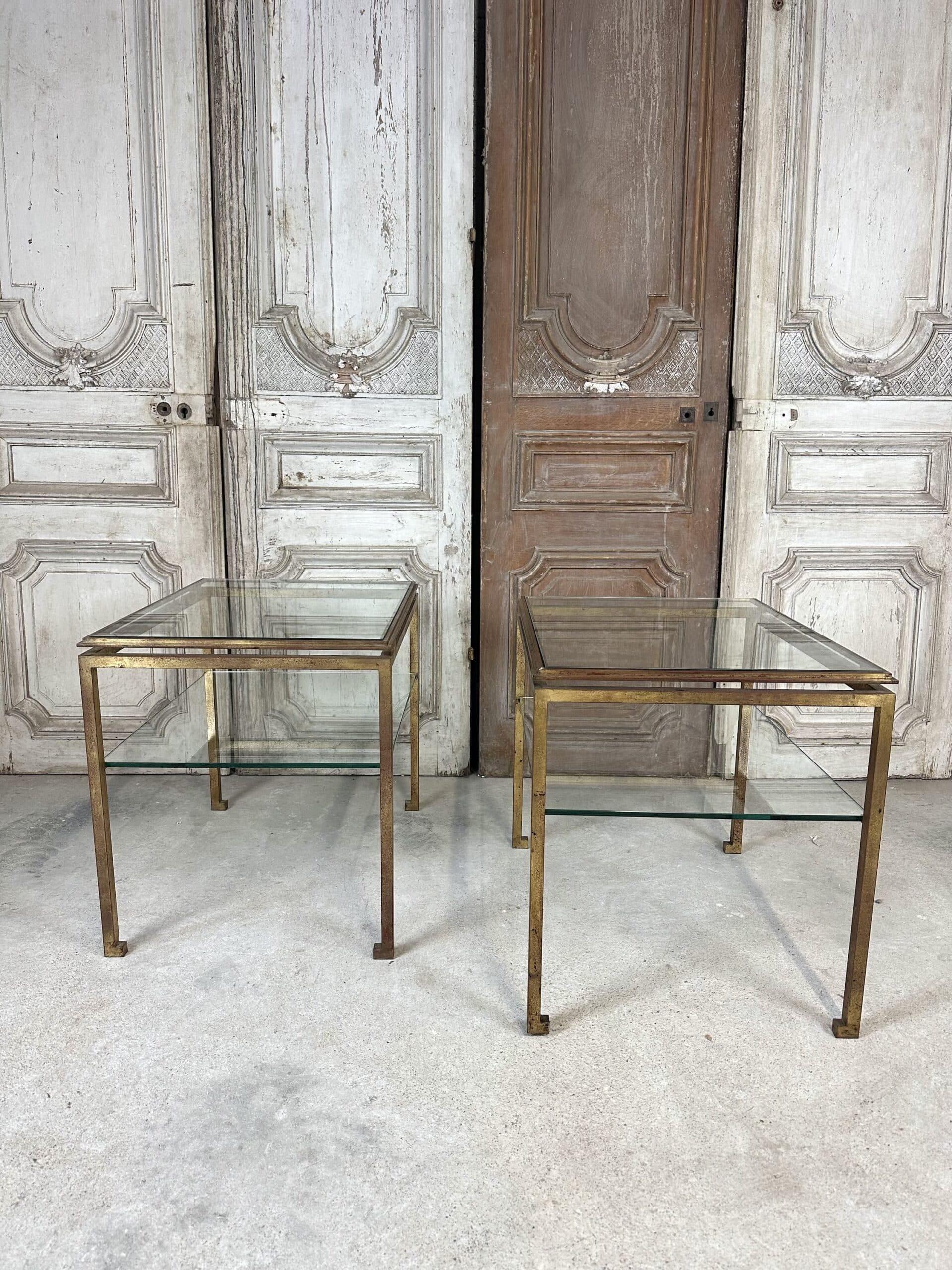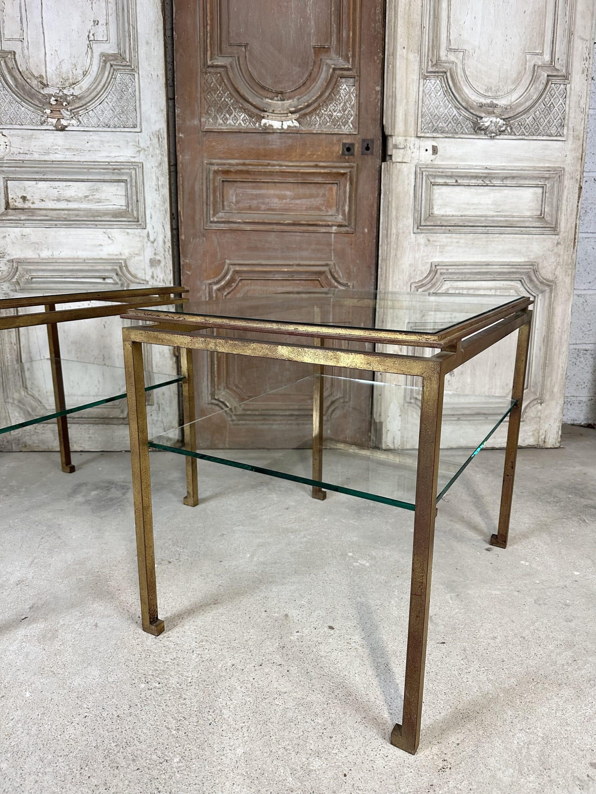 Paire de tables en fer battu doré attribuée à la Maison RAMSAY époque 20e siècle. Double plateau en verre transparent. Modèle dit « étrier » avec les pieds à angle droit.