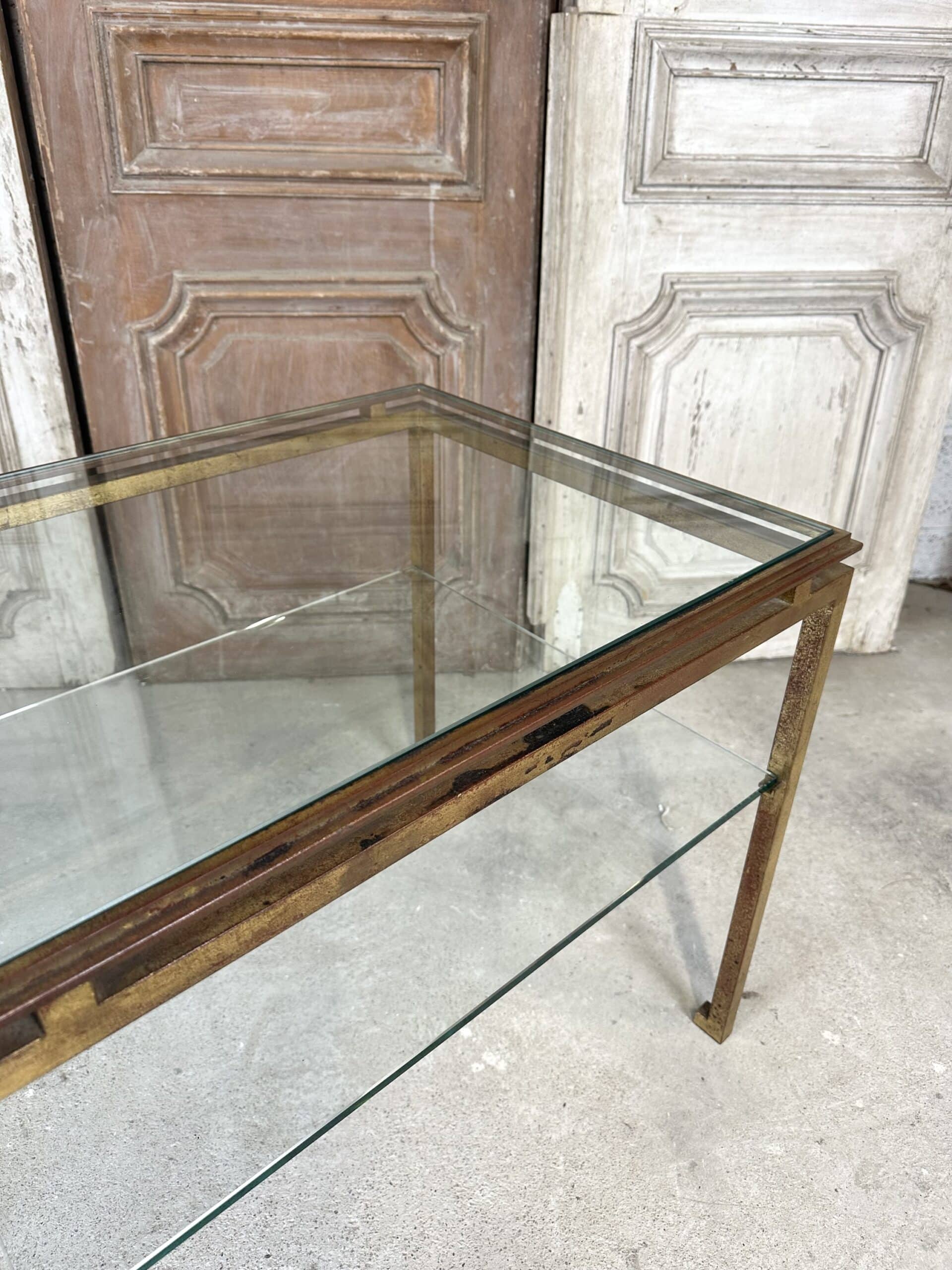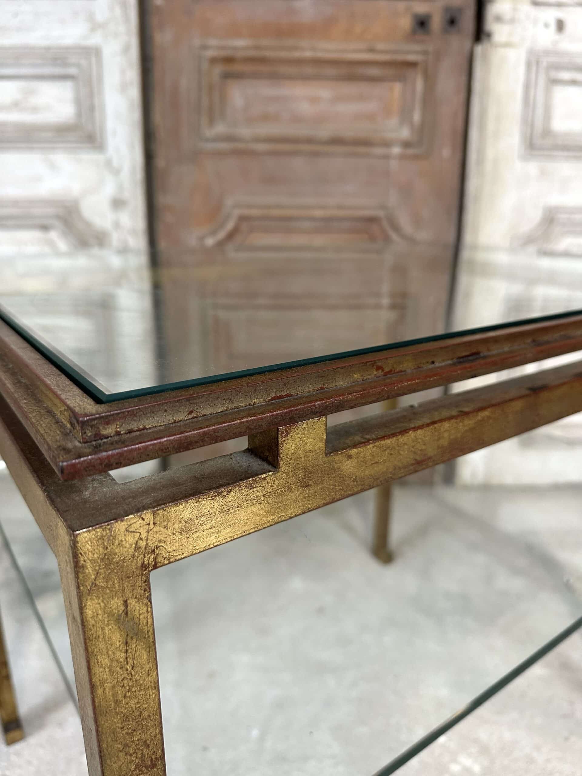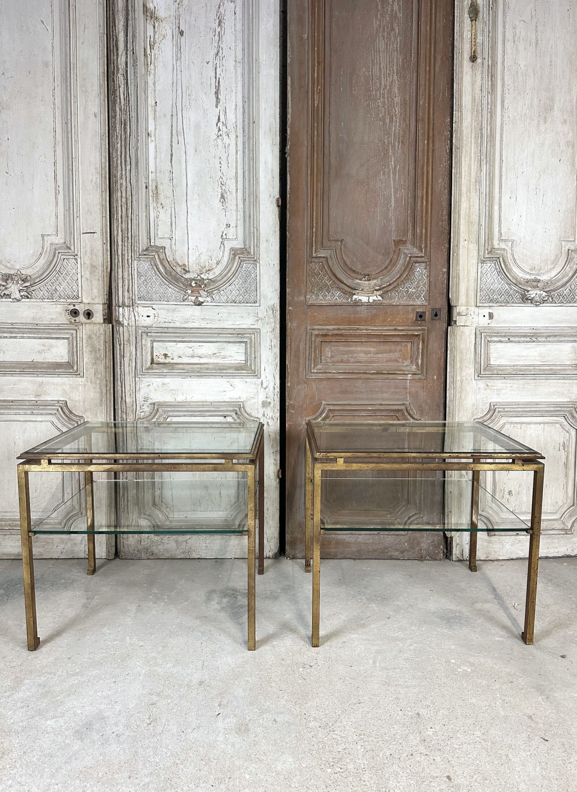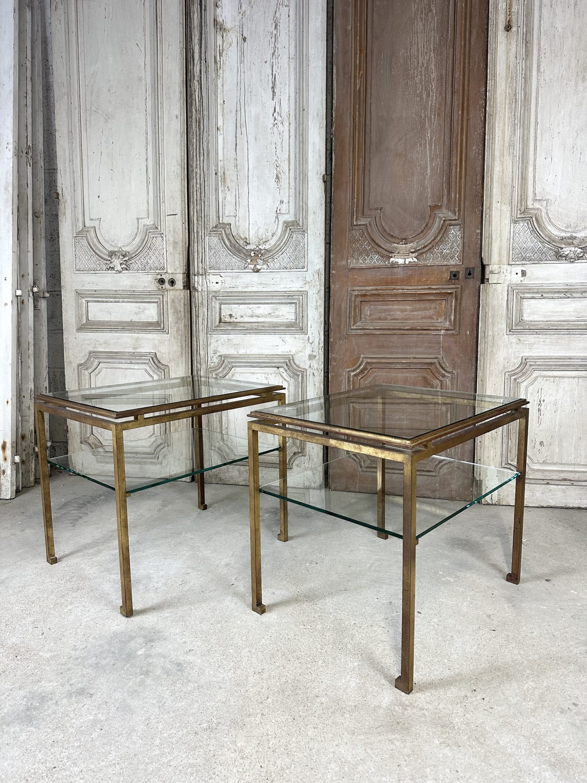 Paire de tables en fer battu doré attribuée à la Maison RAMSAY époque 20e siècle. Double plateau en verre transparent. Modèle dit « étrier » avec les pieds à angle droit.