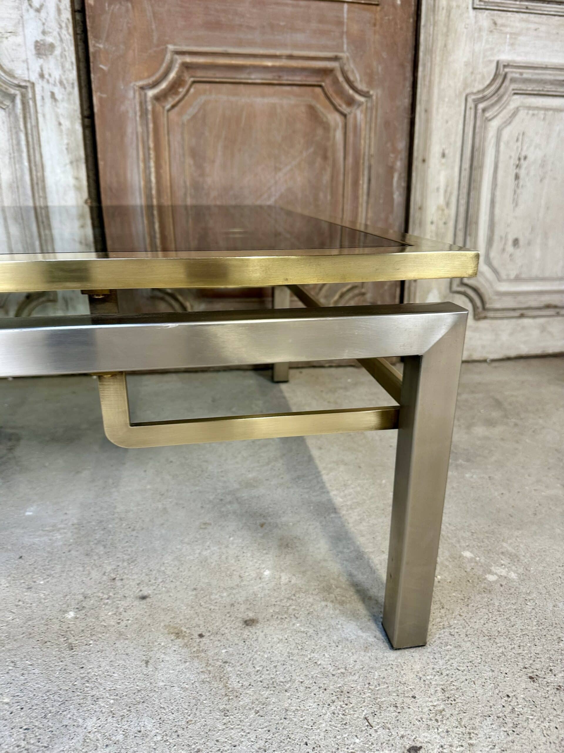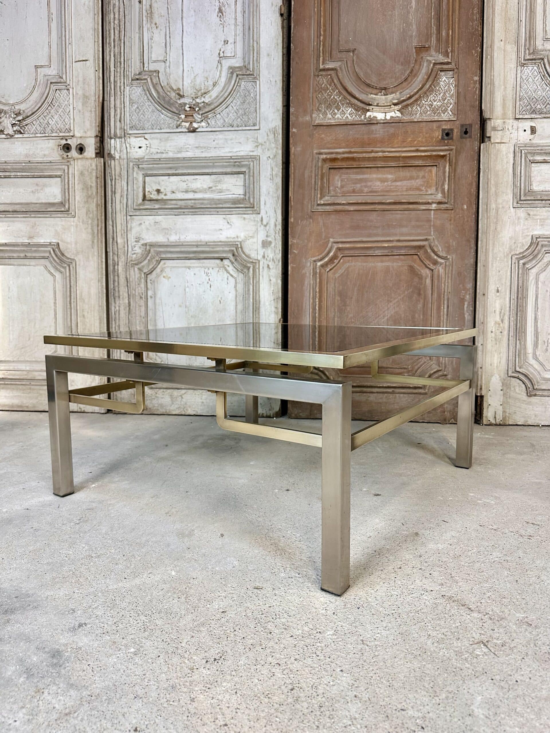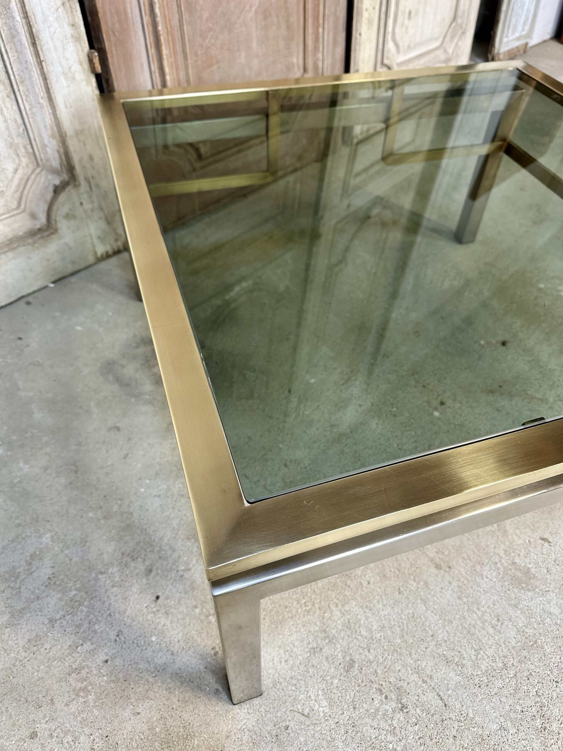 Petite table basse de forme carrée des années 70, attribuée à Guy LEFÈVRE pour Maison JANSEN. La structure est à double patine laiton et acier. Le plateau en verre à une teinte bleue nuit.