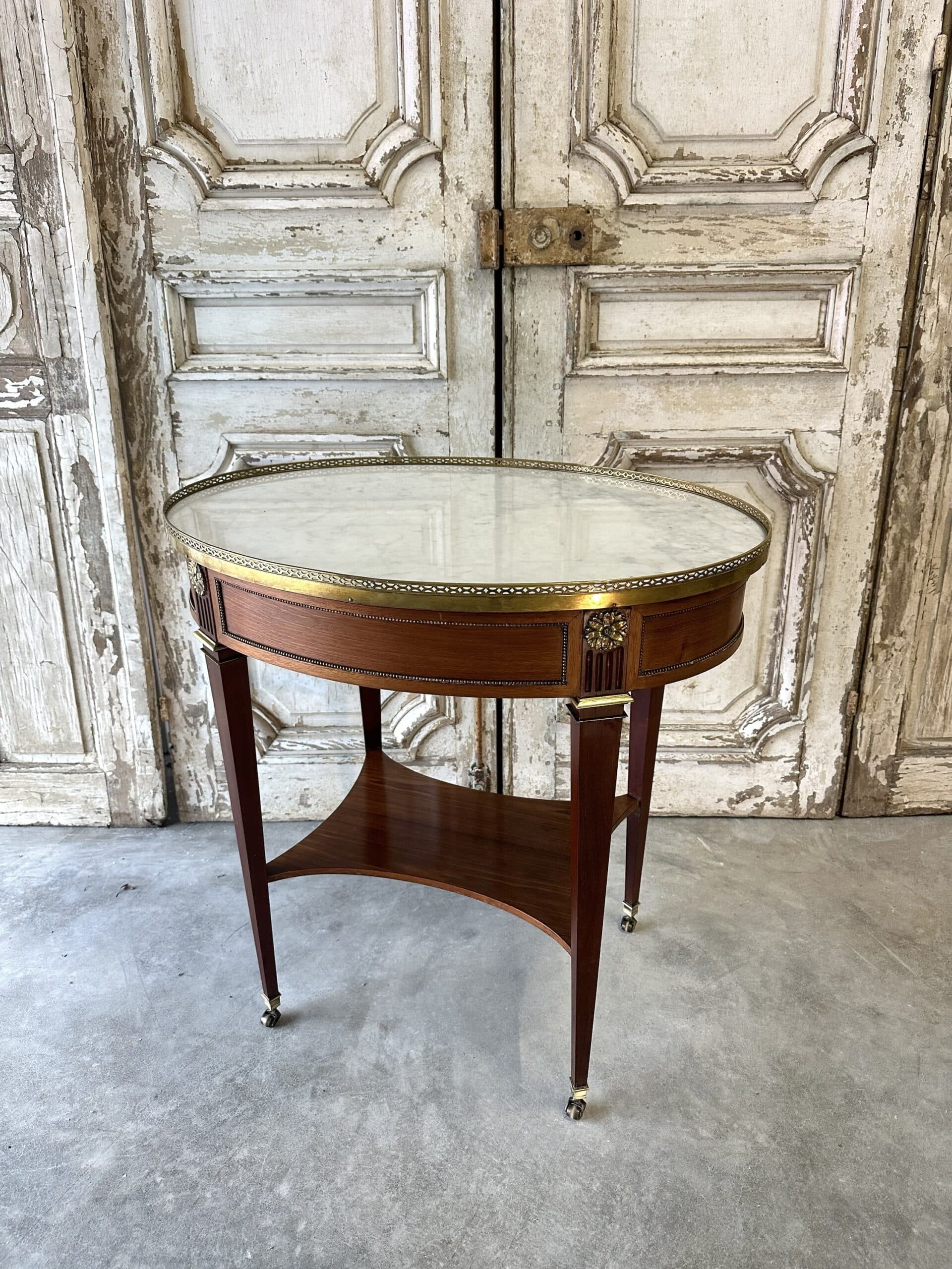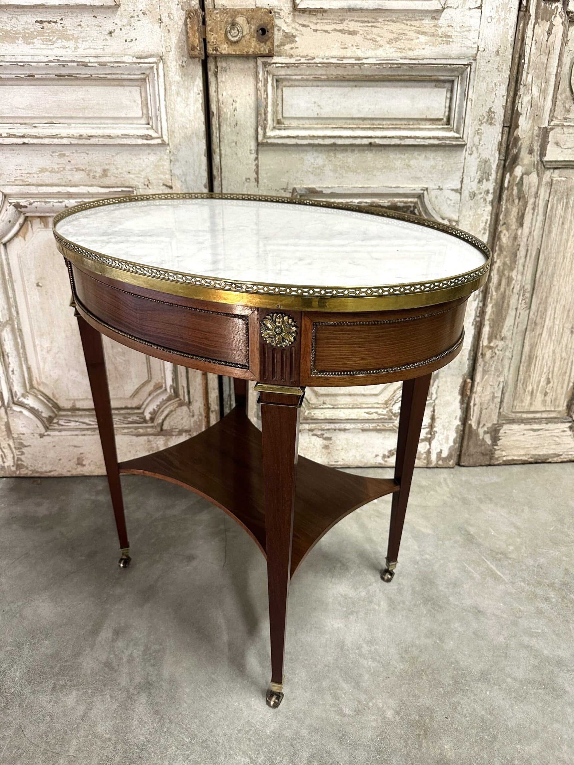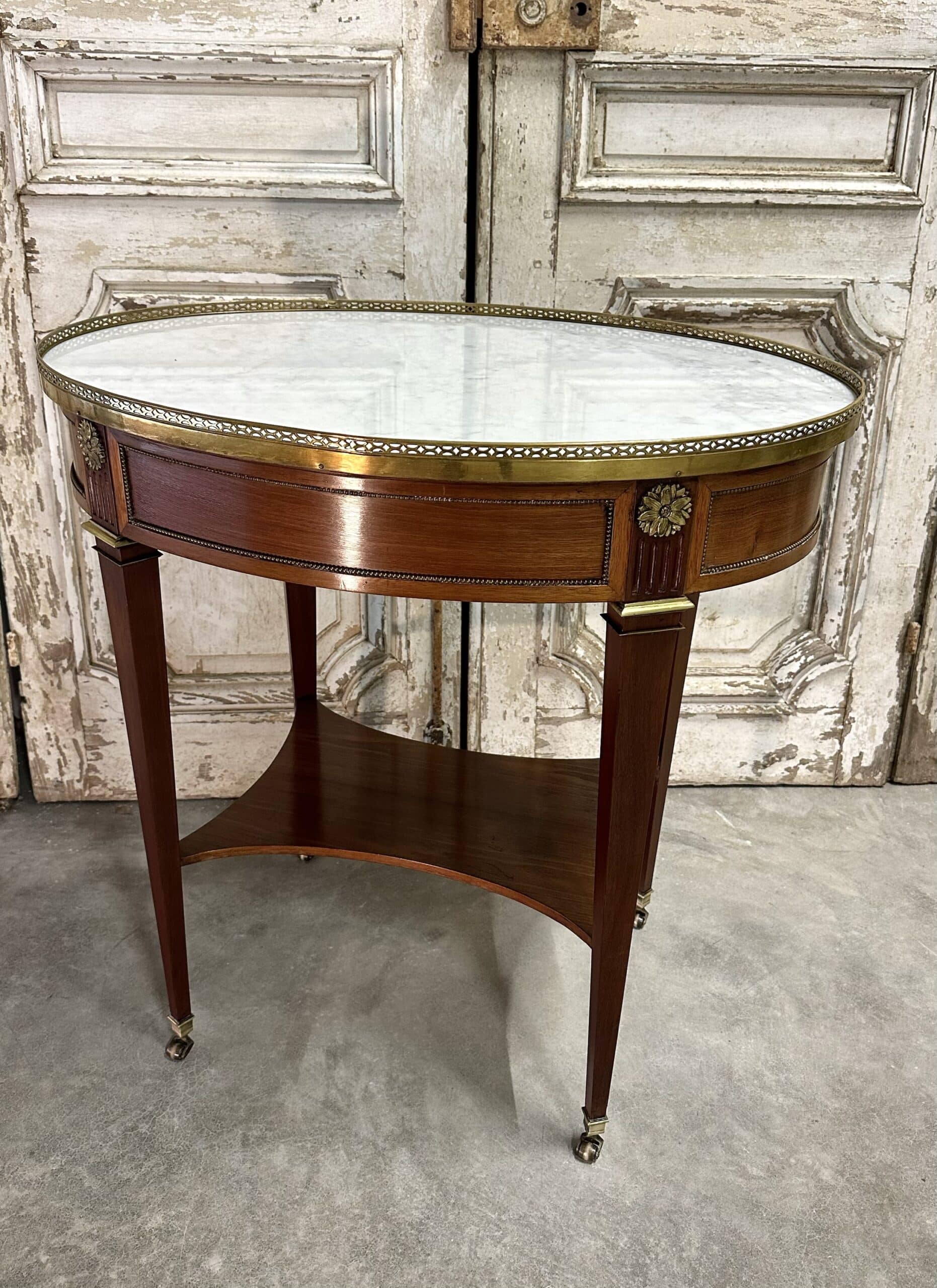 Petite table de salon en acajou et placage d’acajou de style Directoire époque 1960. Dessus en marbre blanc de carrare ceint d’une galerie ajourée en bronze. Ornements en ceinture de rosaces et perles. Pieds gaines joint par une tablette, sabots en bronze à roulettes.