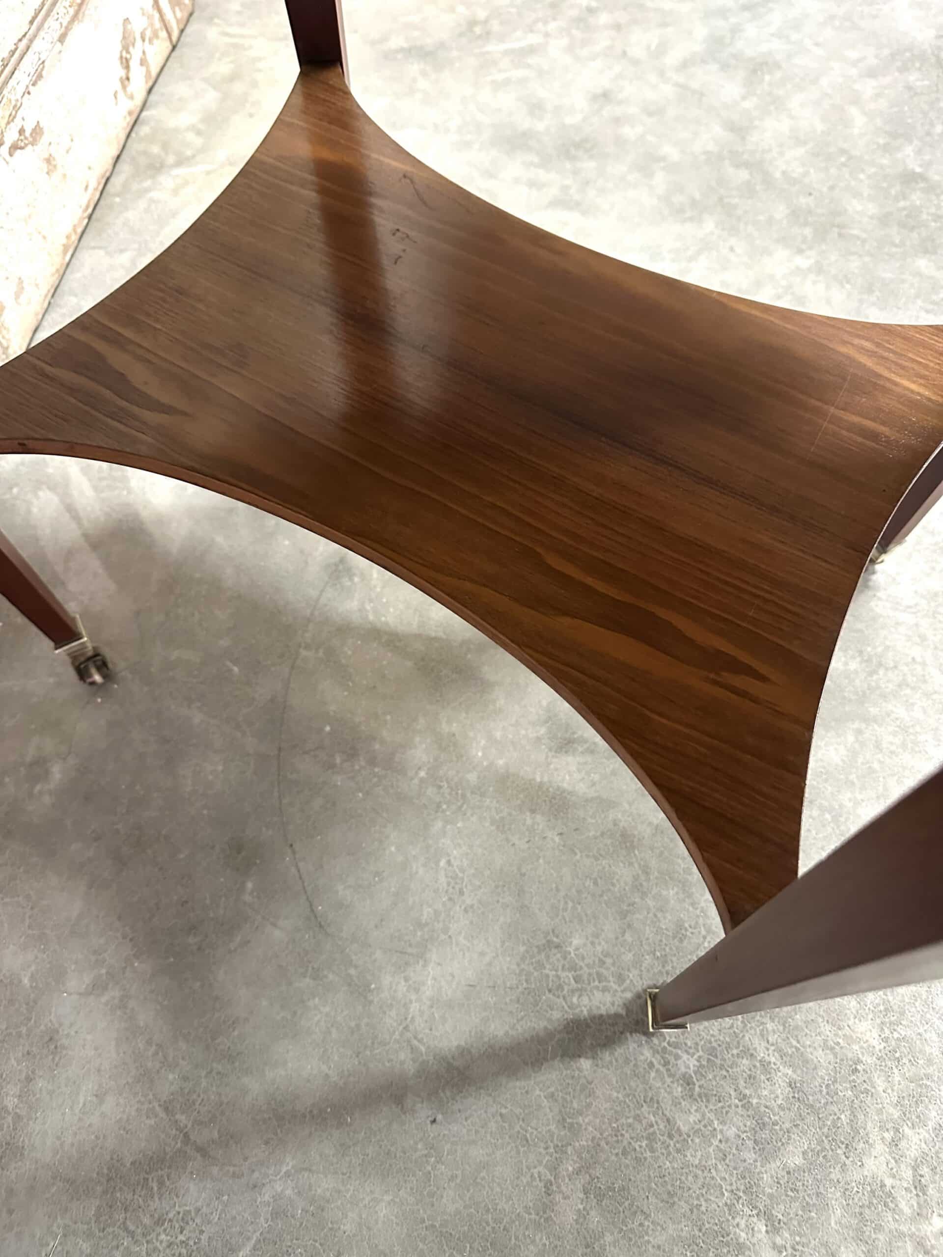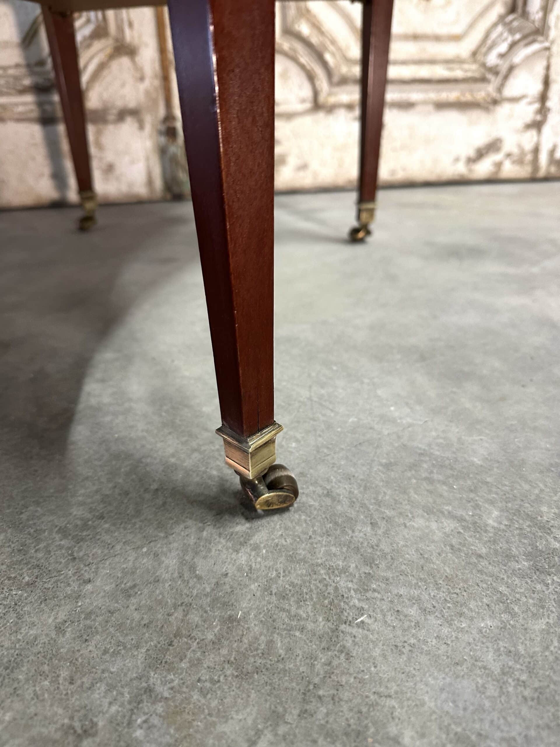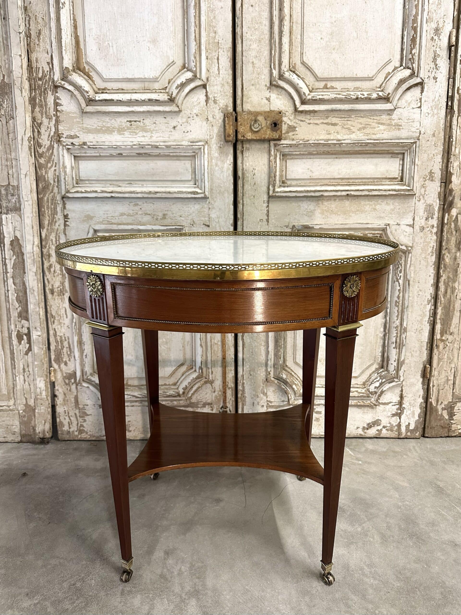 Petite table de salon en acajou et placage d’acajou de style Directoire époque 1960. Dessus en marbre blanc de carrare ceint d’une galerie ajourée en bronze. Ornements en ceinture de rosaces et perles. Pieds gaines joint par une tablette, sabots en bronze à roulettes.