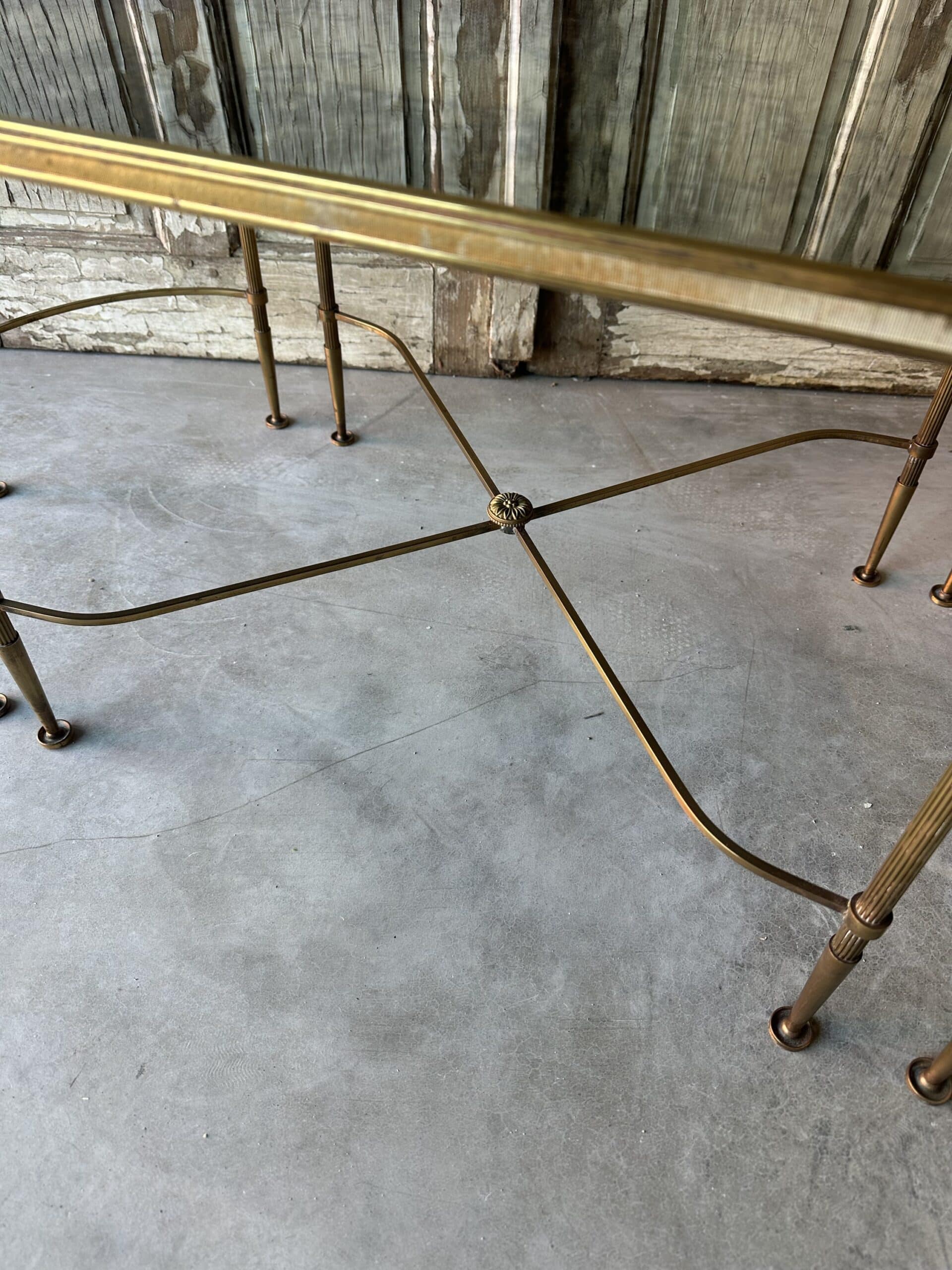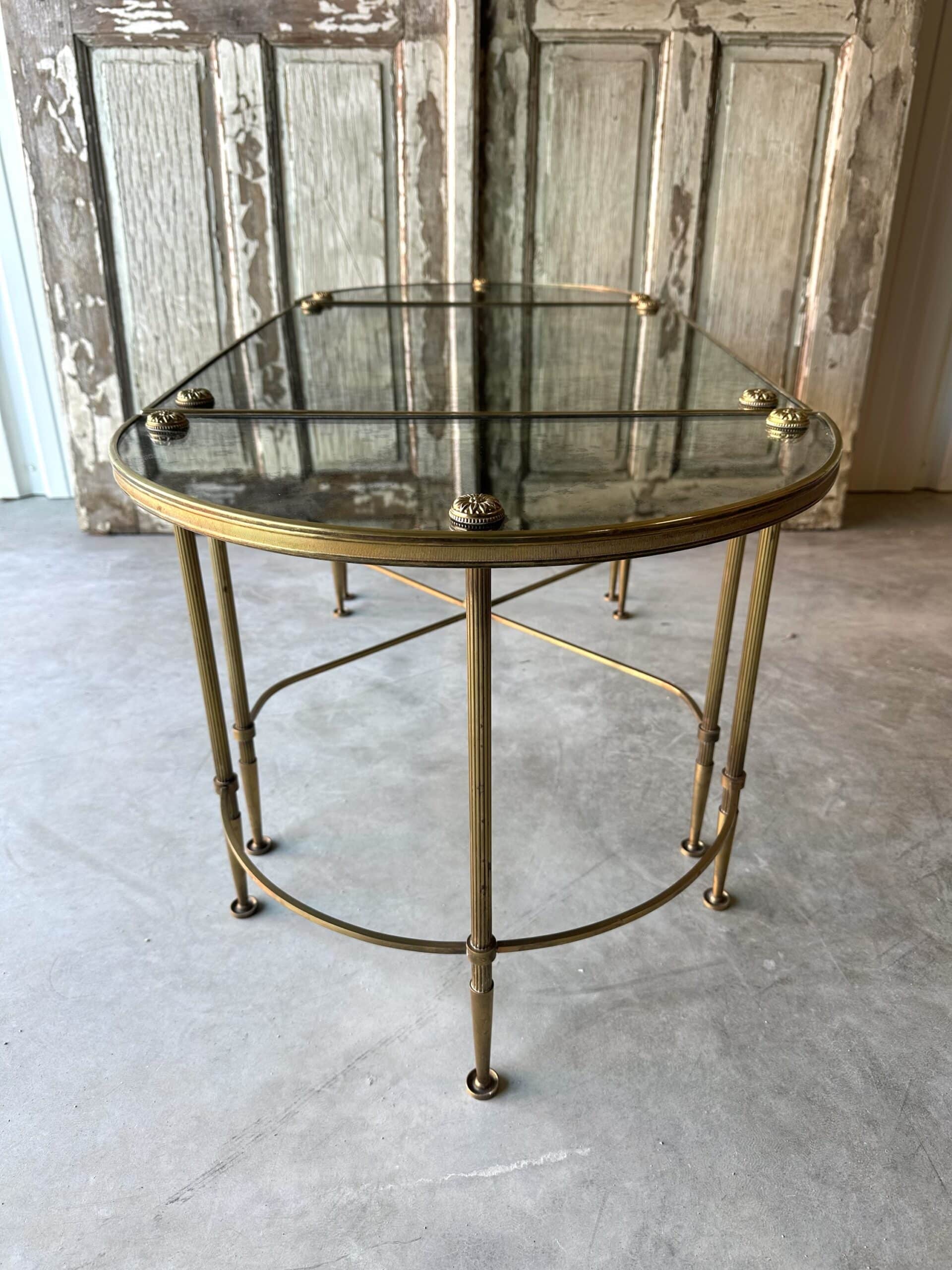 Le piètement cannelé repose sur une entretoise basse décorative, typique du style néoclassique de Baguès. Les plateaux sont maintenus par des cabochons en bronze ciselé.
