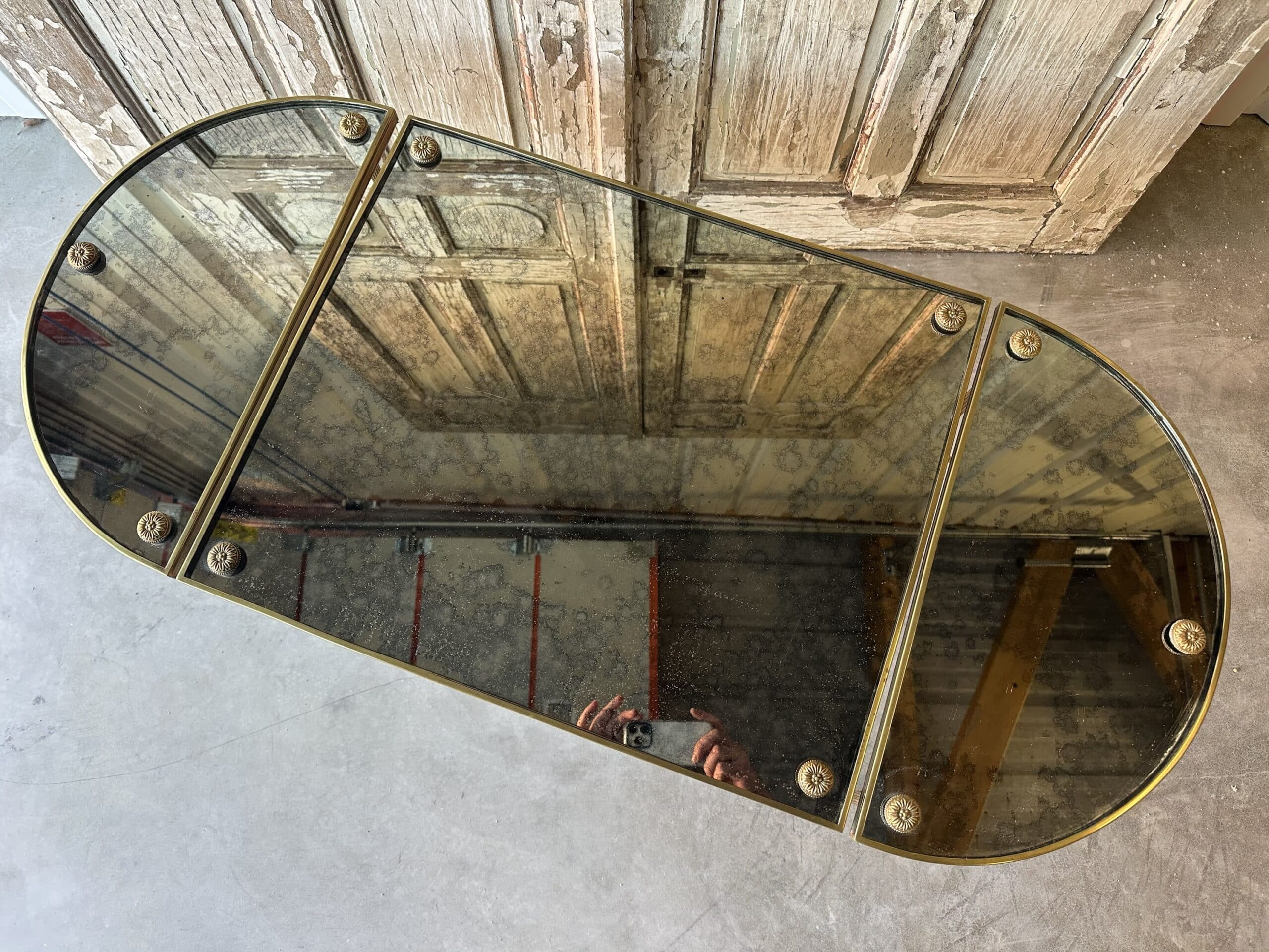 Élégante table basse bronze et laiton doré attribuée à la Maison Baguès. Elle présente une structure raffinée composée de trois plateaux effet miroir oxydé, avec un plateau central rectangulaire flanqué de deux plateaux en demi-lune.